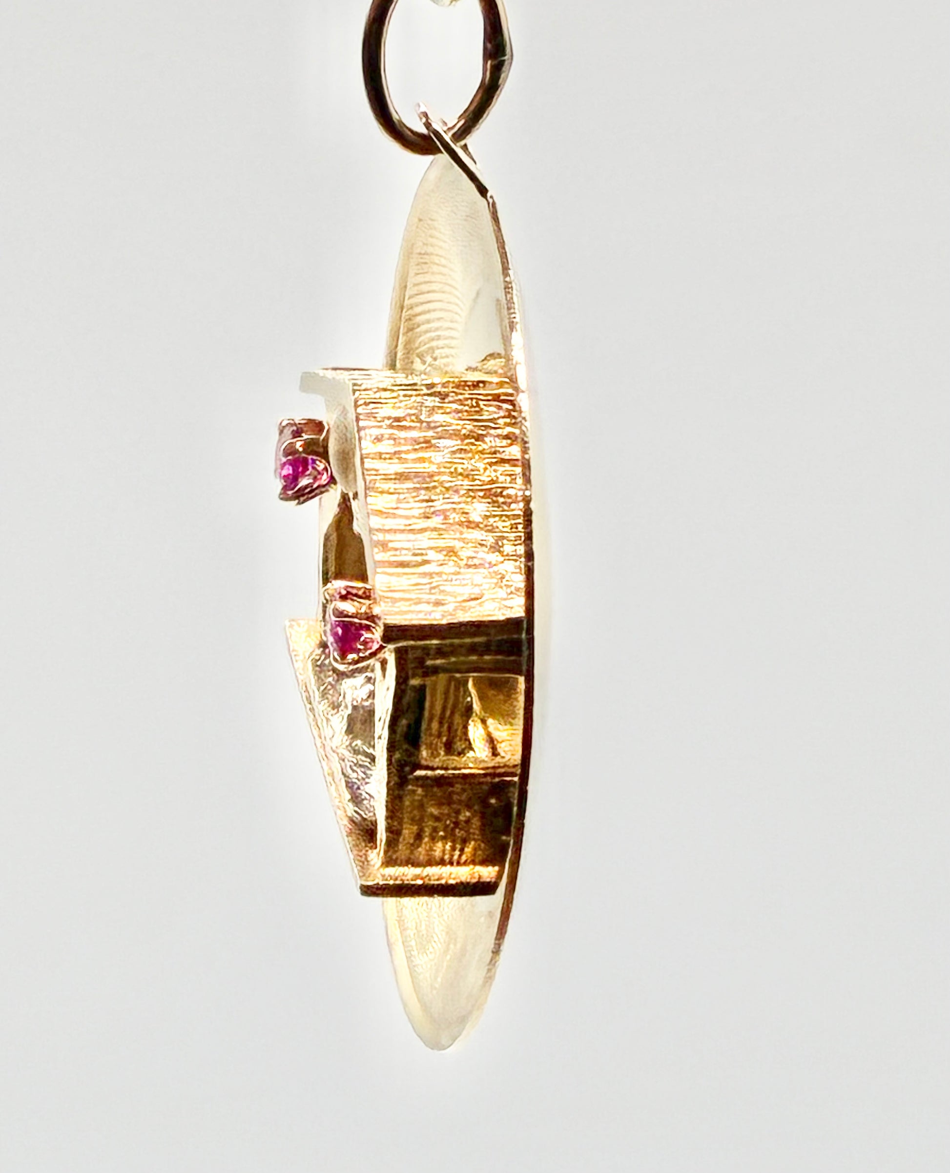 Festive and finely detailed. This round solid-gold charm features a raised Nativity scene inside a textured medallion engraved MERRY CHRISTMAS, accented by tiny star cutouts and two small pink stones. Finished with a secure jump ring—ready to add to a chain or charm bracelet.