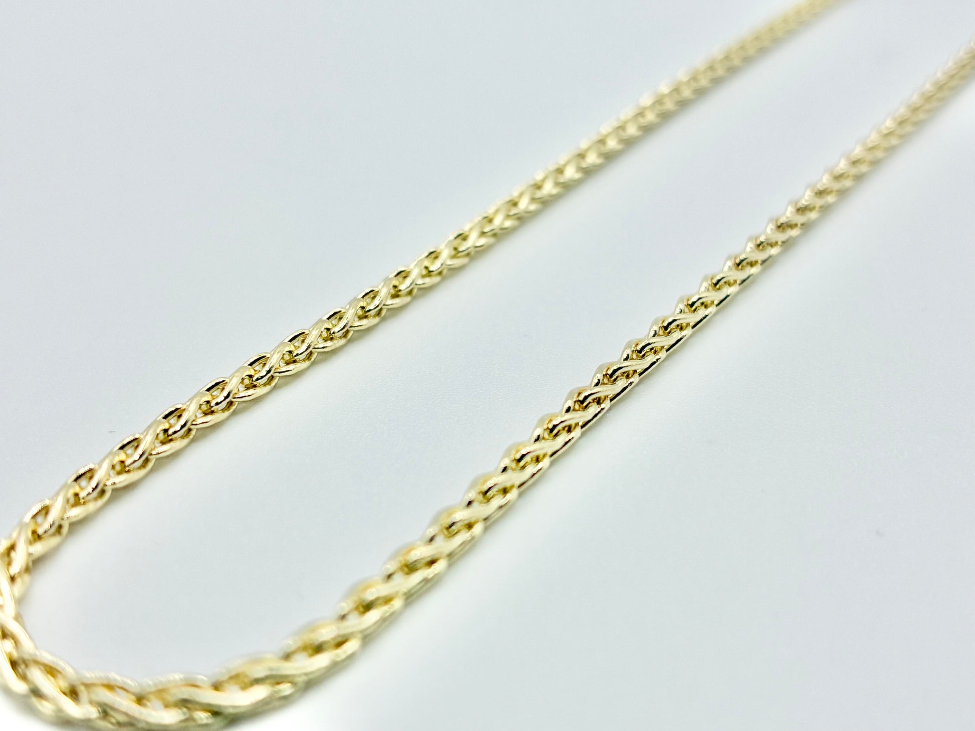 Refined sparkle for every day. This 20-inch chain features a supple wheat (spiga) link that drapes smoothly and catches the light from every angle. Finished with a secure lobster clasp and a warm, high-polish glow—great solo, layered, or paired with a favorite pendant.