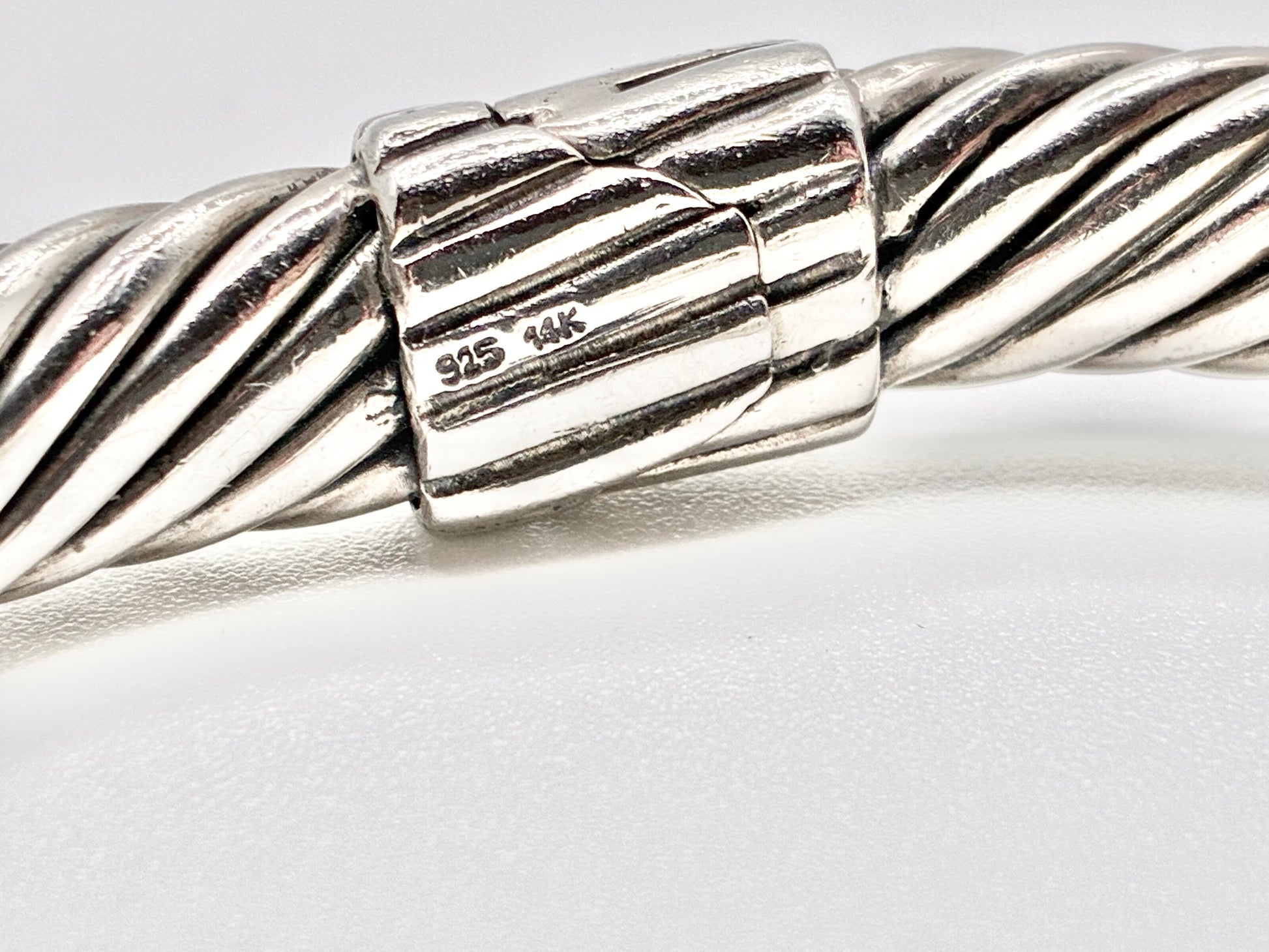 Style: Twisted cable open cuff; gemstone finials with channel details