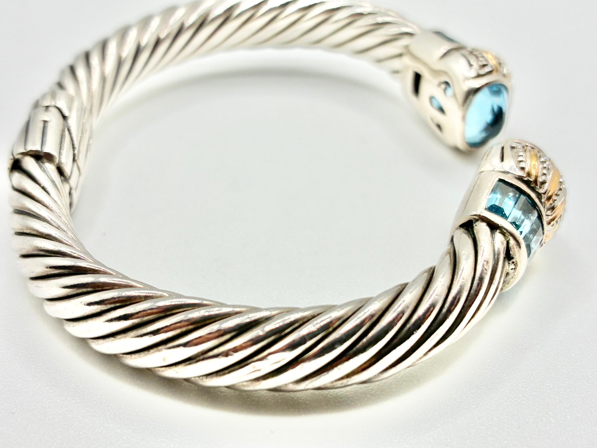 Bold and elegant, this substantial cable cuff pairs sterling silver with 14K yellow-gold accents. Each end is finished with a faceted round blue stone framed by baguette-style blue channels and ribbed 14K bands with pavé-style detailing.