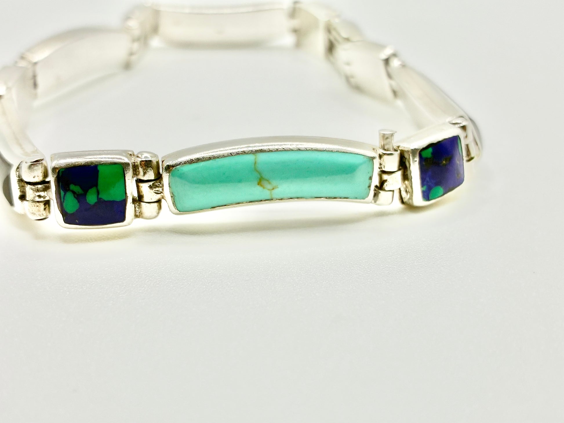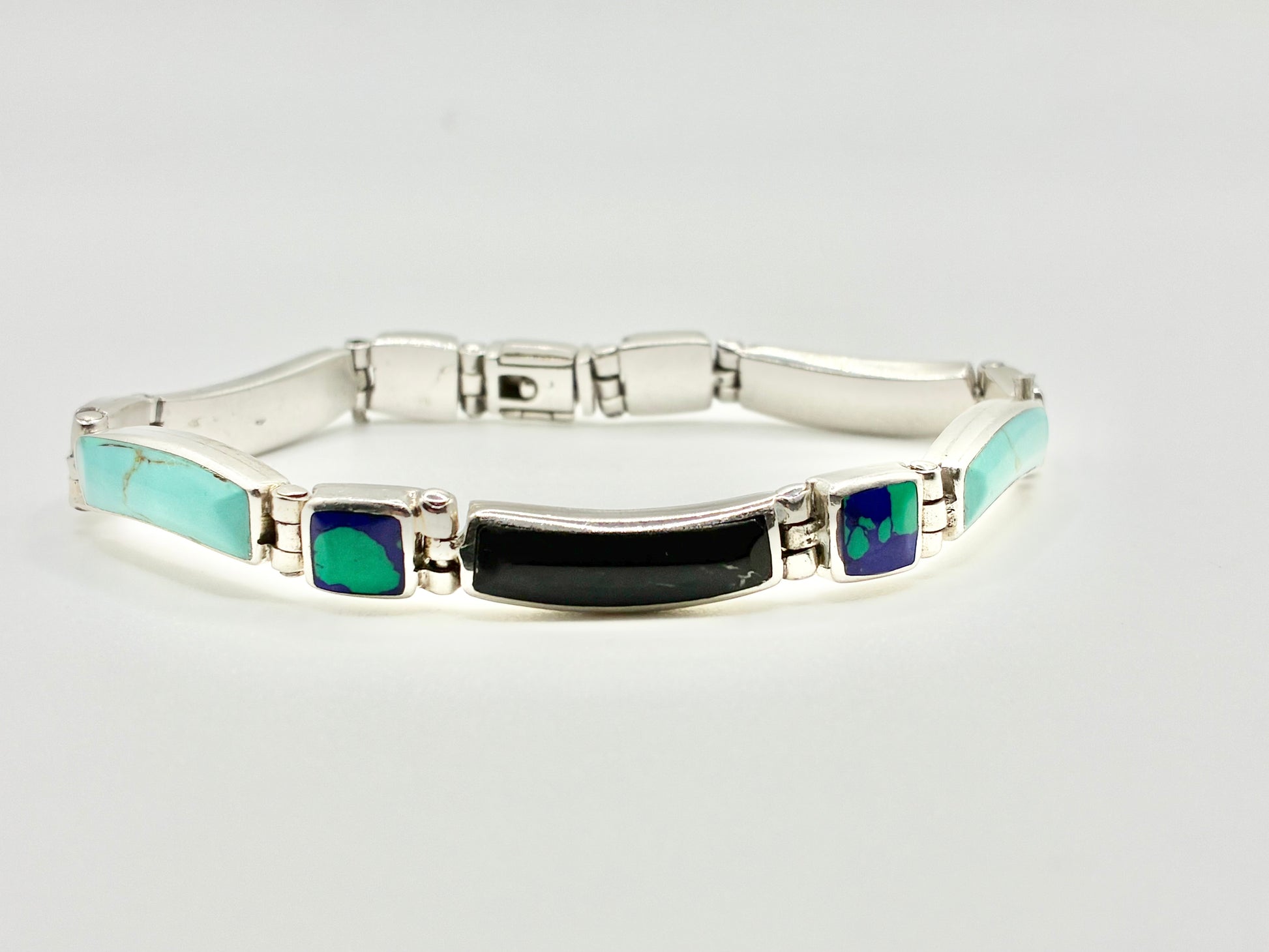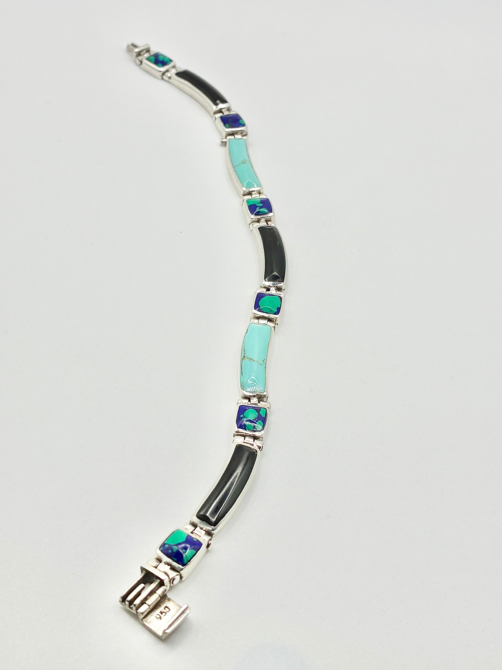 Striking link bracelet crafted in high-purity 950 silver, featuring a repeating pattern of inlaid stones: glossy black curved bars, sky-blue turquoise panels, and blue-green azurite/malachite squares. Smoothly articulated links give a comfortable drape, and a sturdy box clasp secures the piece.