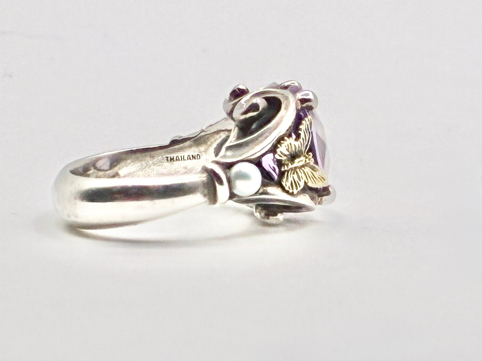 A striking designer ring by Ann King featuring an oval, faceted amethyst set in a bold prong crown. Sculpted butterflies and vine scrolls flank the center stone, highlighted with 18K yellow-gold details and a luminous pearl accent on each shoulder. Solid sterling silver band with Ann King’s signature craftsmanship.