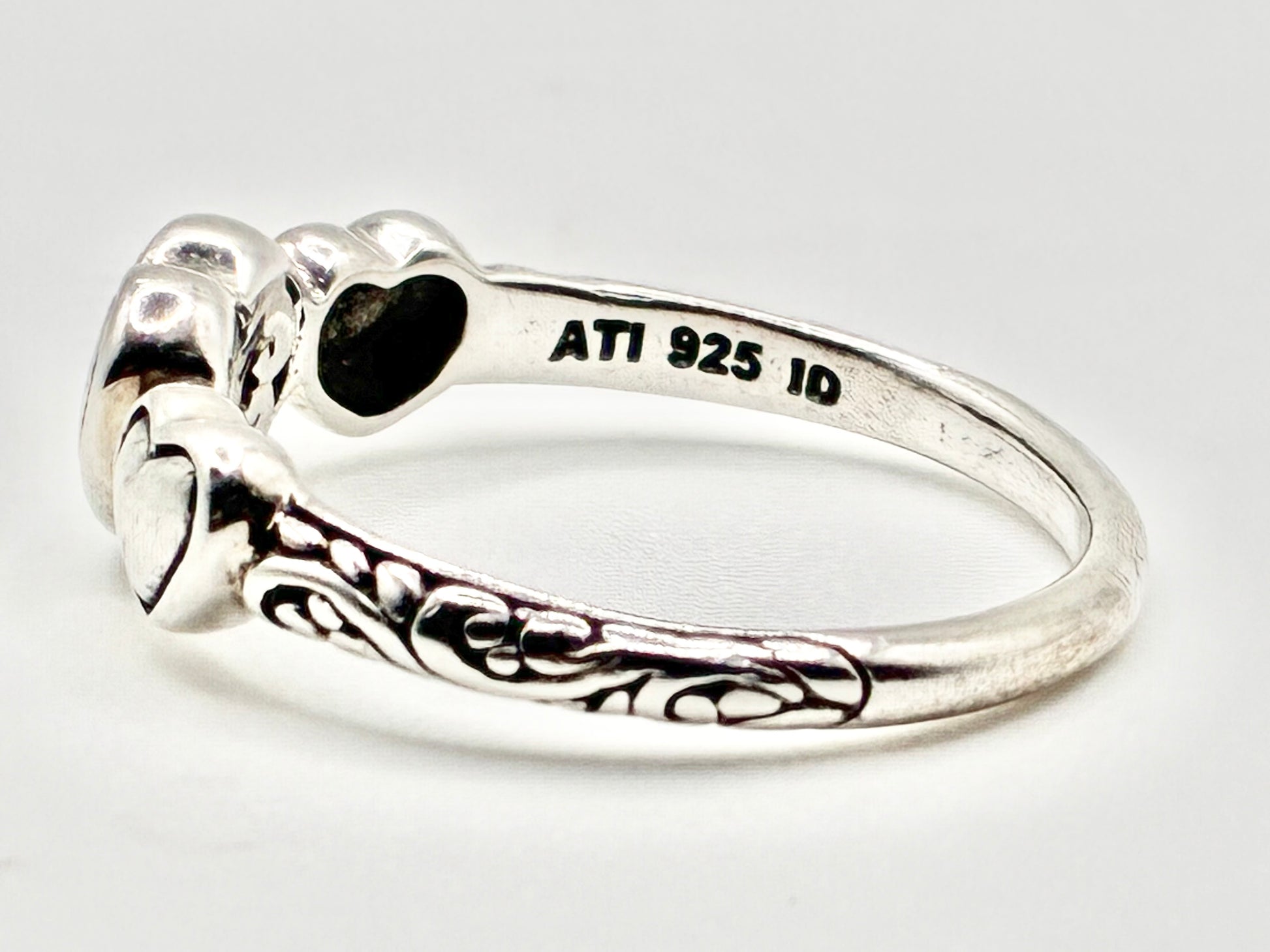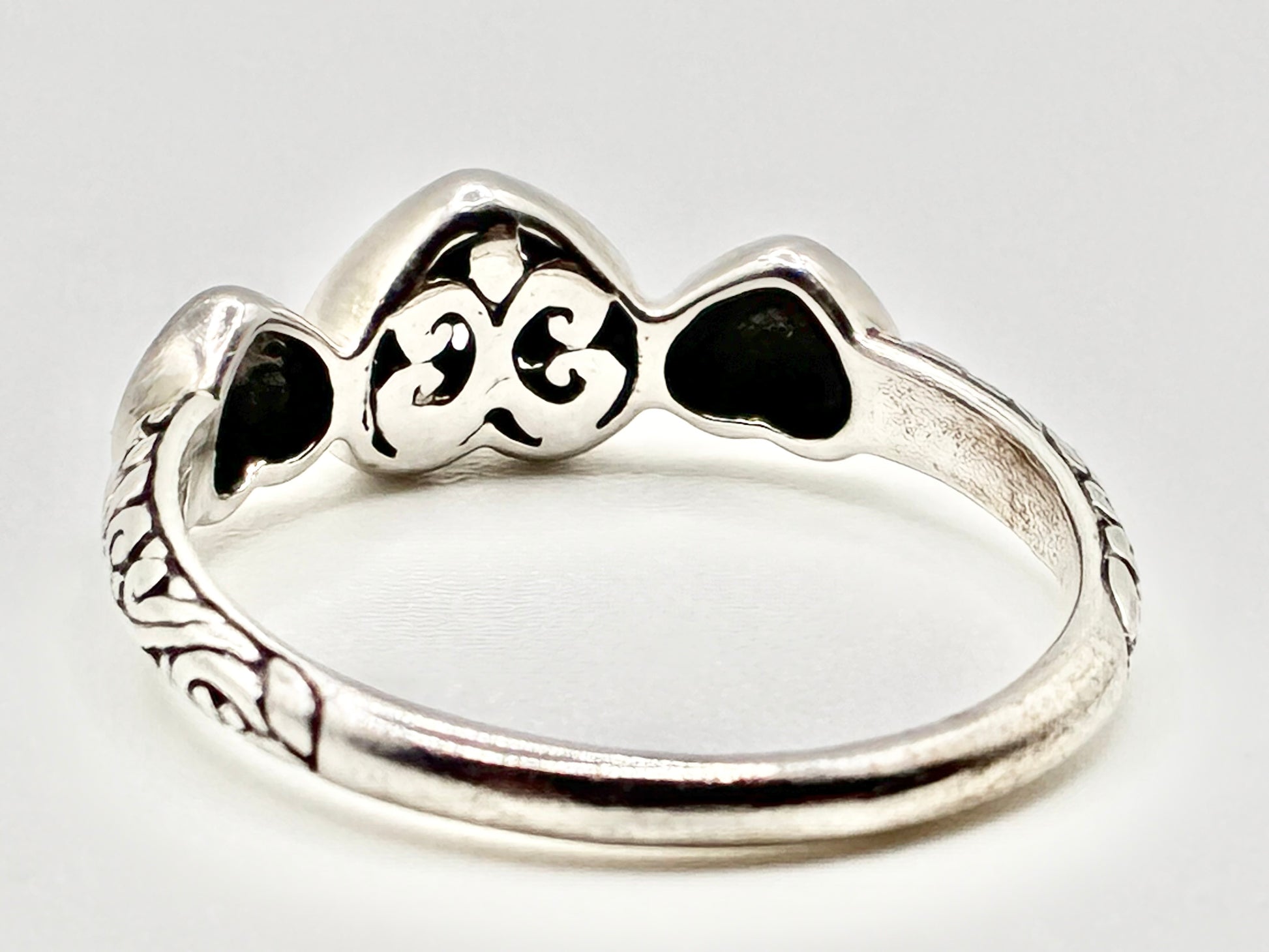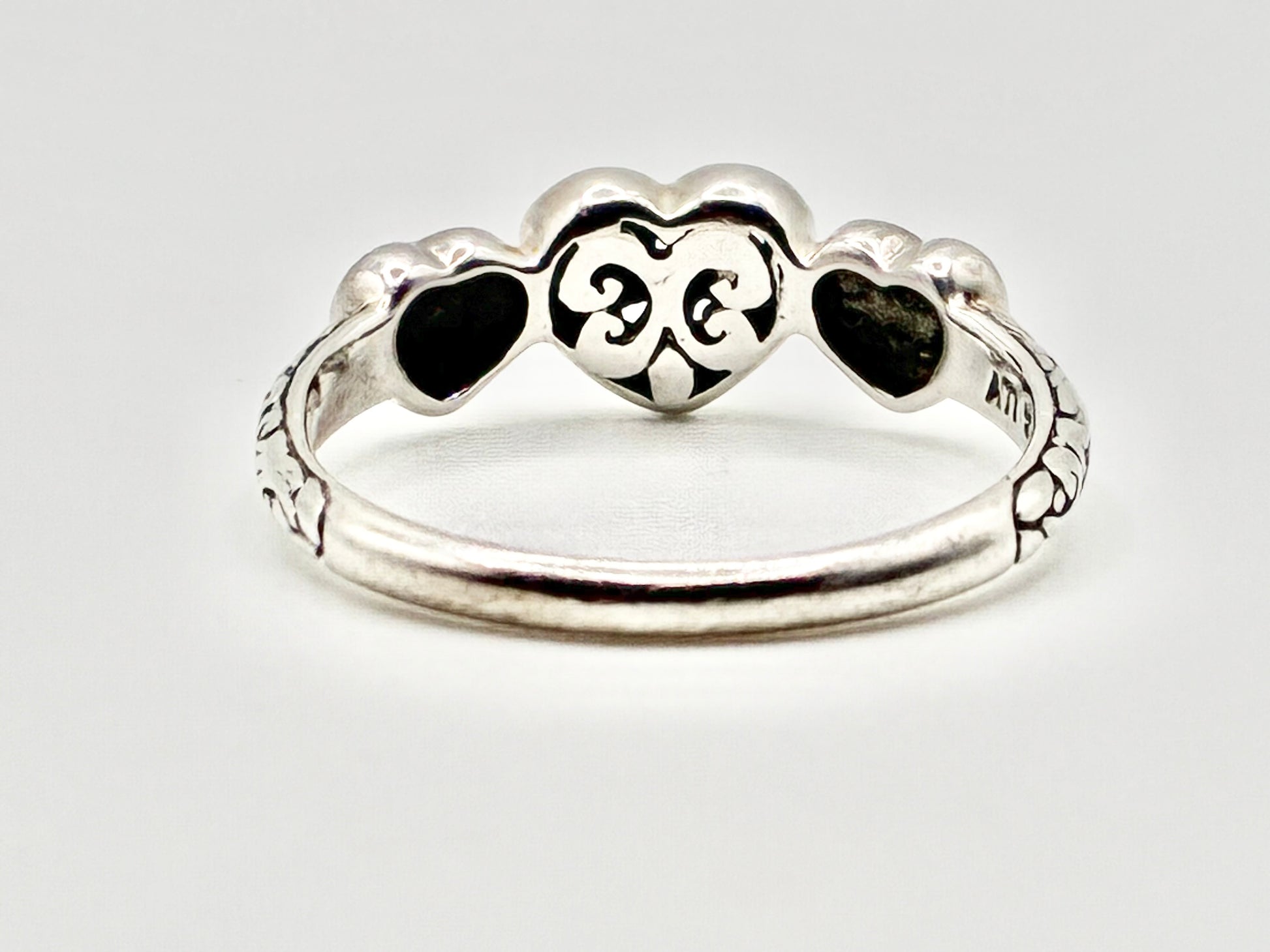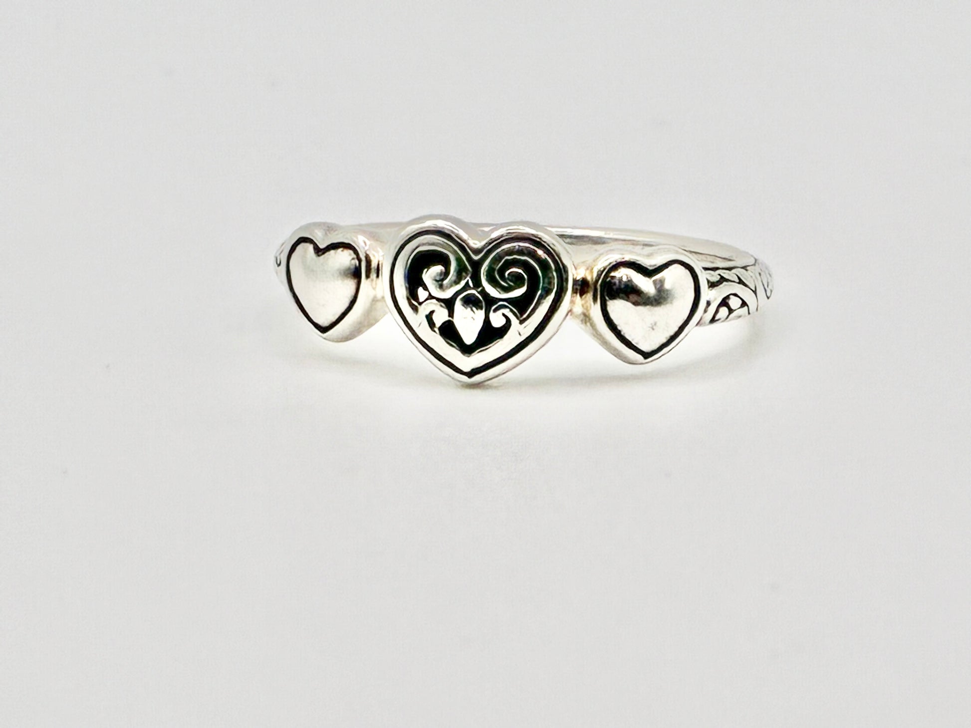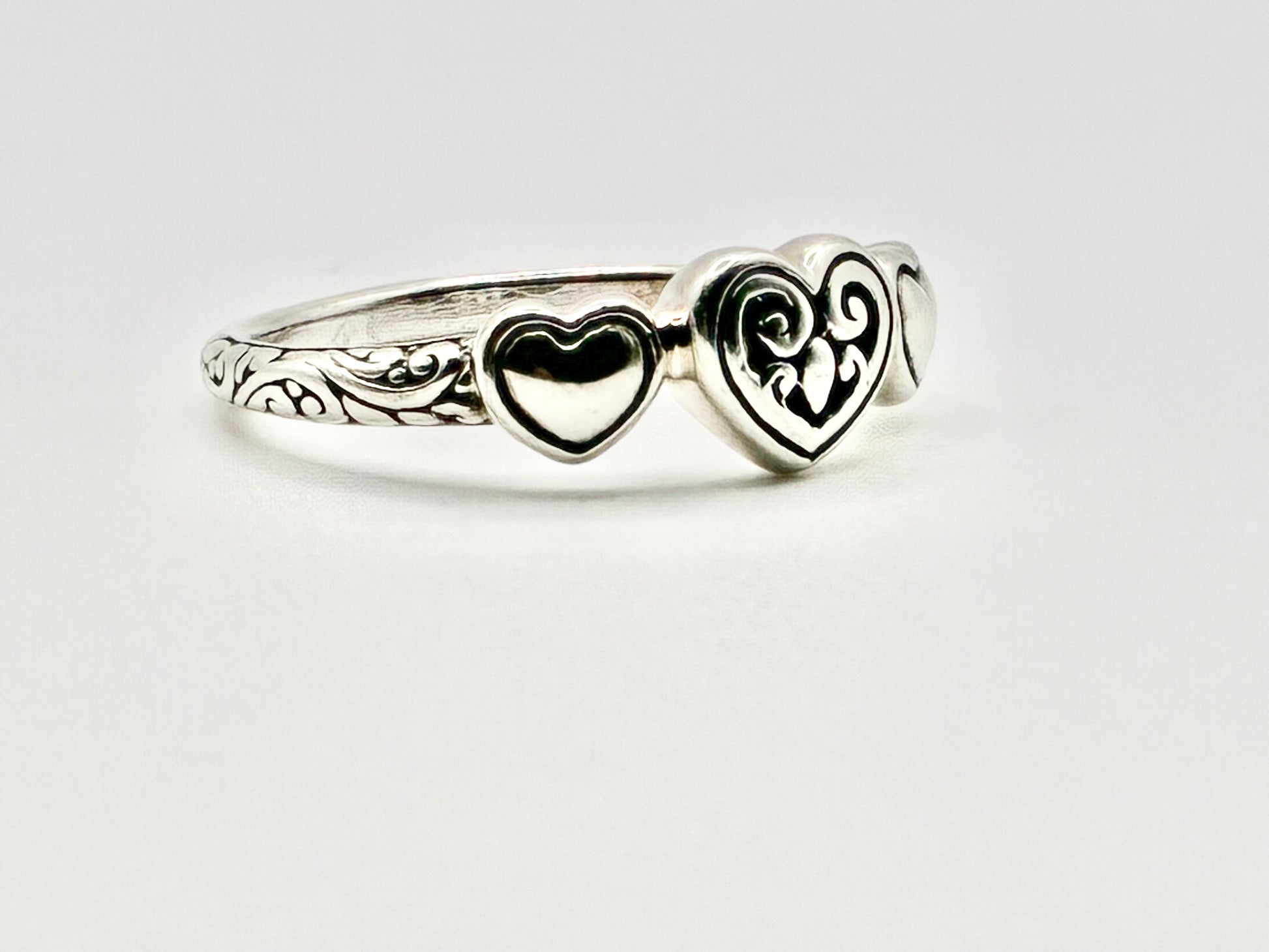 Sweet and sculptural, this sterling ring features a trio of hearts across the top: a center heart with swirling, oxidized scrollwork flanked by two smooth hearts. The shoulders carry matching scroll engravings for a romantic, cohesive look. Finished with a polished, comfort-tapered band.