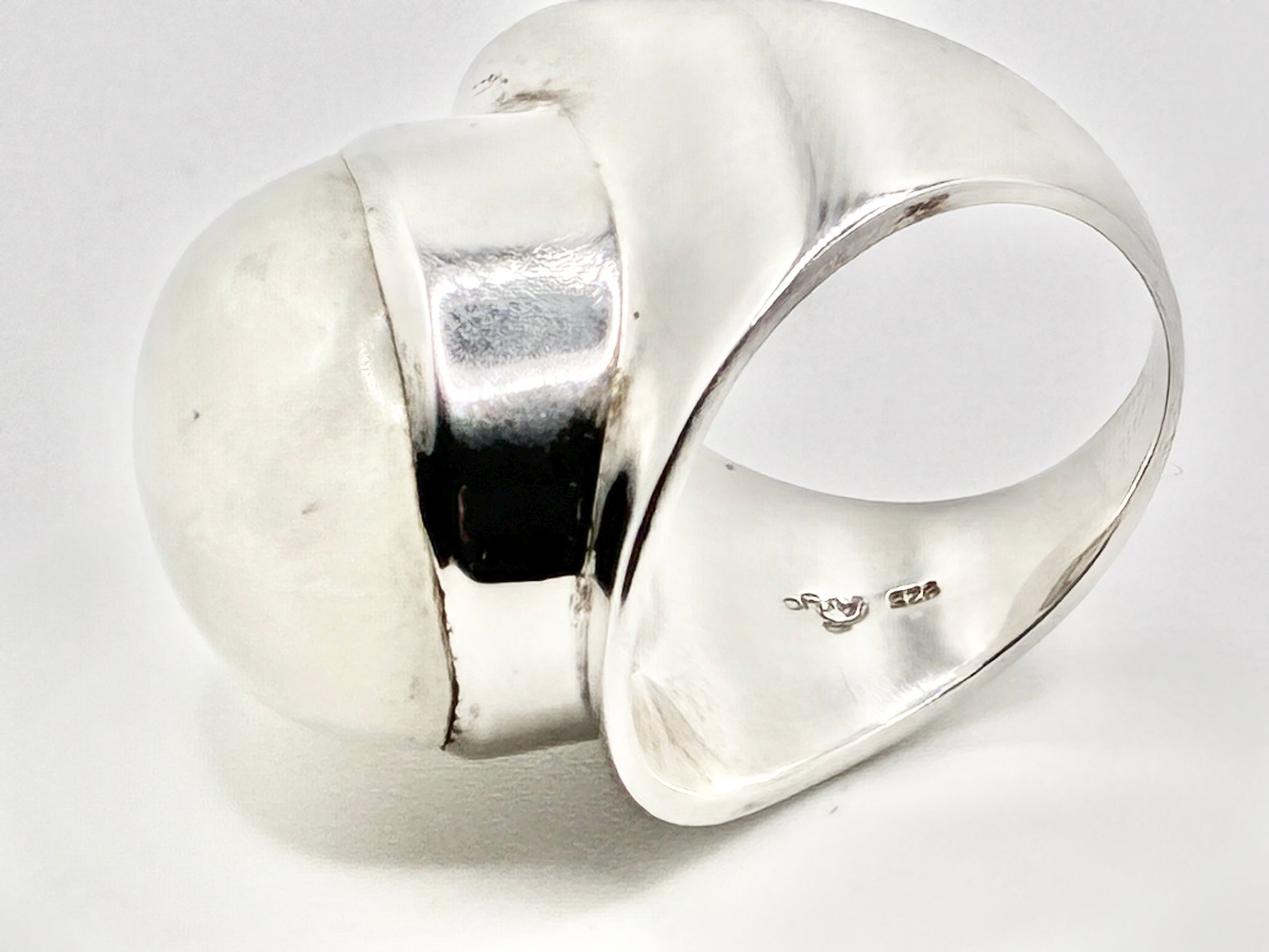 Striking sculptural ring by Arya featuring a large oval cabochon in a sleek, modern swirl setting.