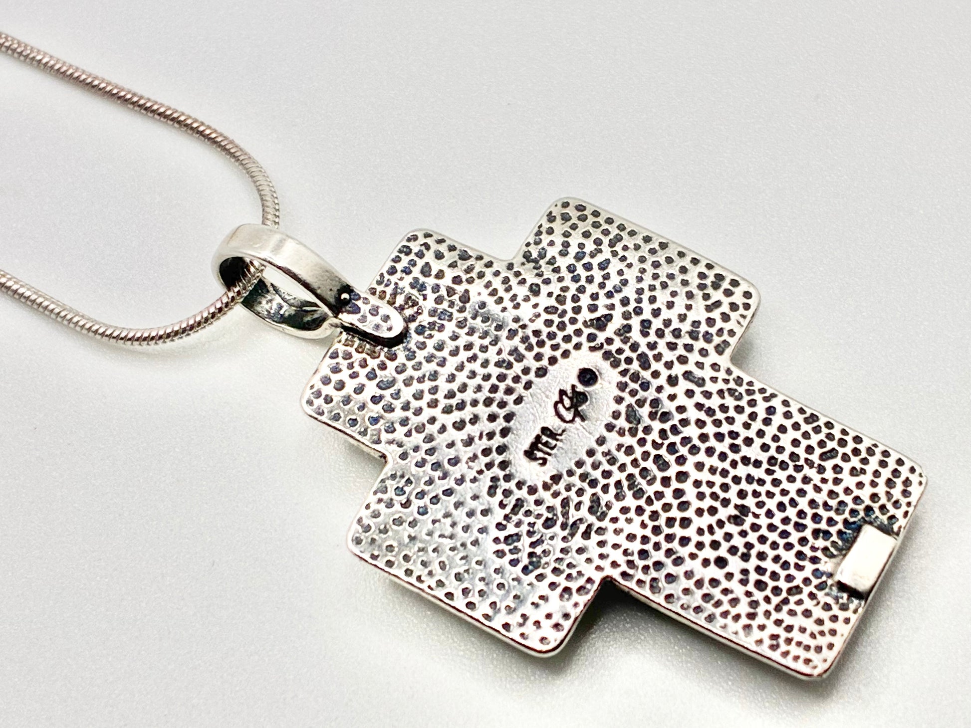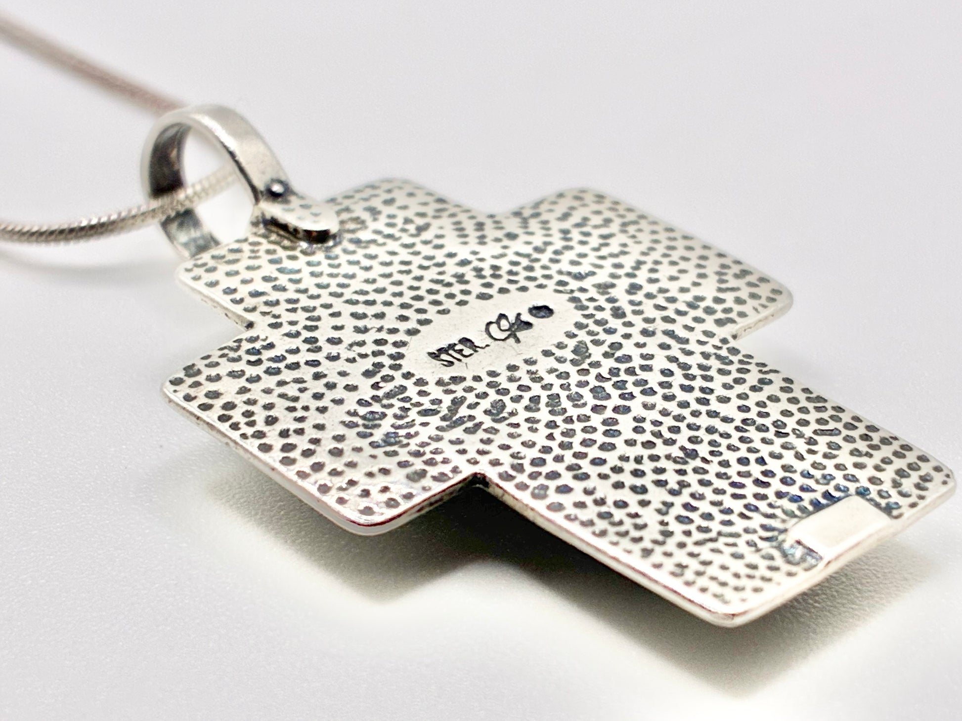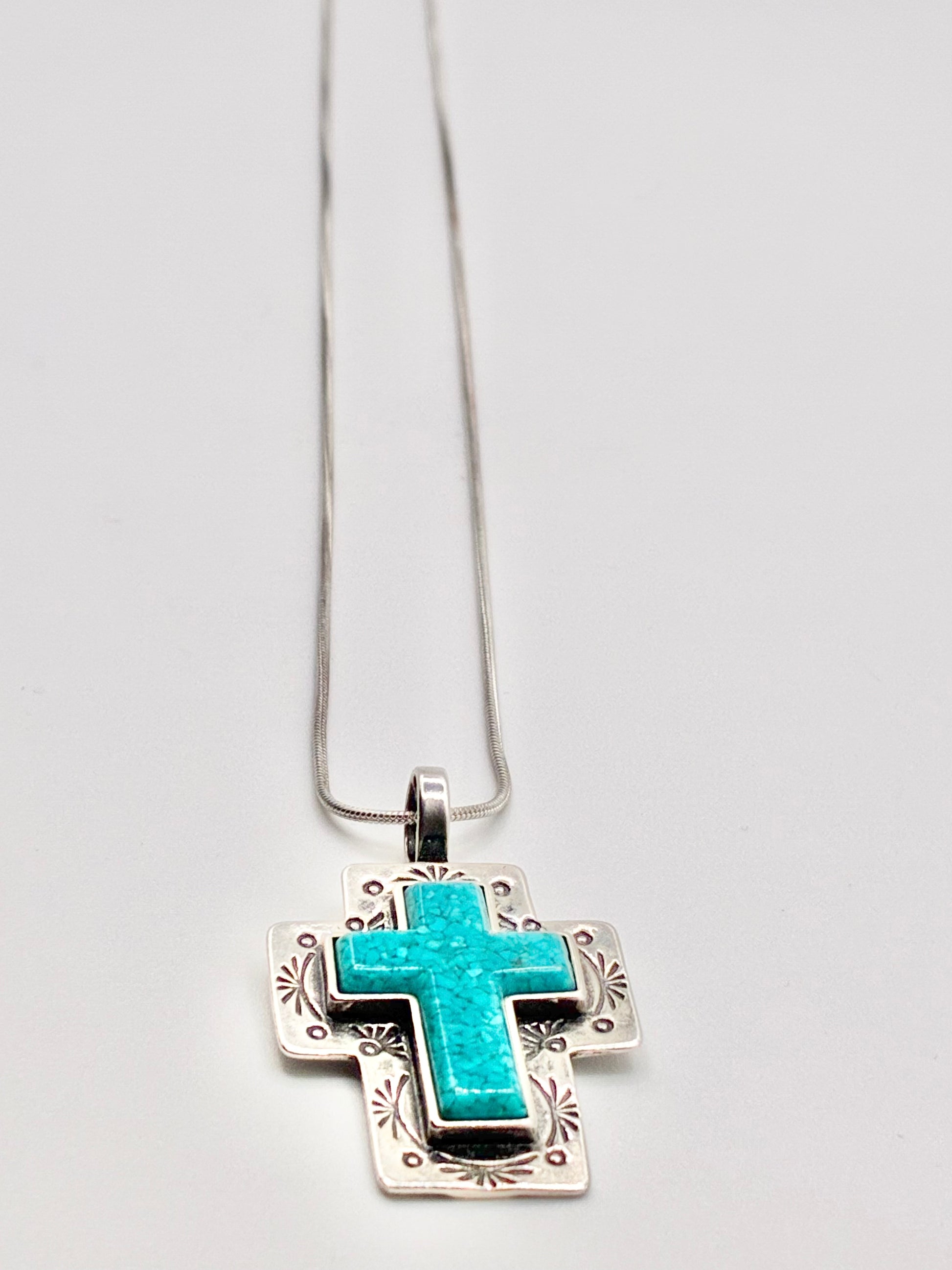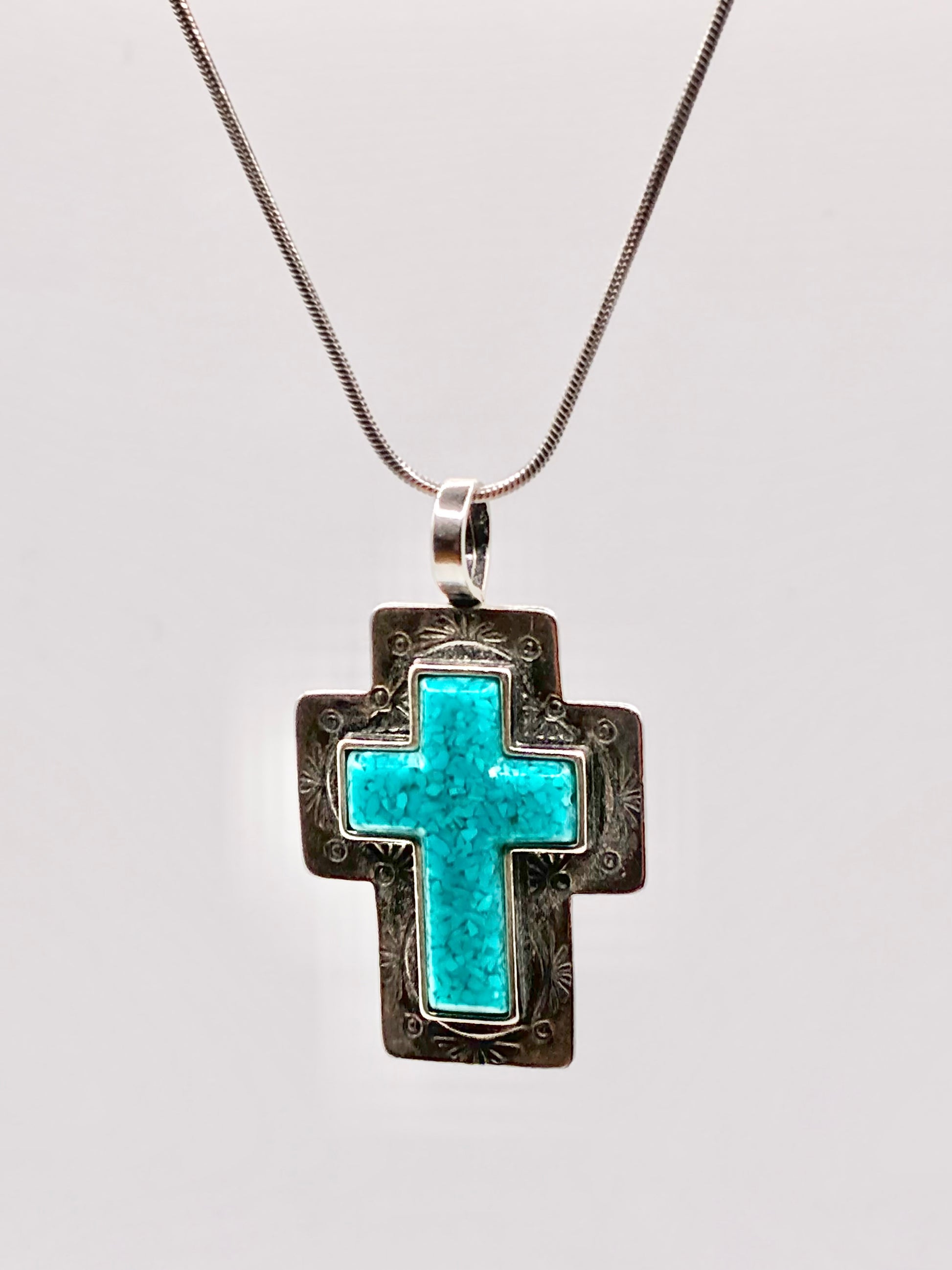 Pendant: Layered cross with turquoise inlay on a stamped Southwest-style plaque; oxidized accents for depth; textured back