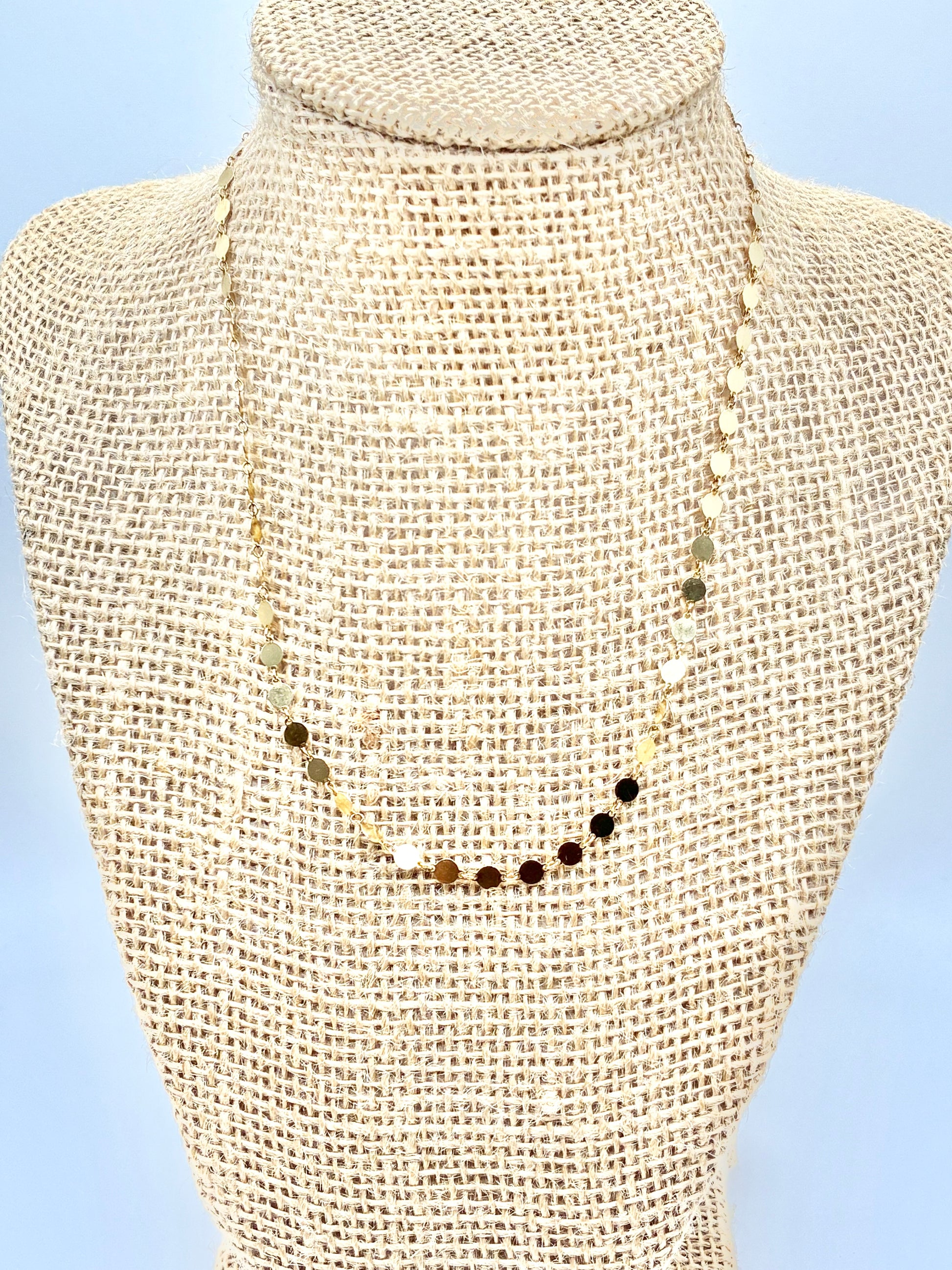 Shimmery and lightweight, this Italian-made chain features tiny flat disc links that catch the light with every move. Crafted in sterling silver with a warm gold-tone finish, it sits at a chic 16"—perfect solo at the collarbone or layered with longer pieces.