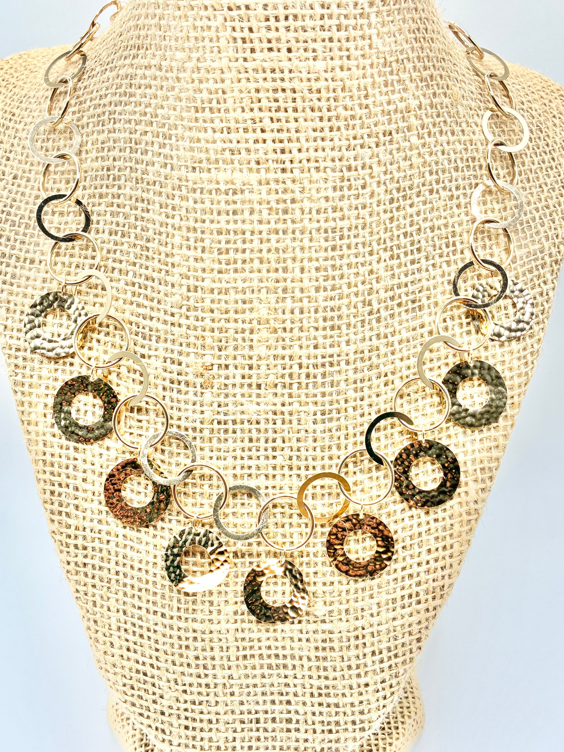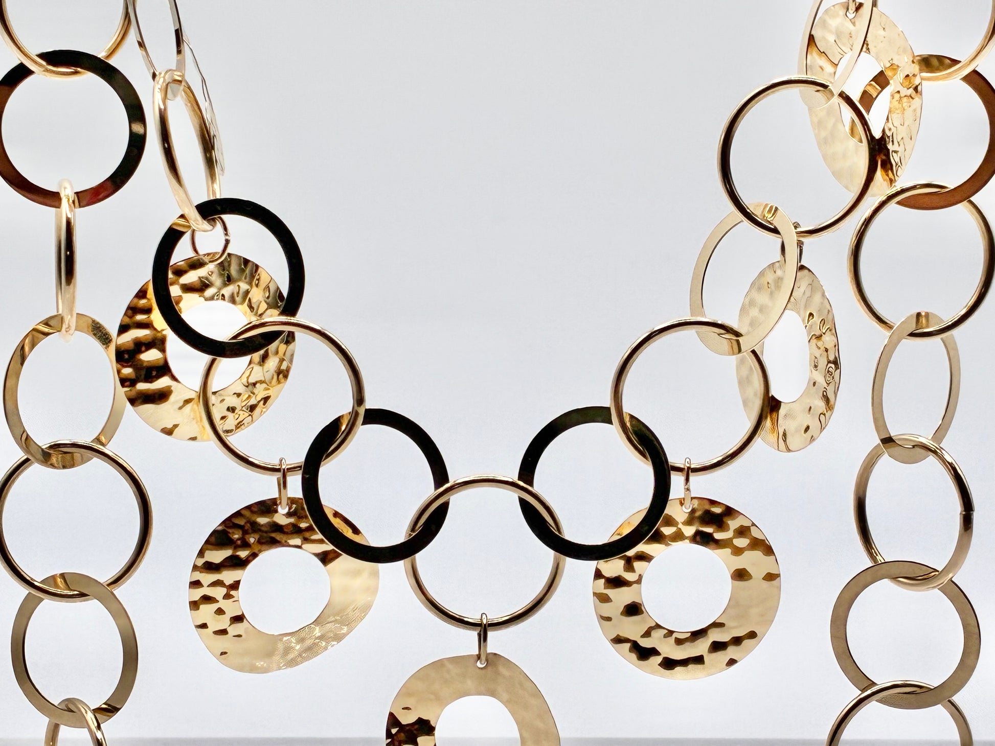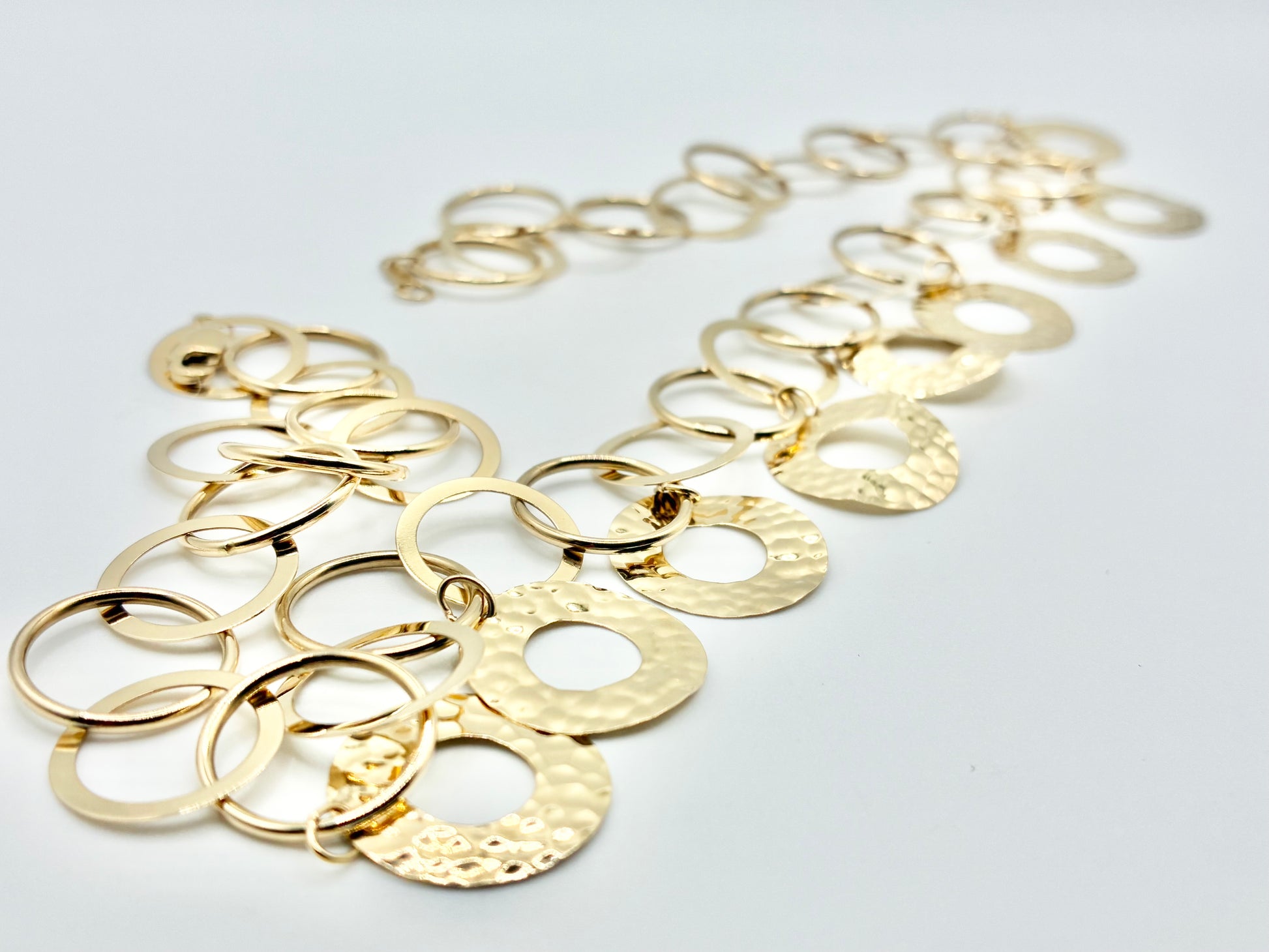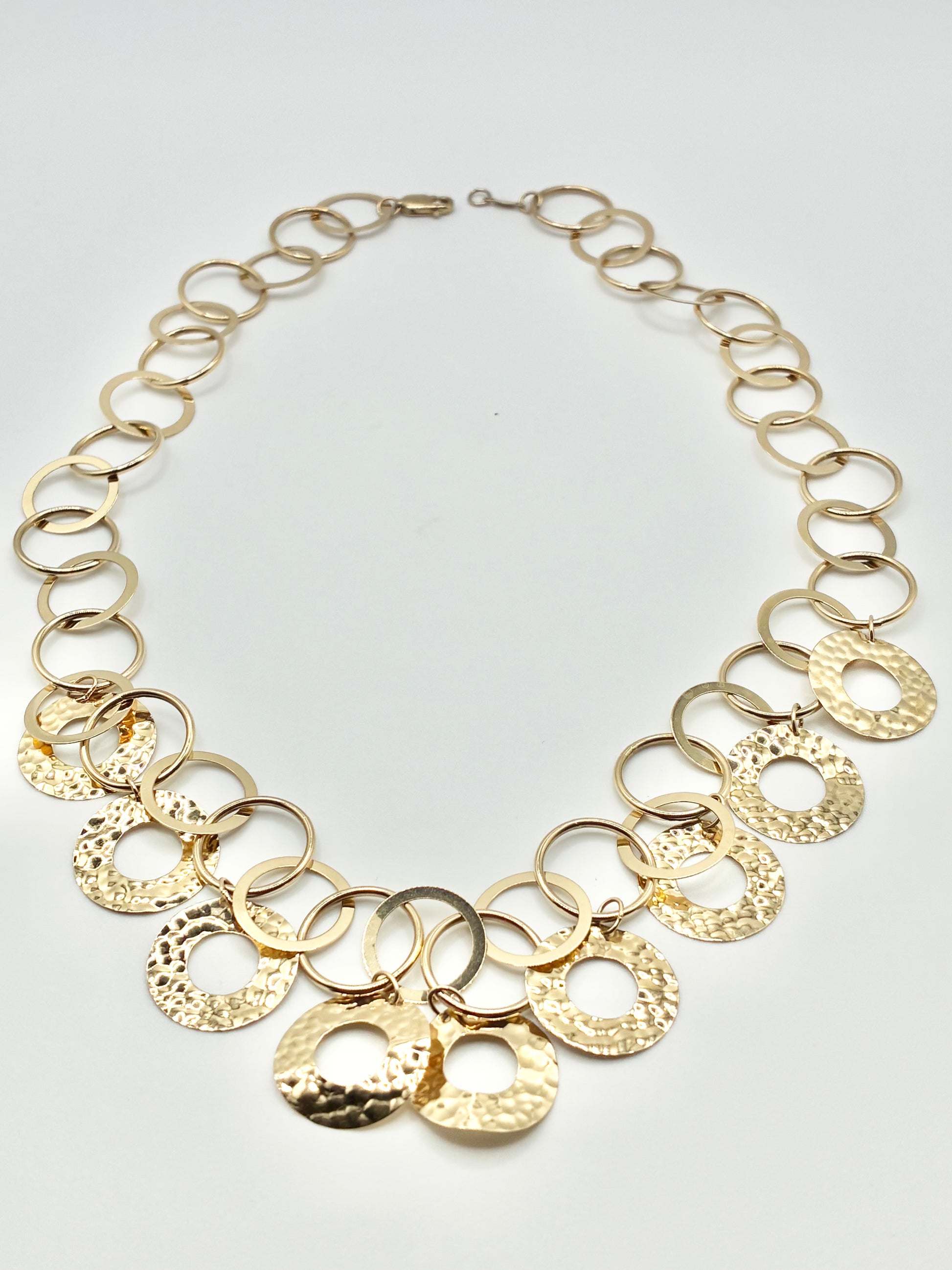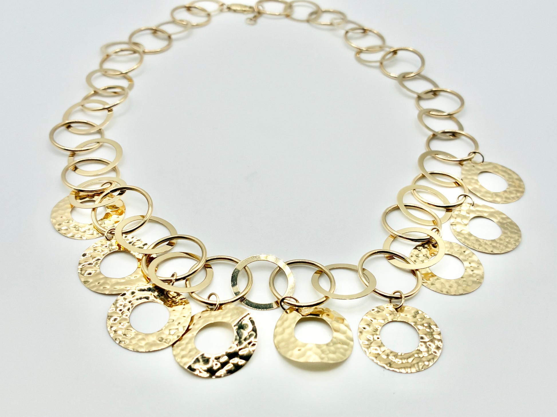 Sleek shine with sculptural movement. This 14k gold necklace graduates into a statement front of open circles and hammered disc links that catch the light from every angle. Finished with a secure lobster clasp.