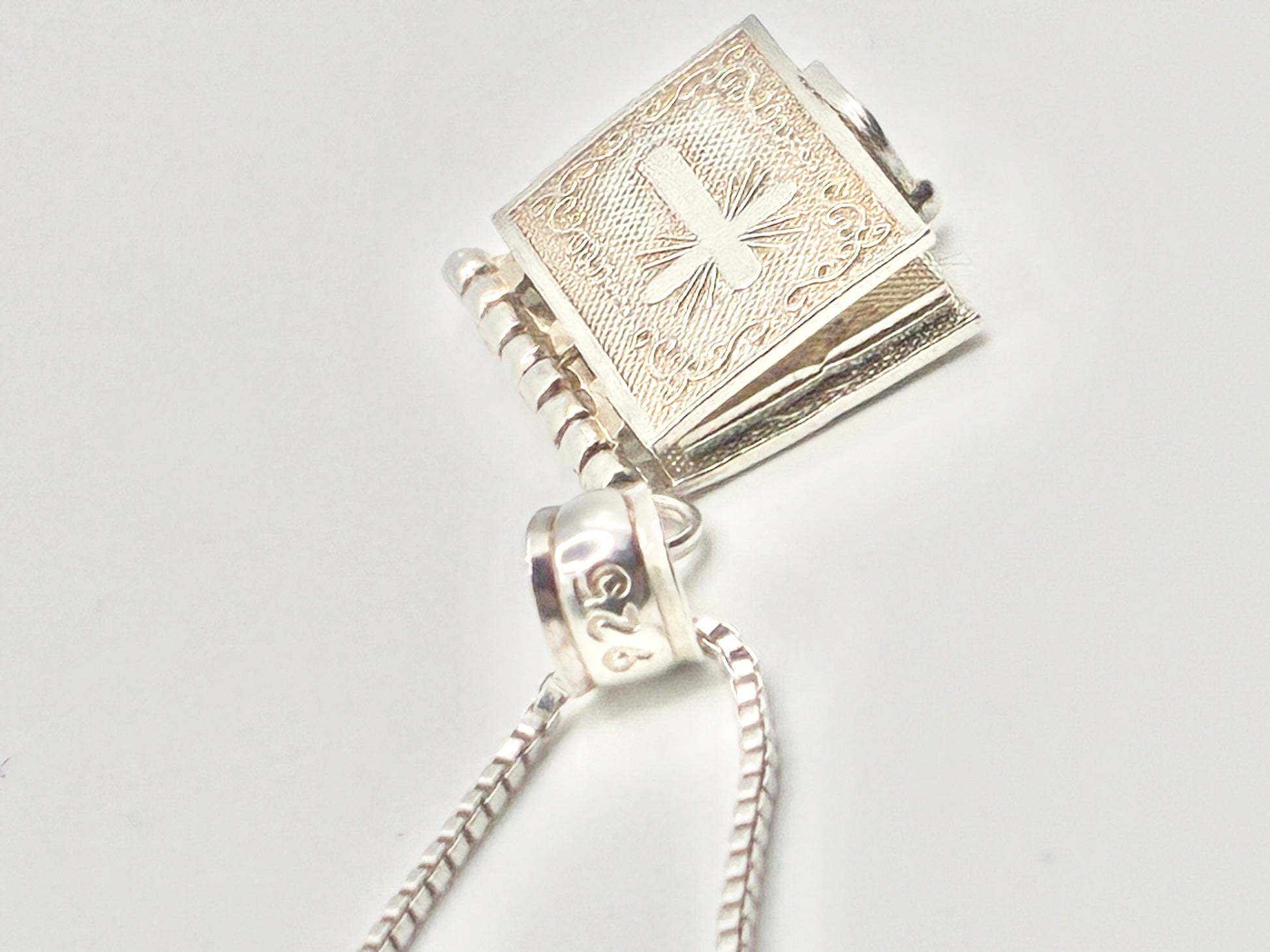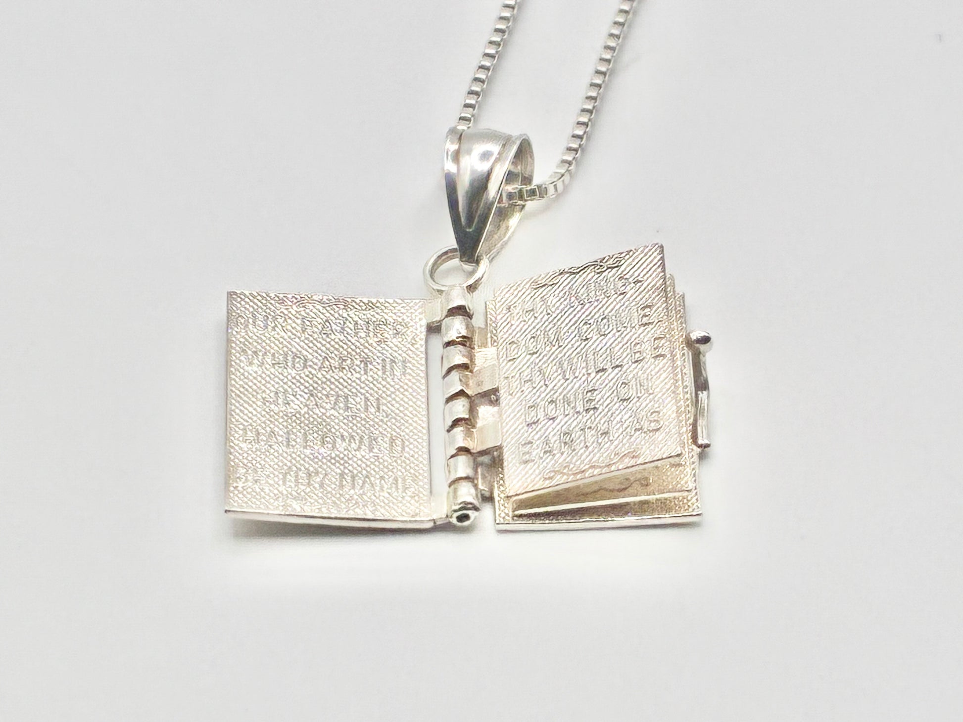A meaningful and finely detailed sterling silver prayer book pendant paired with a classic Italian chain. The miniature hinged book opens to reveal the Lord’s Prayer engraved inside, making this piece both symbolic and beautifully crafted. The exterior features raised religious motifs, including a cross and praying hands, framed by decorative engraved borders.