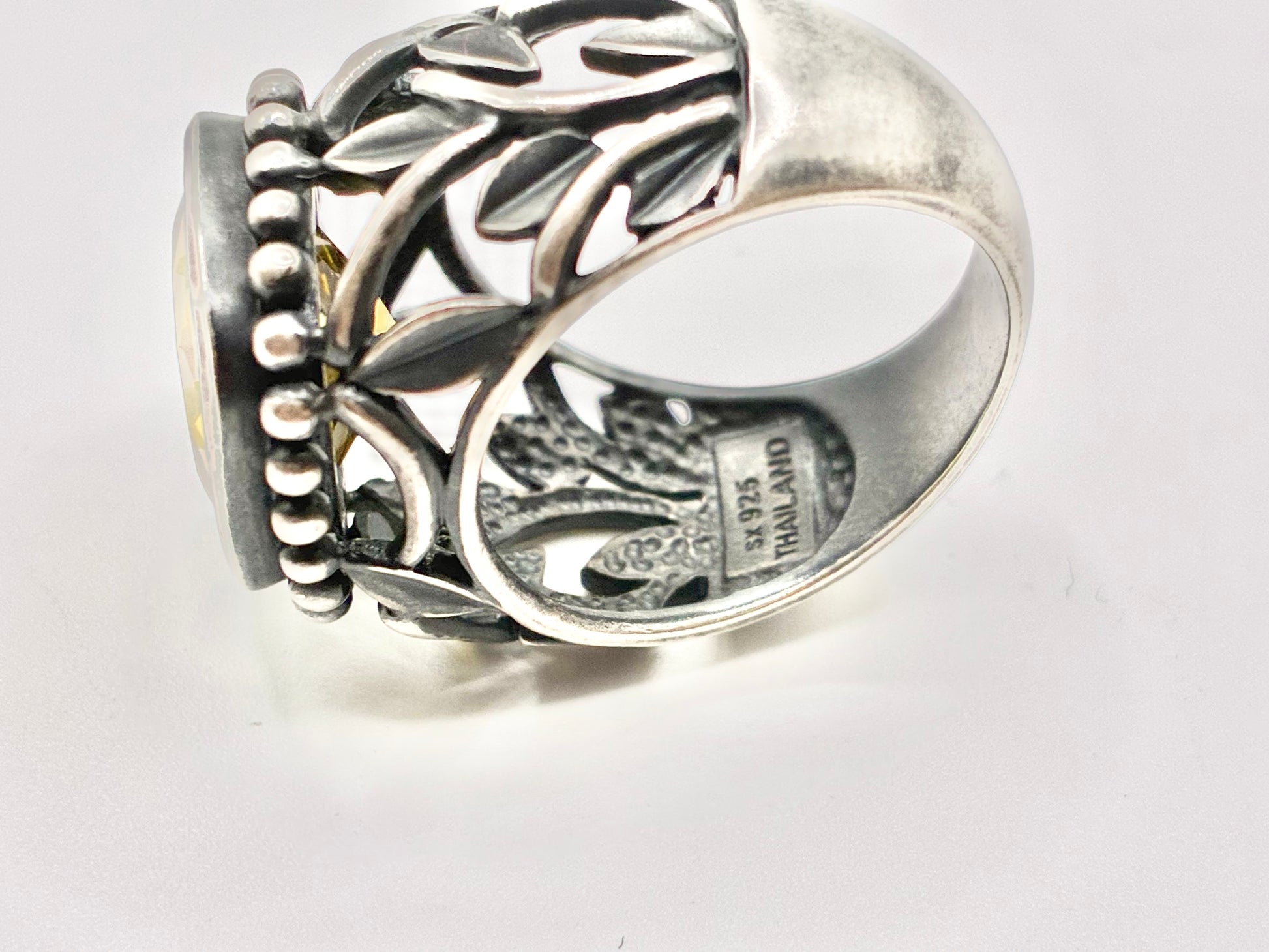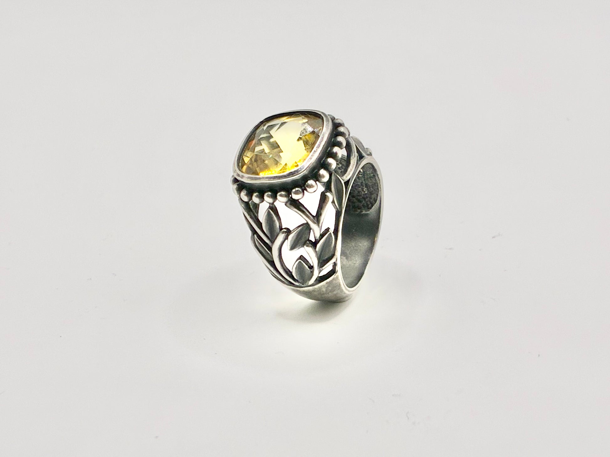 Striking sterling silver ring featuring a faceted yellow gemstone set in a detailed openwork band. Crafted in solid 925 silver with intricate vine and bead motifs along the shoulders, this ring has a bold yet refined presence. The square-cushion cut stone displays warm golden tones that catch the light beautifully, framed by a beaded bezel for added texture and depth.