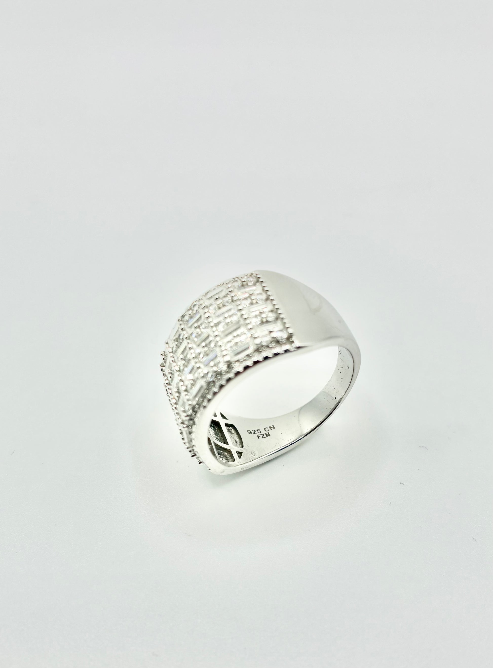 Bold sparkle in a sleek, modern silhouette. This statement ring features a wide, gently curved rectangular face set with alternating rows of baguette-cut and round cubic zirconia, edged in pavé for extra brilliance. The tapered shank balances the presence on the finger for comfortable wear. Hallmarked FZN • CN • 925.