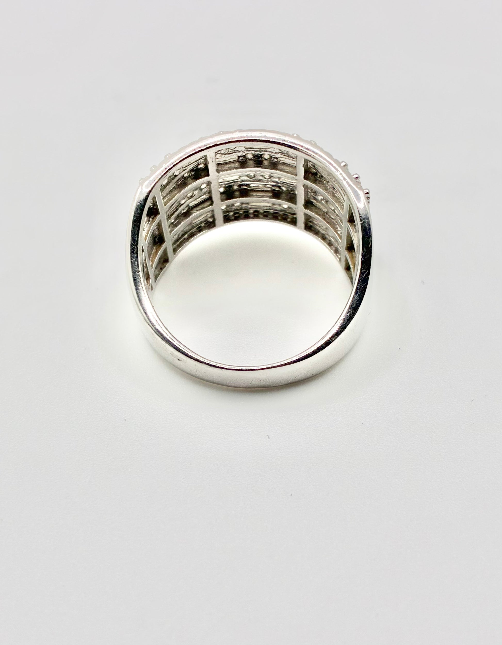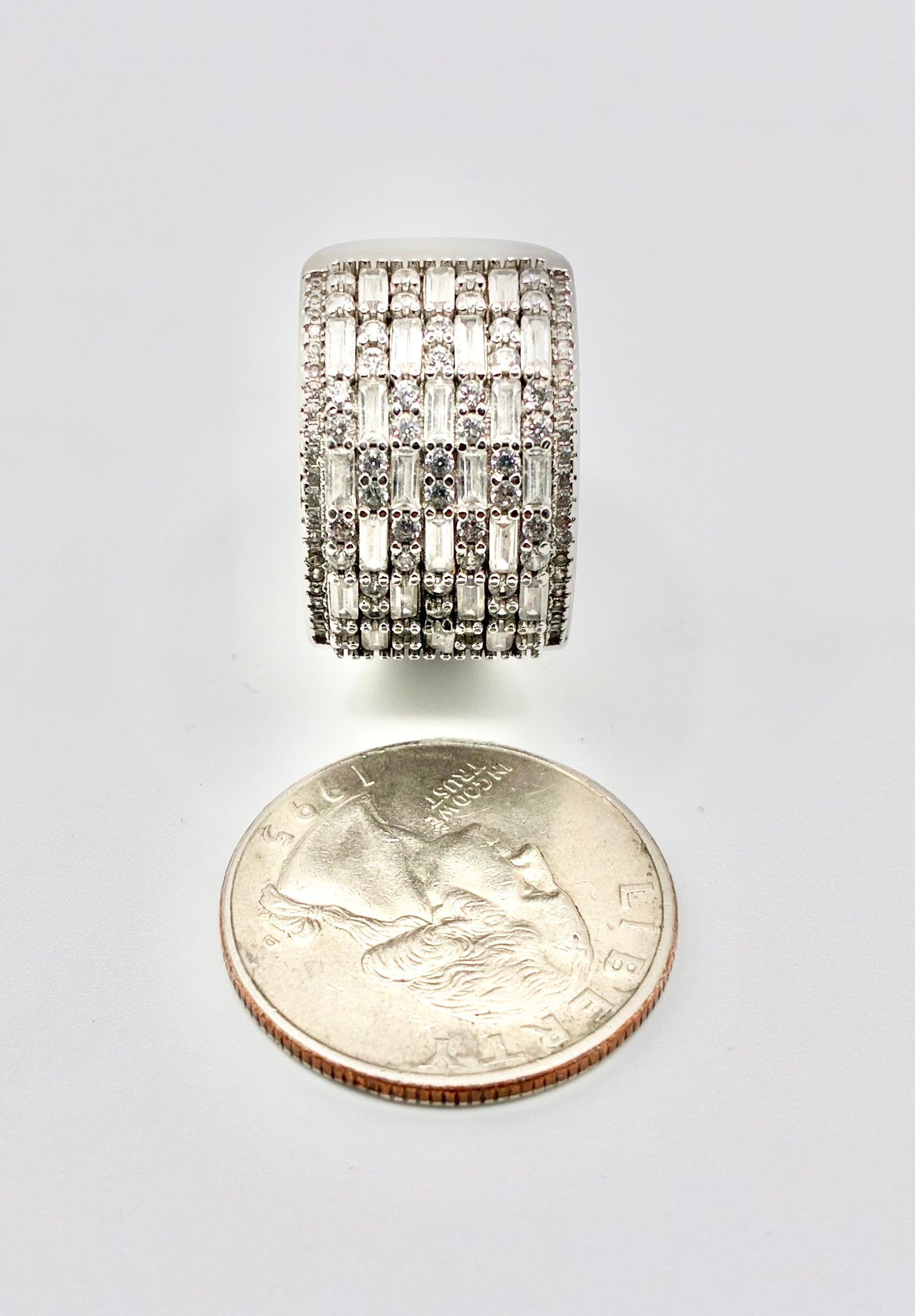 Design: Wide top with grid of baguette/round CZ; tapered band