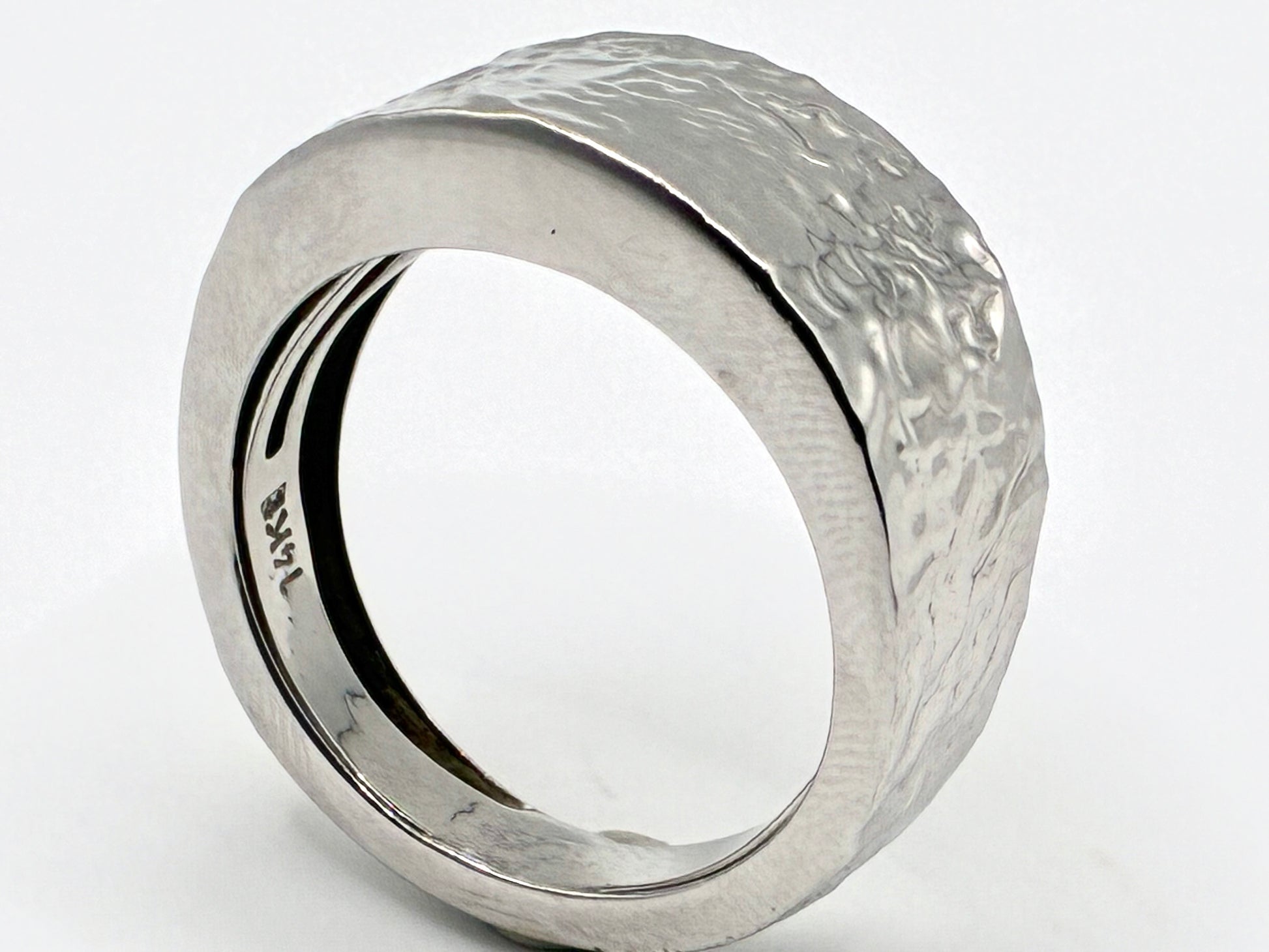 Modern minimalism with artisan texture. This substantial band is crafted in 14k white gold and finished with a hand-hammered surface that catches the light with subtle facets. Clean, low-profile edges make it easy for everyday wear or stacking.