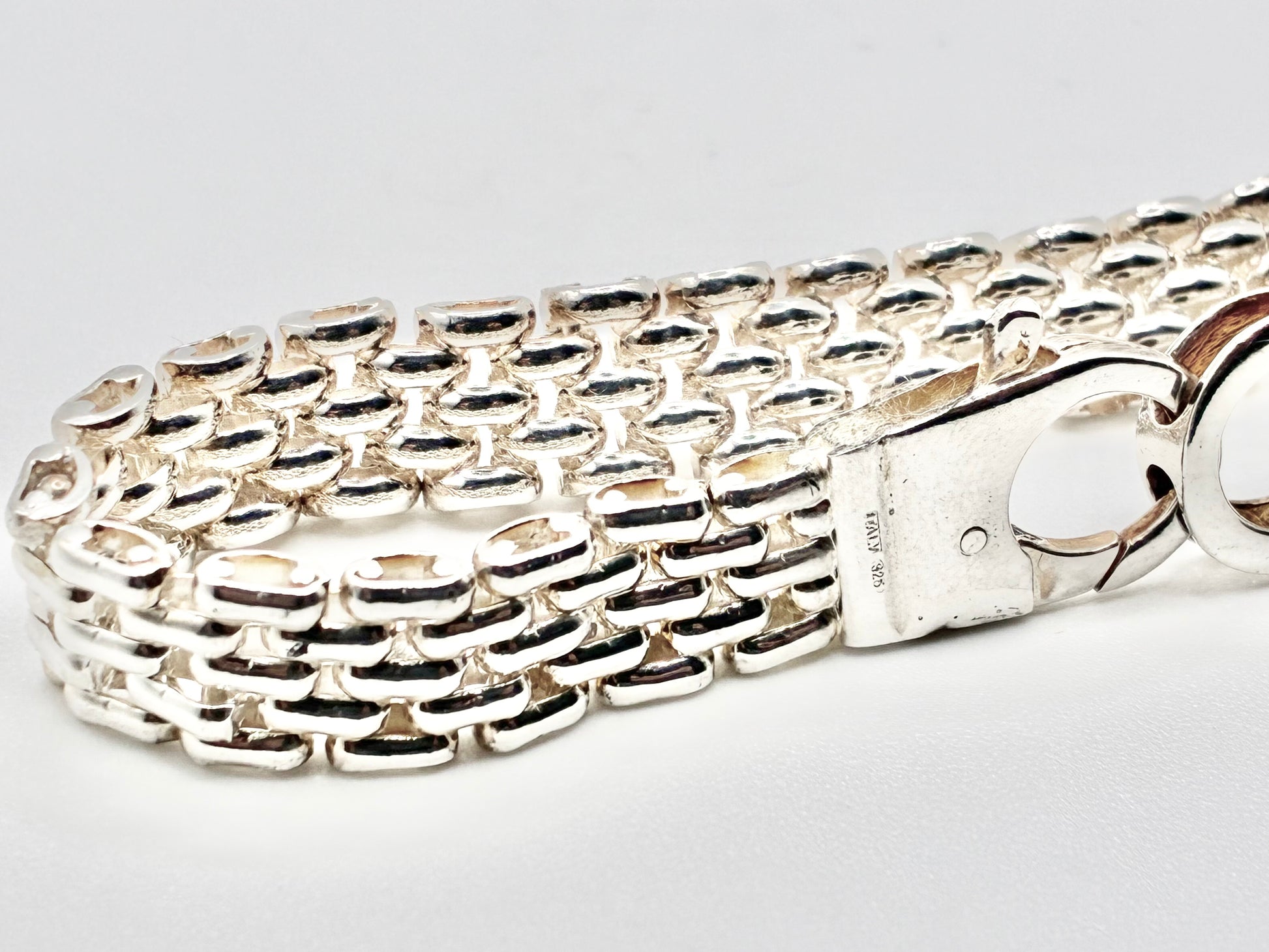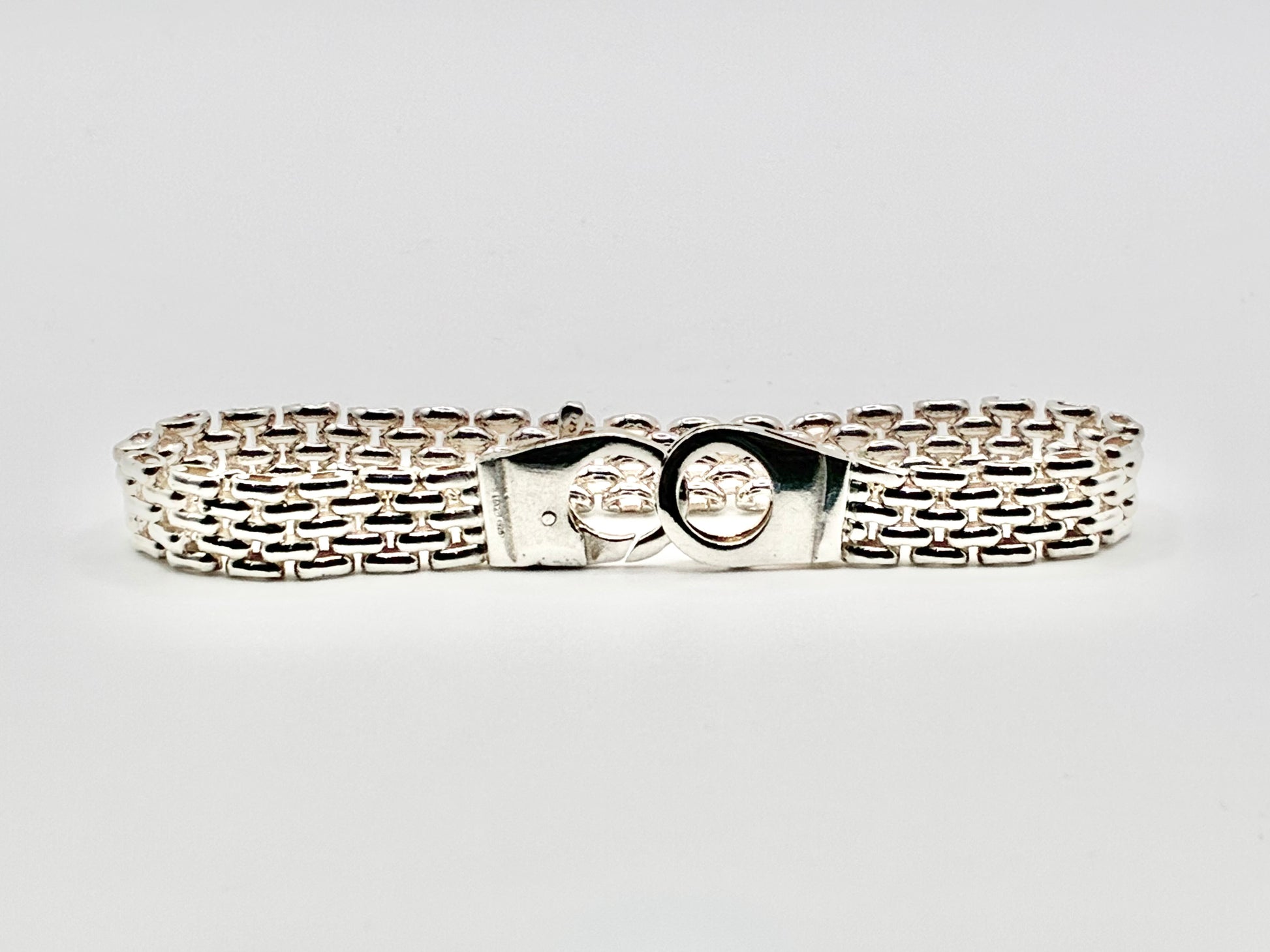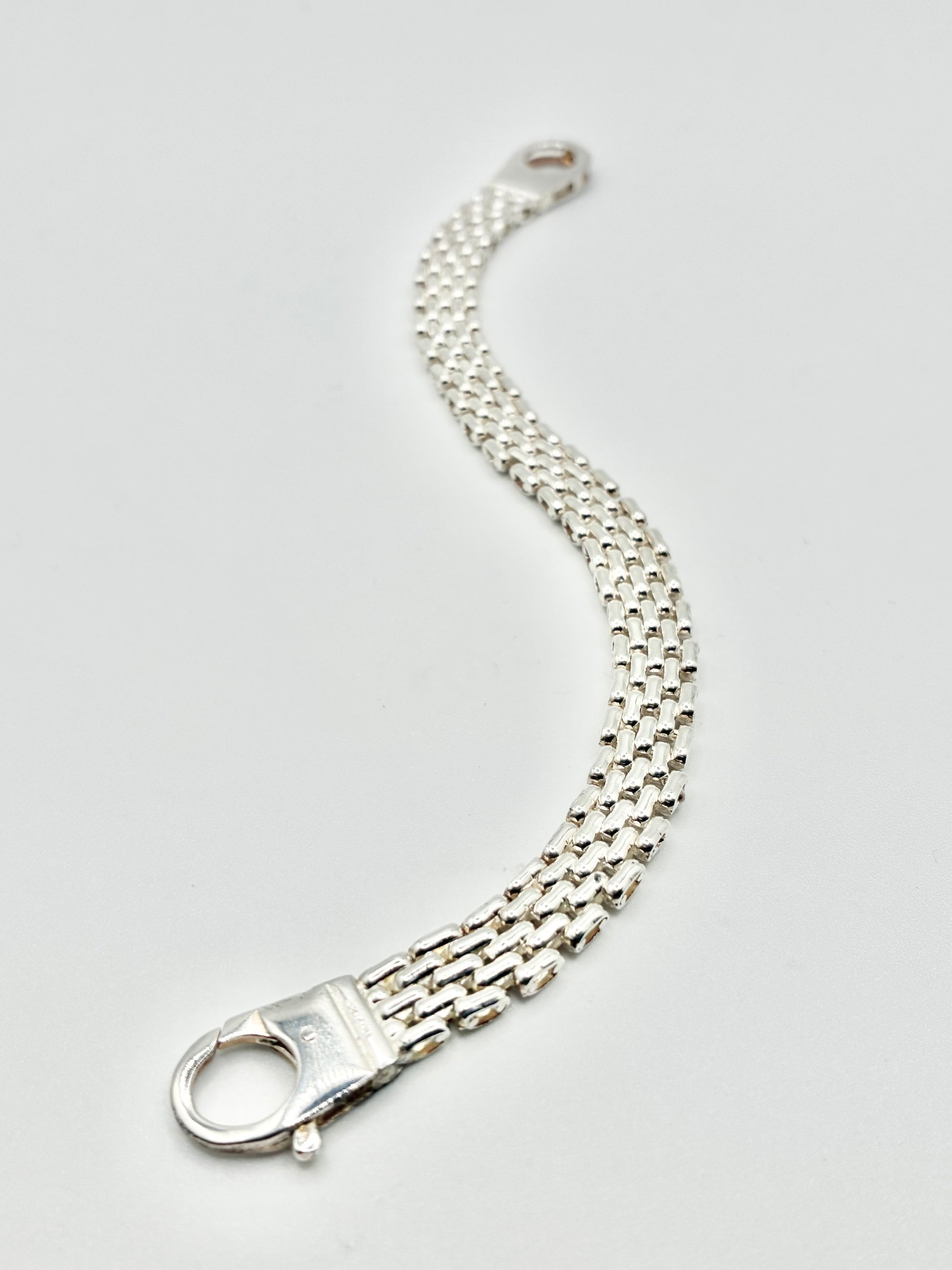 Italian-made 925 sterling silver bracelet featuring three rows of rounded brick links that drape smoothly on the wrist. Finished with an oversized circular lobster clasp that doubles as a modern focal point.