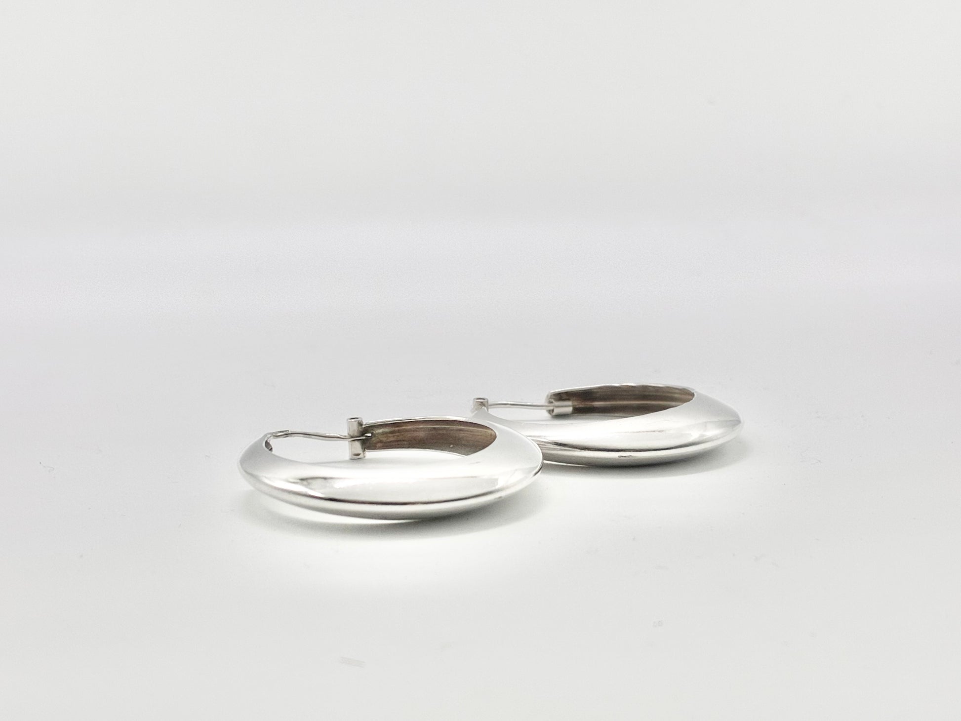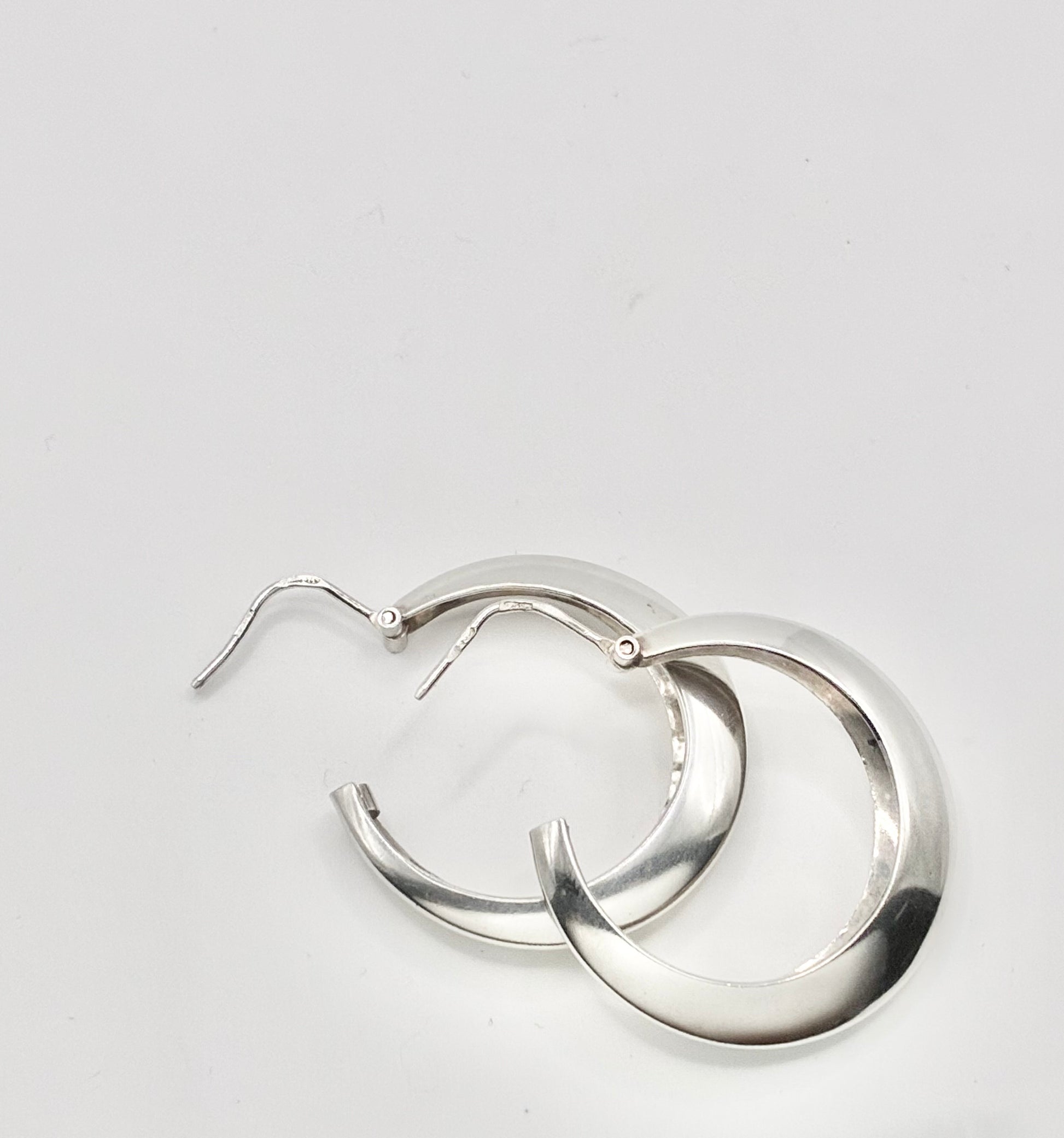 Polished Italian sterling silver hoops by JOIA, crafted with a bold, sculptural profile and a smooth, high-shine finish. These earrings offer a refined balance of modern minimalism and timeless Italian craftsmanship, designed to elevate both everyday looks and evening styling.