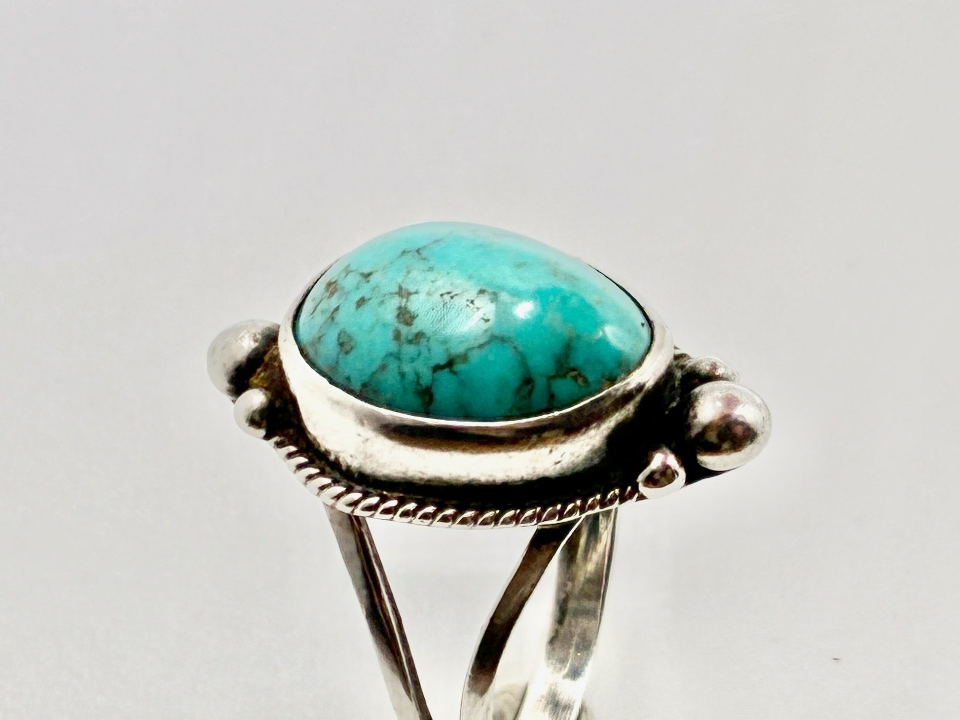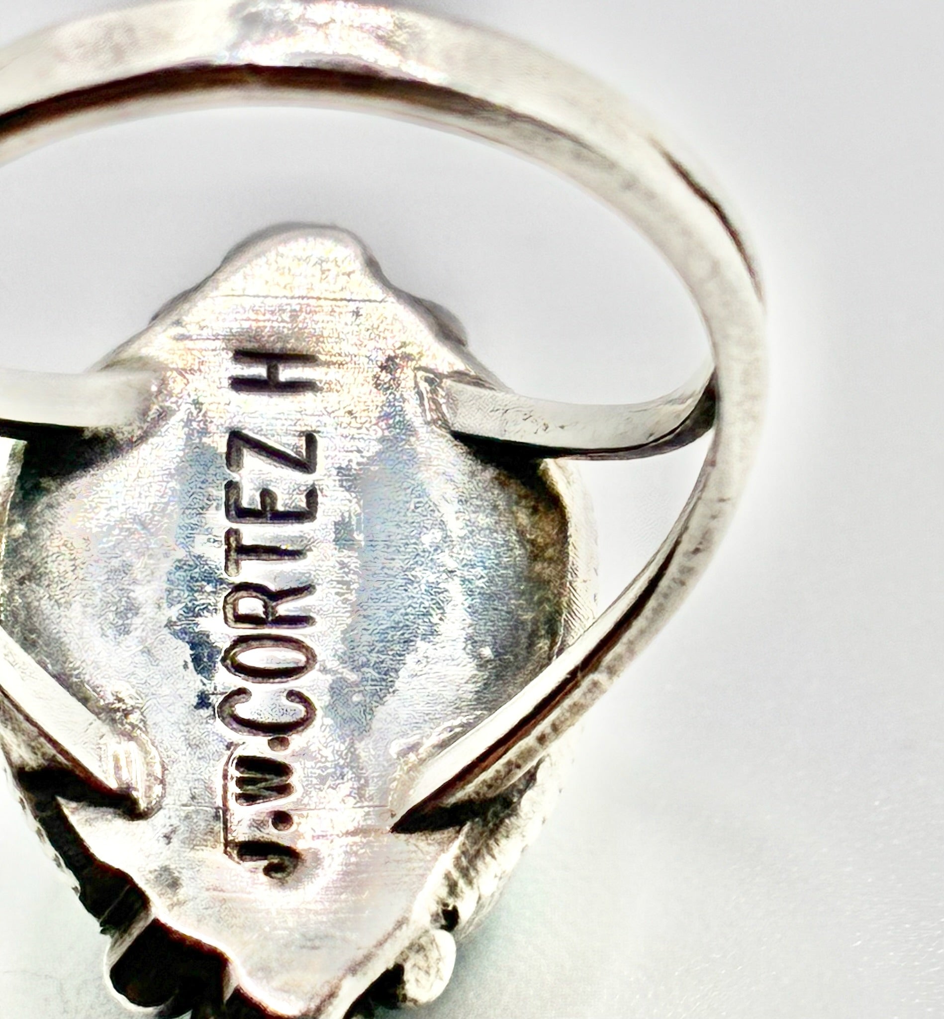 A striking Southwestern statement ring showcasing an oval turquoise cabochon framed in a rope-edge bezel with silver bead accents. The double split-shank band adds balance and comfort while highlighting the stone. Inside the band is the maker’s hallmark “J.W. CORTEZ H”.