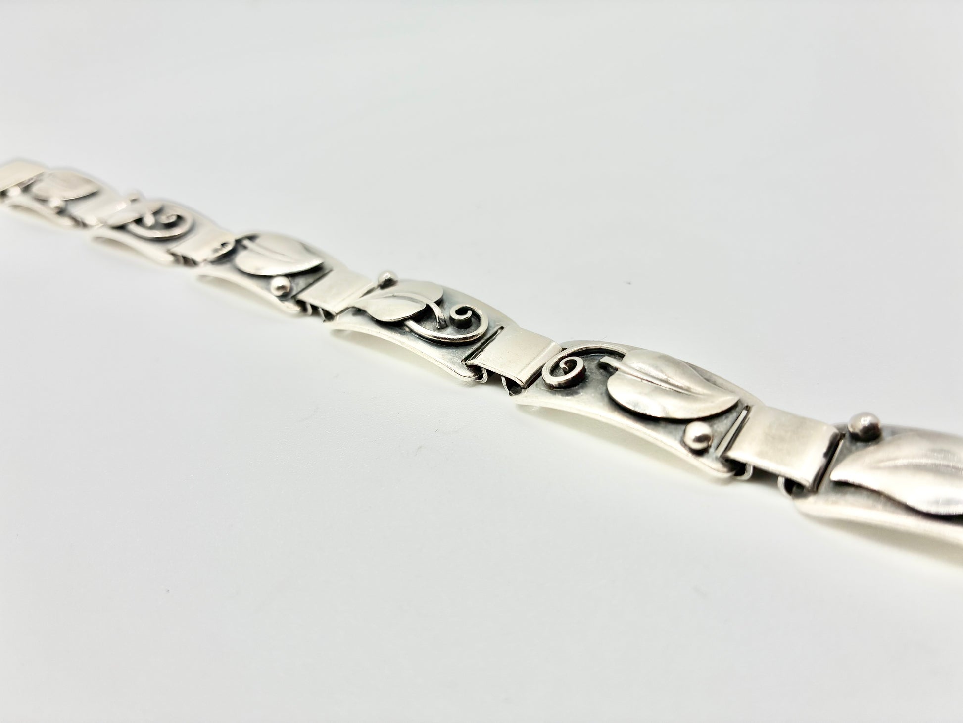 Elegant, sculptural bracelet by American silversmith Laurence Foss, crafted in solid sterling and finished with his signature hand-wrought leaf motif on each panel. The flexible links drape beautifully on the wrist and close with a secure box clasp.