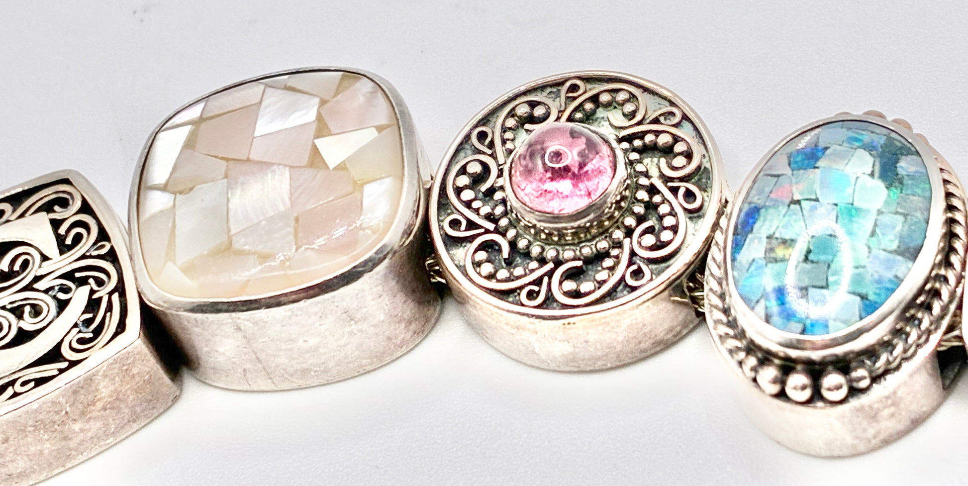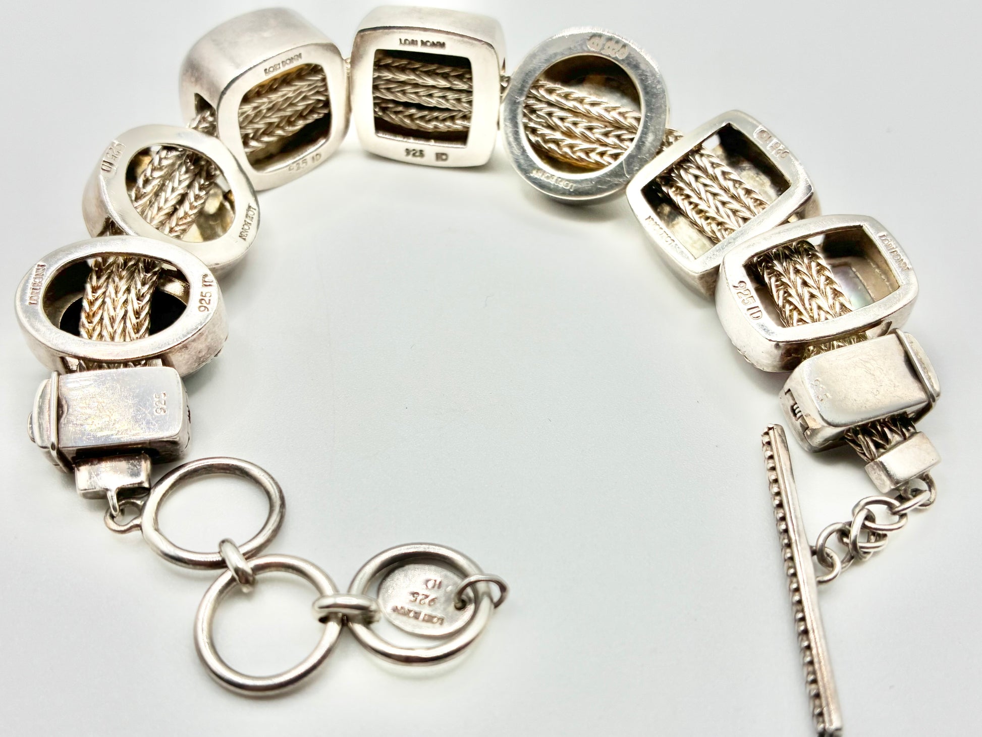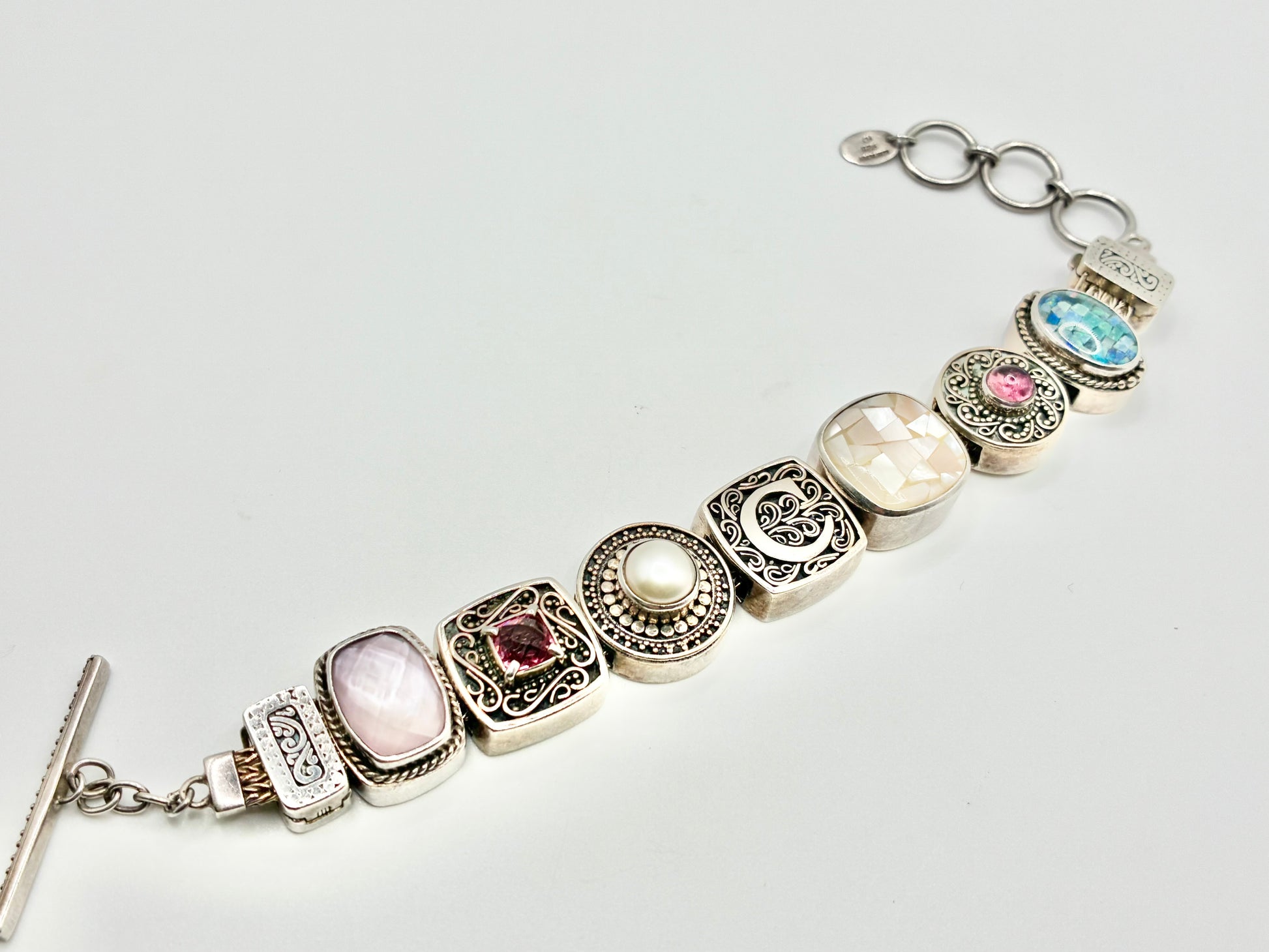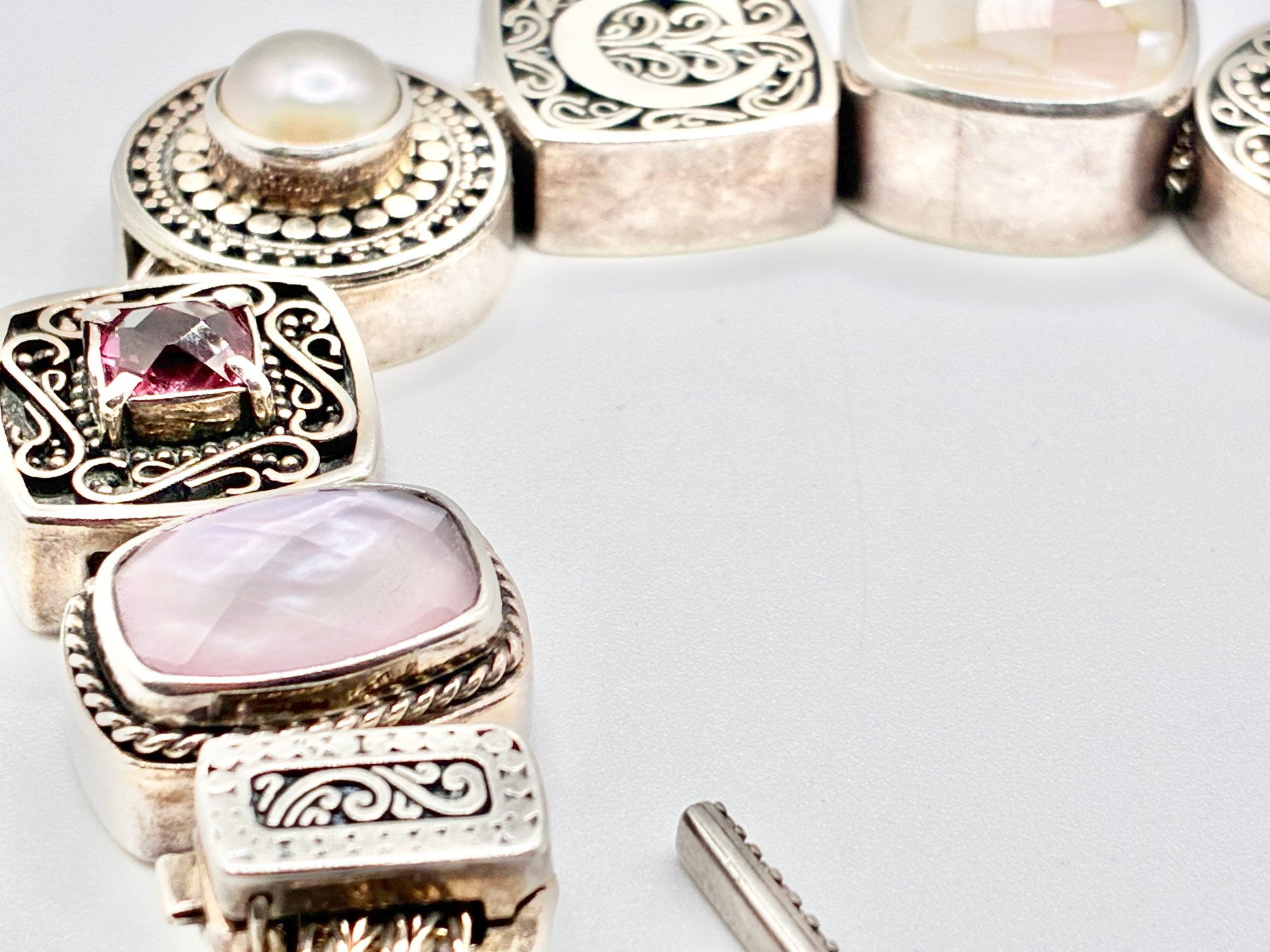 Statement artisan detail from end to end. This Lori Bonn link bracelet showcases a lineup of ornate sterling stations—rope and scroll motifs with oxidized accents—set with mixed stones including faceted pink and purple tones, a luminous pearl, iridescent mosaic blue/green, mother-of-pearl–style checkerboard, and other cabochons. Finished with a chunky beaded-edge toggle and three-ring extender for the perfect fit.