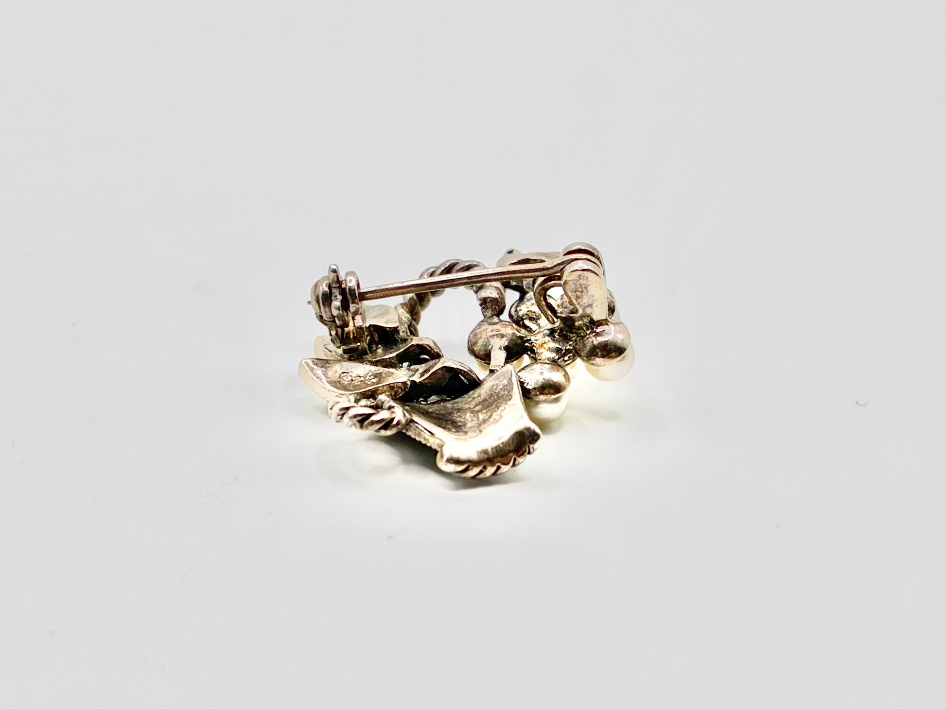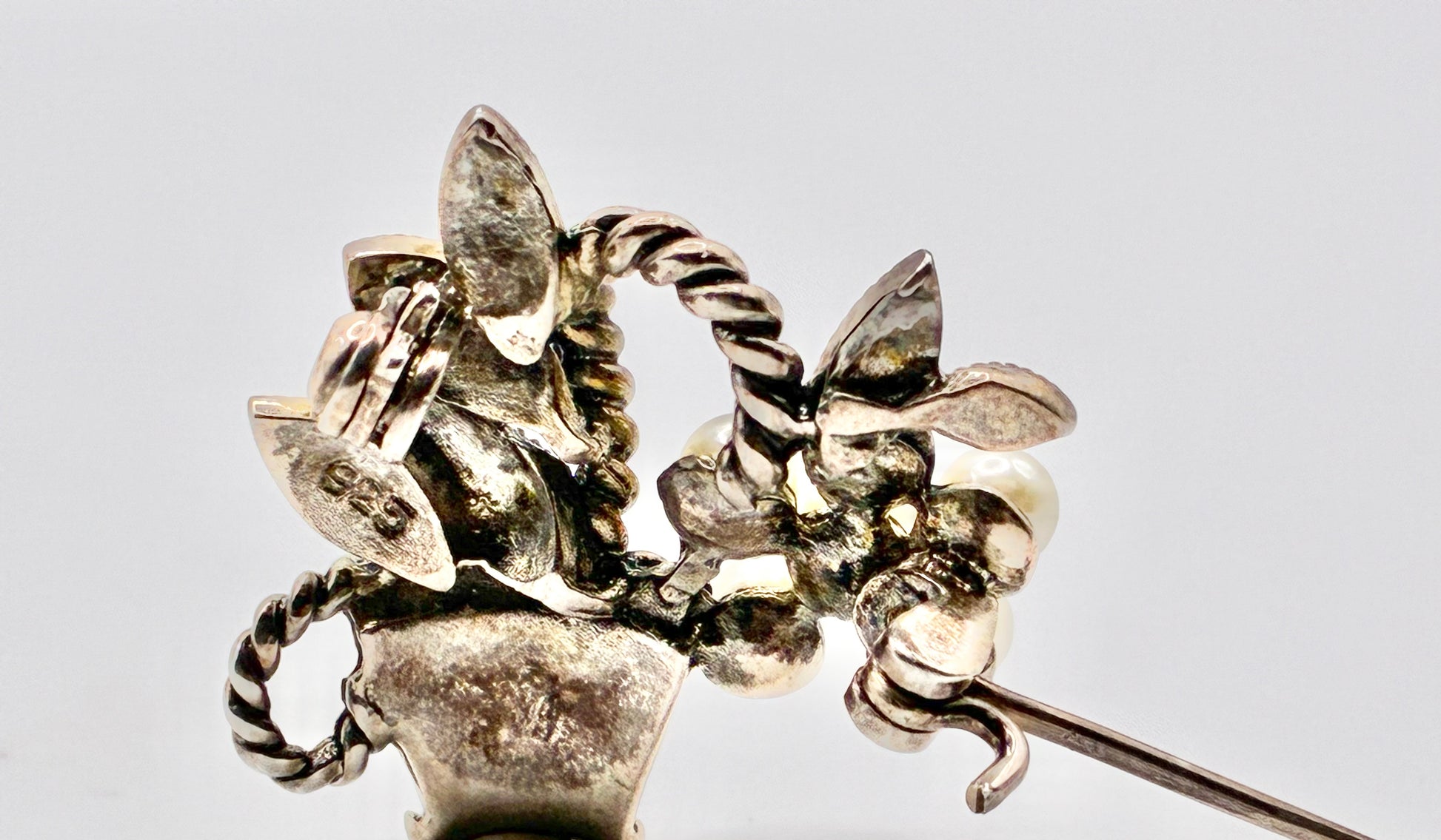 Delicate, romantic, and beautifully detailed, this sterling silver flower basket brooch captures the timeless charm of classic mid-century jewelry design. A graceful woven basket overflows with luminous pearl accents and sparkling marcasite, creating a piece that feels both elegant and nostalgic. The sculpted leaves, twisted rope handle, and dimensional basket give this brooch wonderful depth and character, making it perfect for collectors or as a thoughtful gift for someone who loves vintage style.