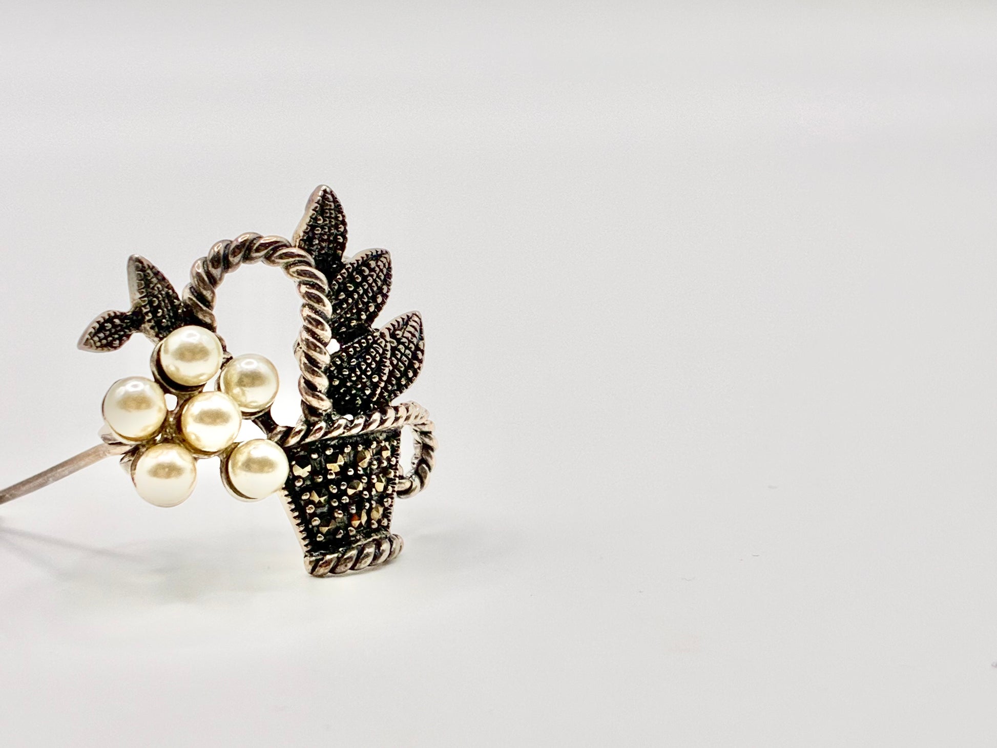 Marcasite & Pearl Flower Basket Brooch 925 Sterling Silver Pin