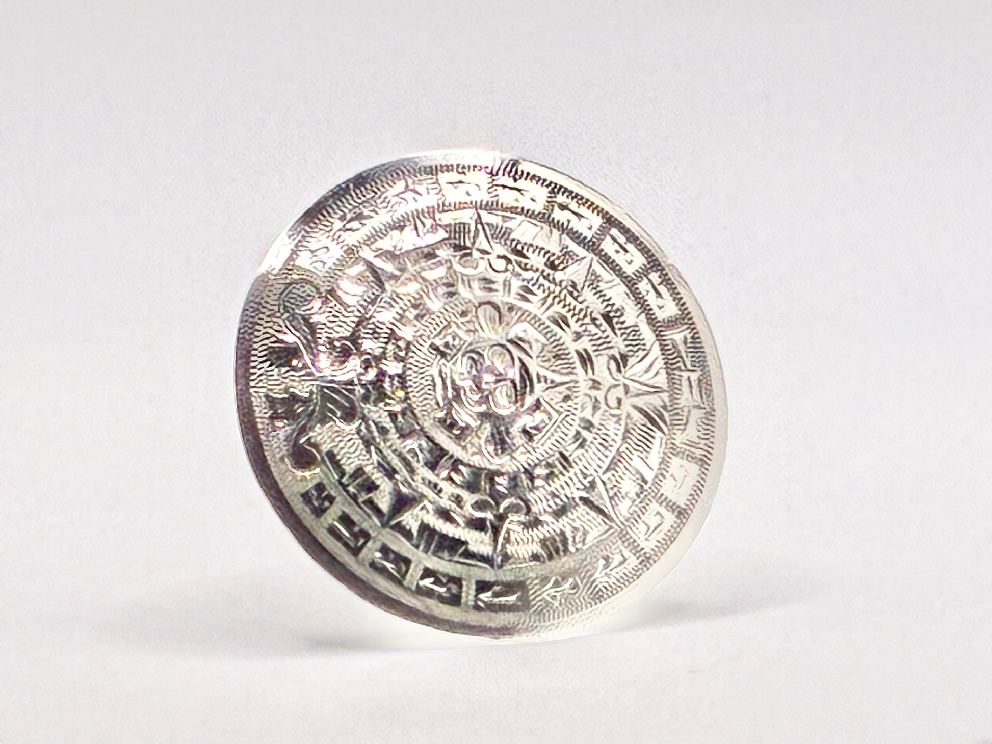 A bold, hand-engraved round disc showcasing a sunstone/Calendar-style motif with a polished rim. Convertible design with both a pendant bail and a secure pin back for versatile wear.