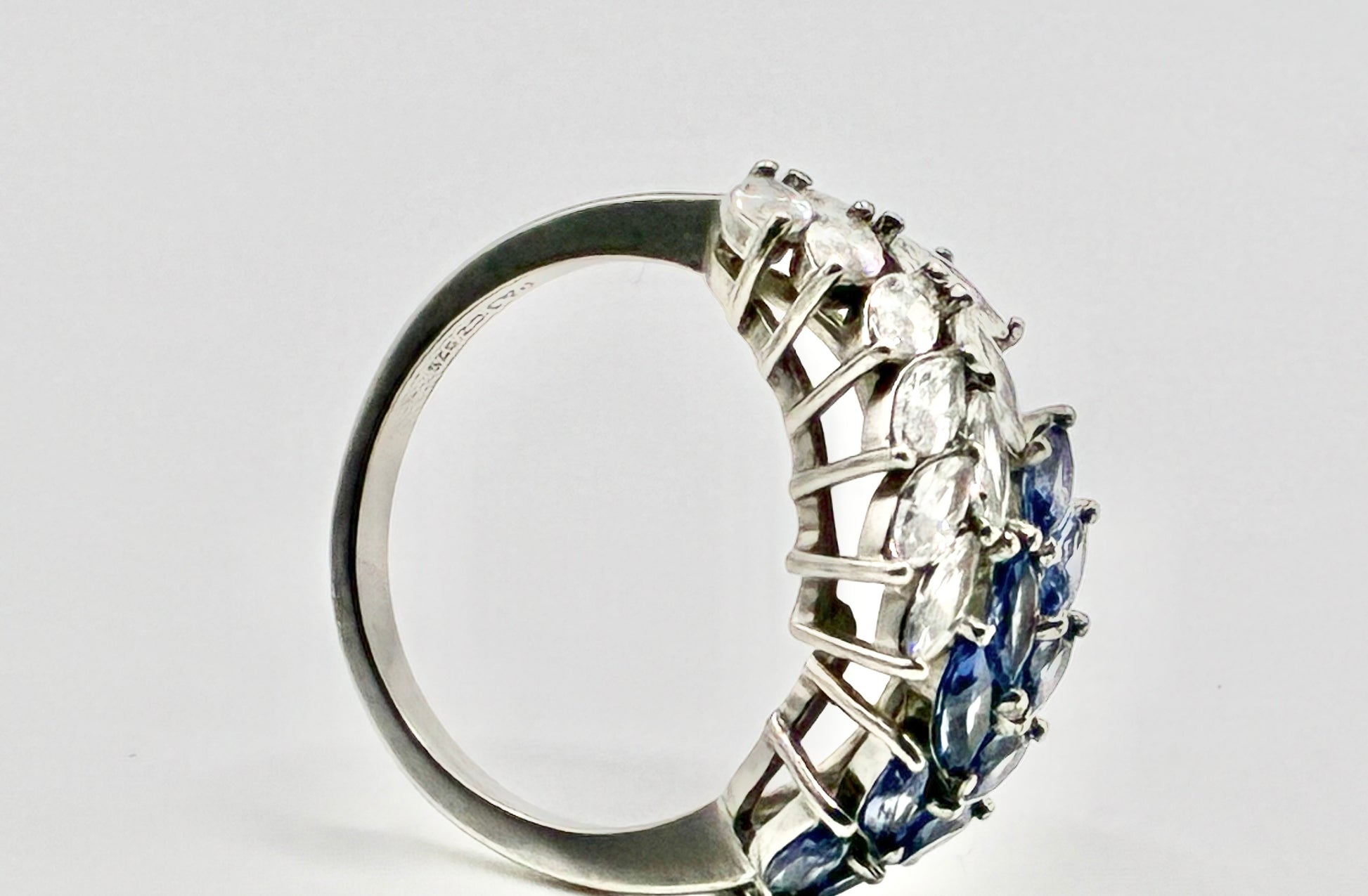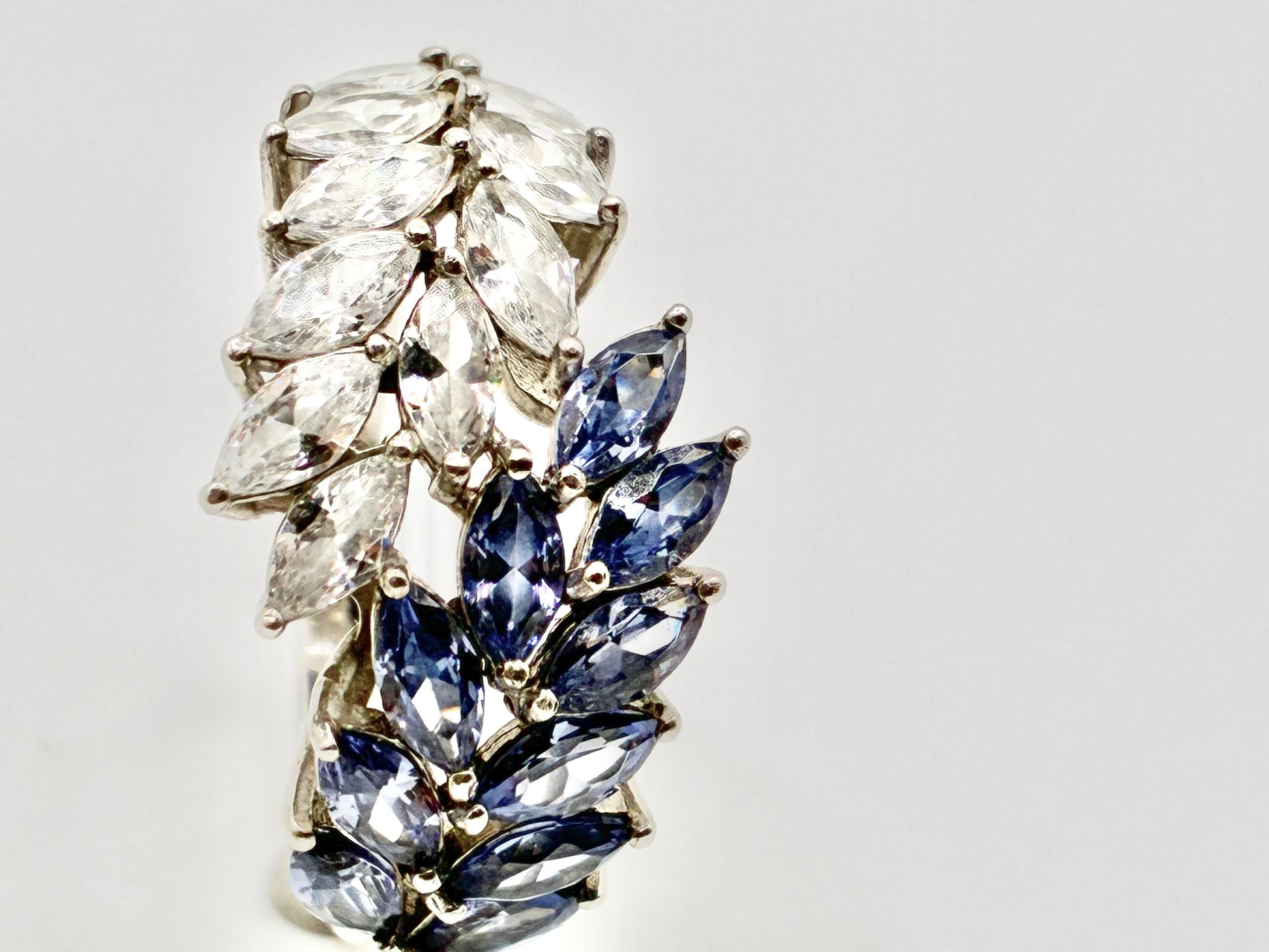 Sparkling two-row bypass ring set with marquise-cut cubic zirconia—one row in icy clear stones and the other in deep sapphire-blue for striking contrast.
