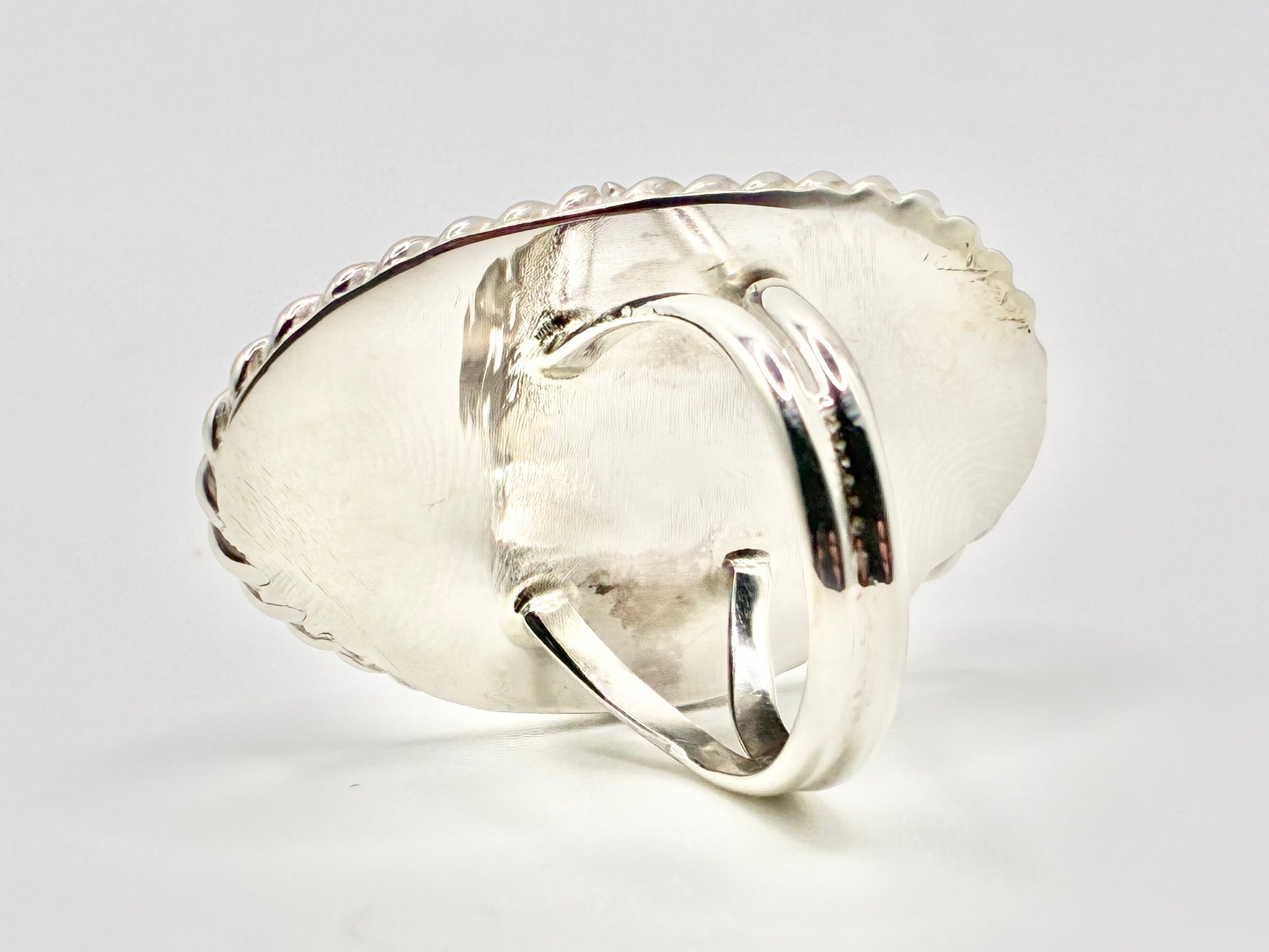 Striking Navajo ring showcasing a finely inlaid kachina/yei figure in a bold elongated oval. The mosaic features turquoise, mother-of-pearl, onyx, and coral tones set flush in gleaming sterling silver. Finished with a twisted-rope bezel and sturdy split shank for comfortable wear.