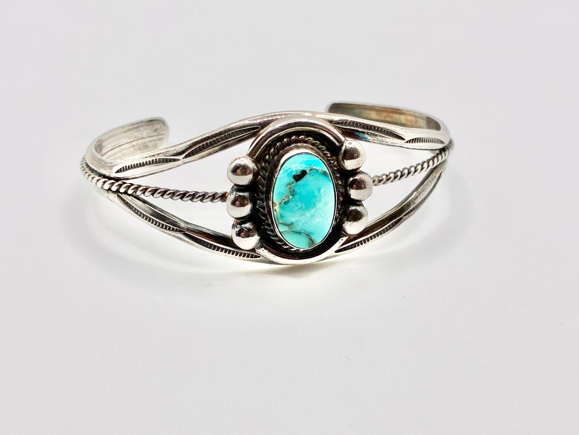 A classic Navajo design—bold turquoise, clean lines, and a comfortable everyday cuff.