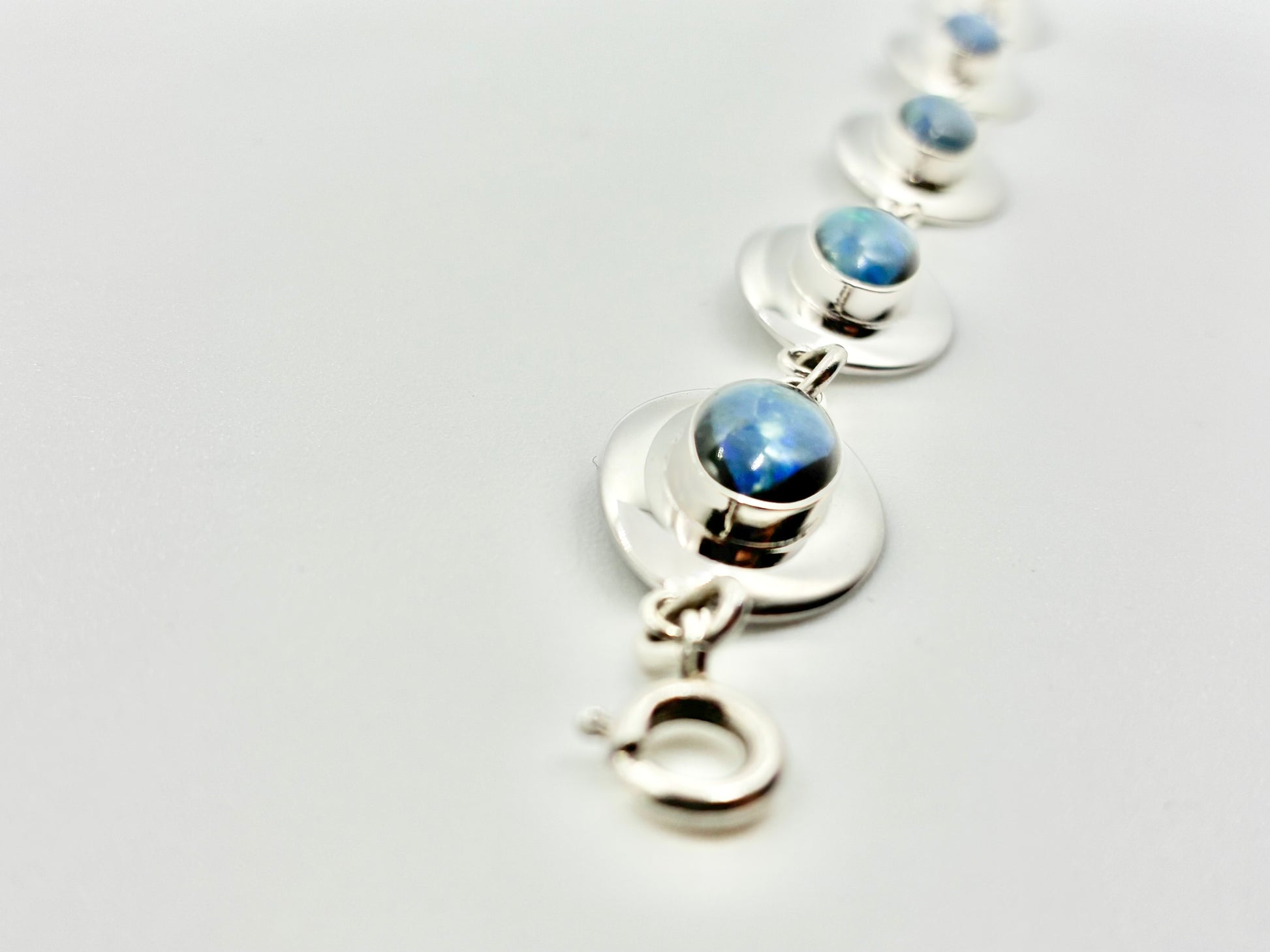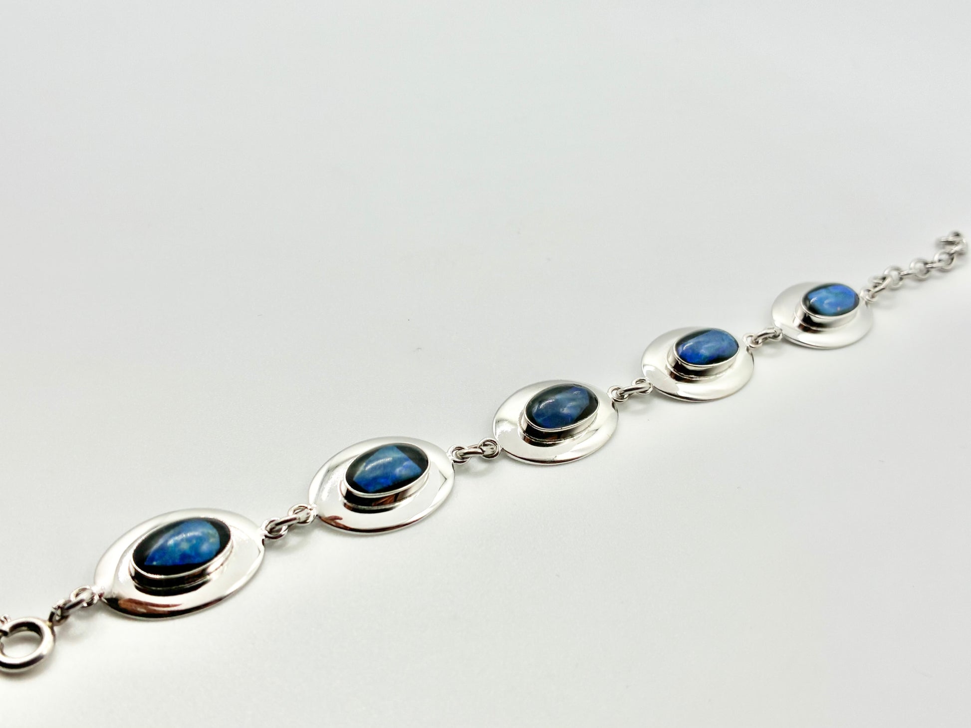 Elegant Starlux link bracelet featuring graduated oval stations set with deep blue cabochon accents. Each bezel-set stone sits inside a polished, concentric halo for a sleek, dimensional look. Finished with a spring-ring clasp and short tail for an easy, comfortable fit.