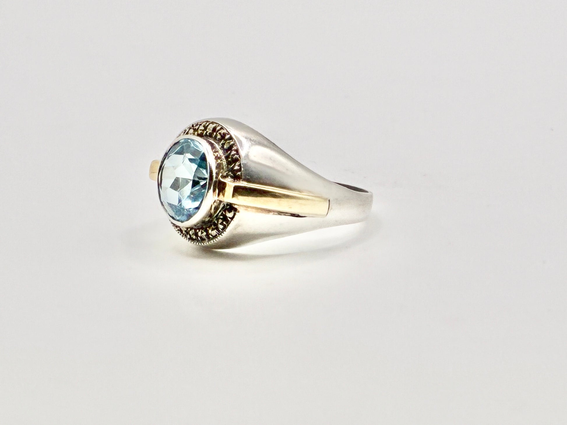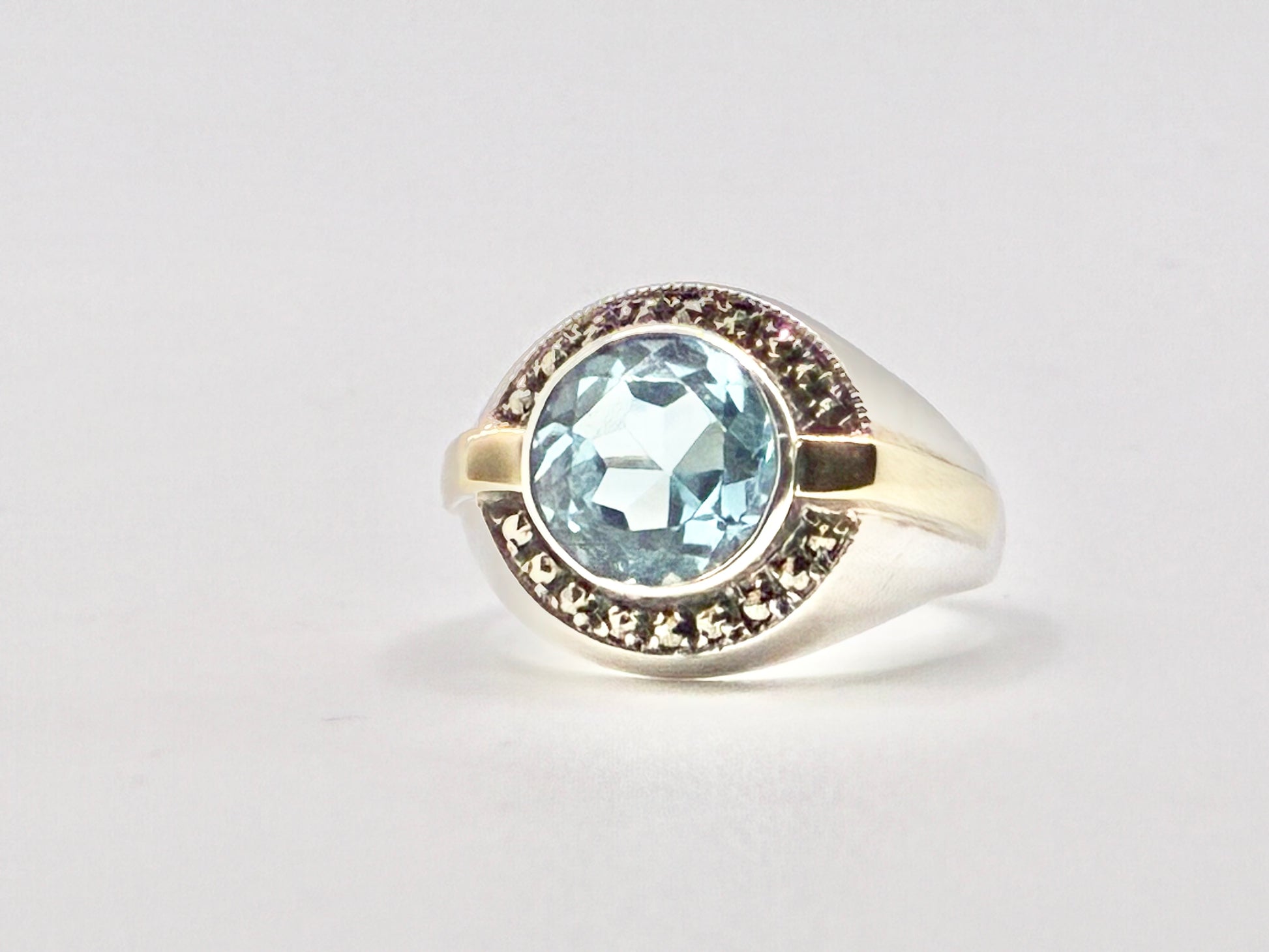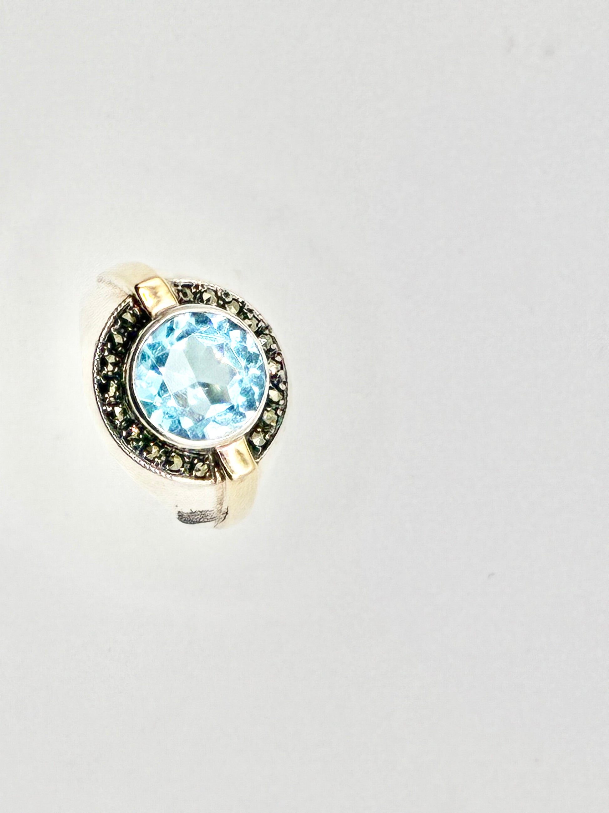 Elegant two-tone statement ring featuring a bright, oval faceted blue gemstone framed by a sparkling marcasite halo. Sleek sculpted shoulders are accented with solid 14K yellow gold inlays, all set on a polished 925 sterling silver band for striking contrast.
