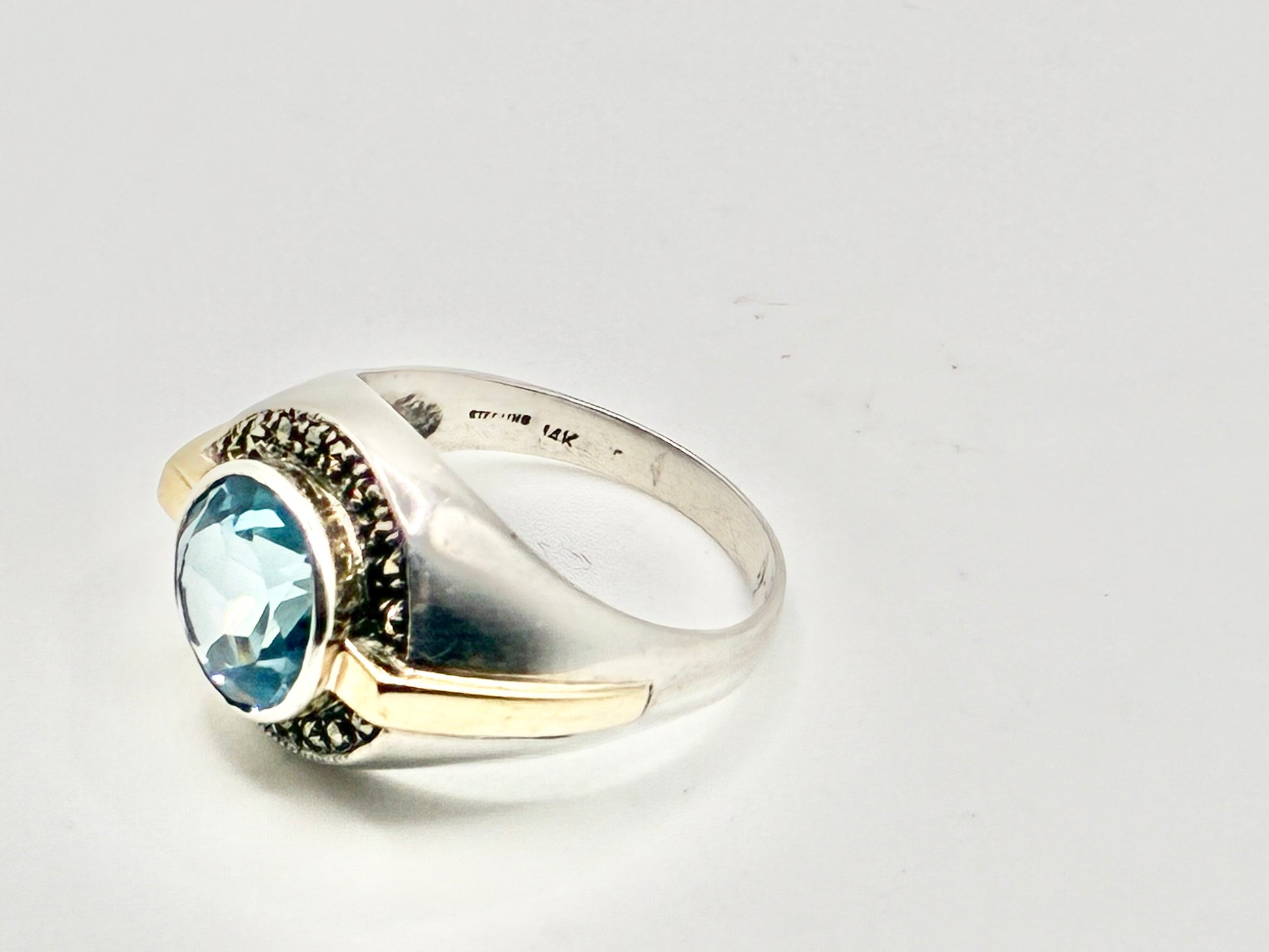Sterling Silver & 14K Gold Blue Gem Ring – Size 9.5