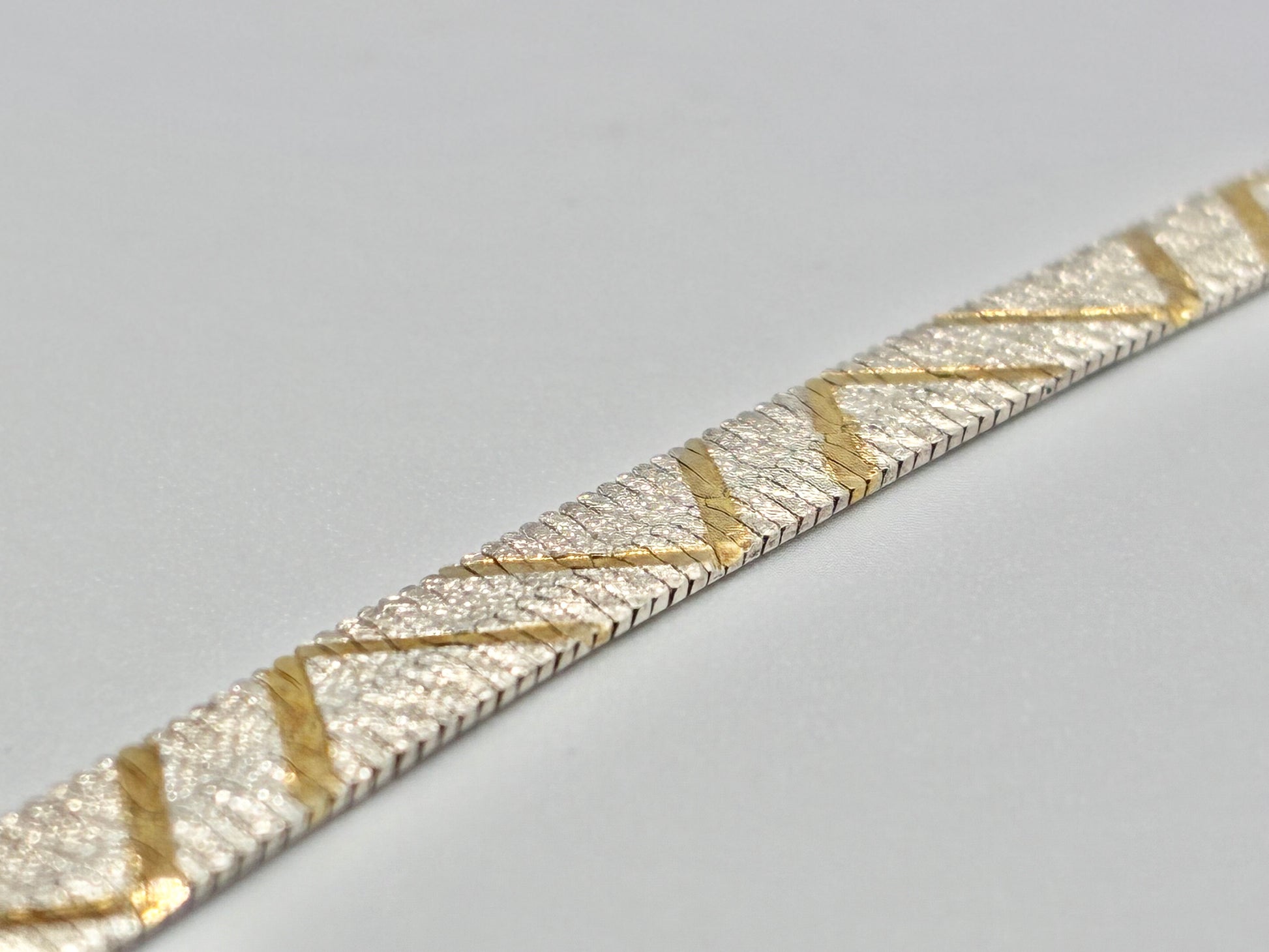 Sleek Italian-made bracelet in solid 925 sterling silver with two-tone detailing. The flat herringbone band is diamond-cut with diagonal yellow-gold accents that catch the light. Finished with a secure lobster clasp.