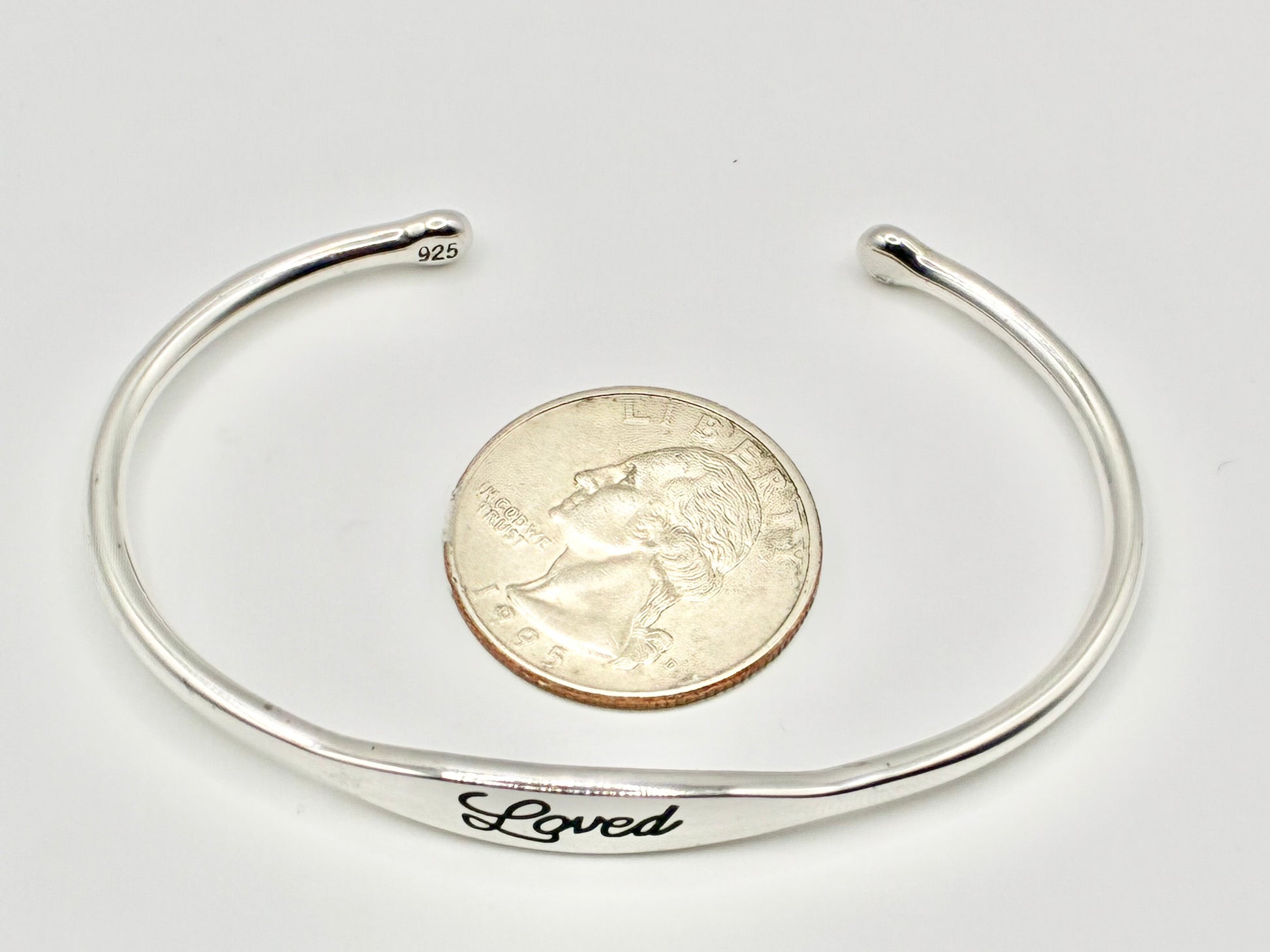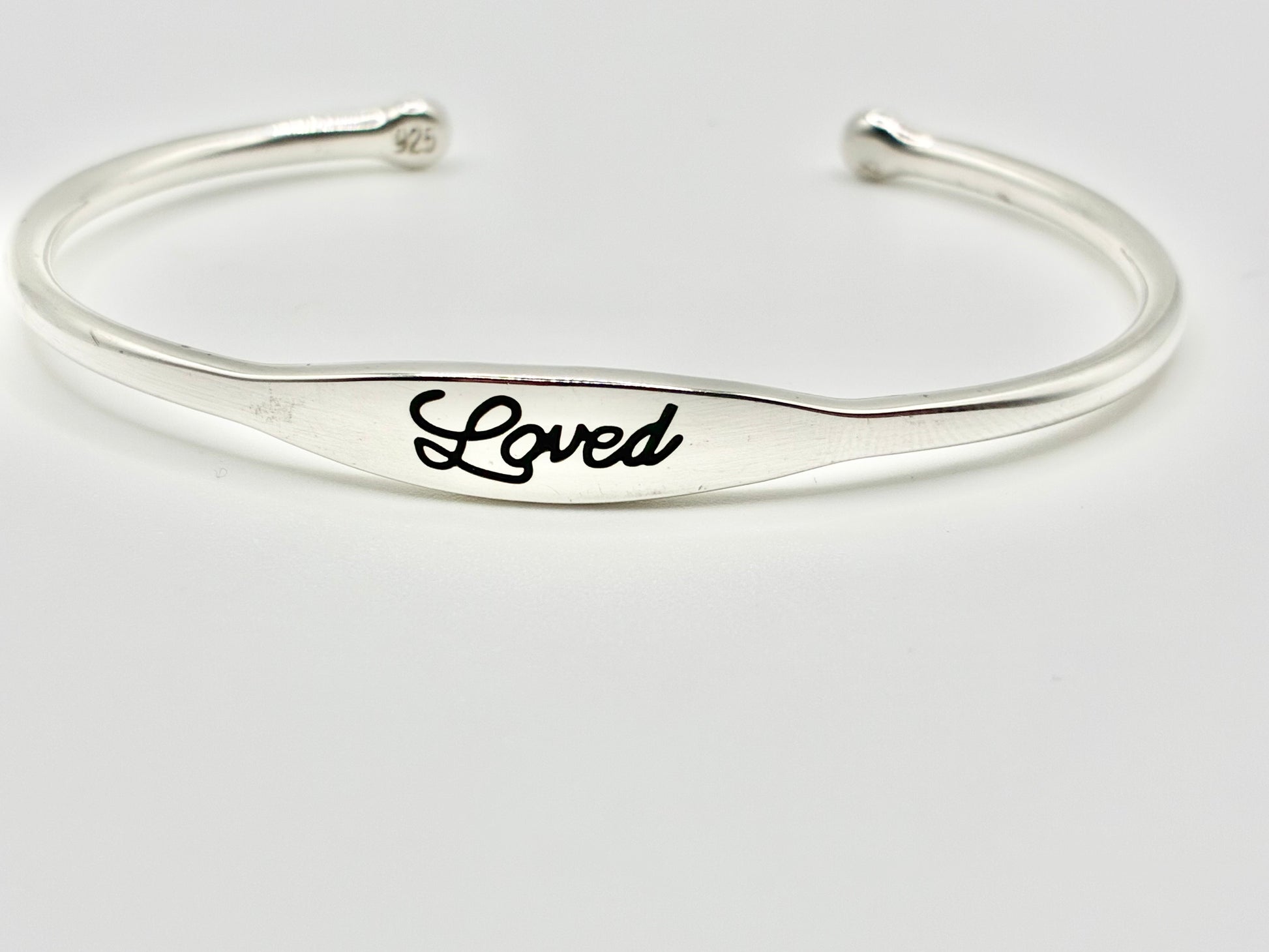 Style: Open cuff with script “Loved” front