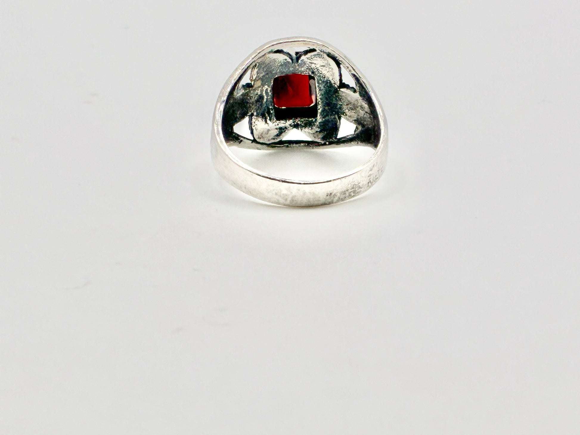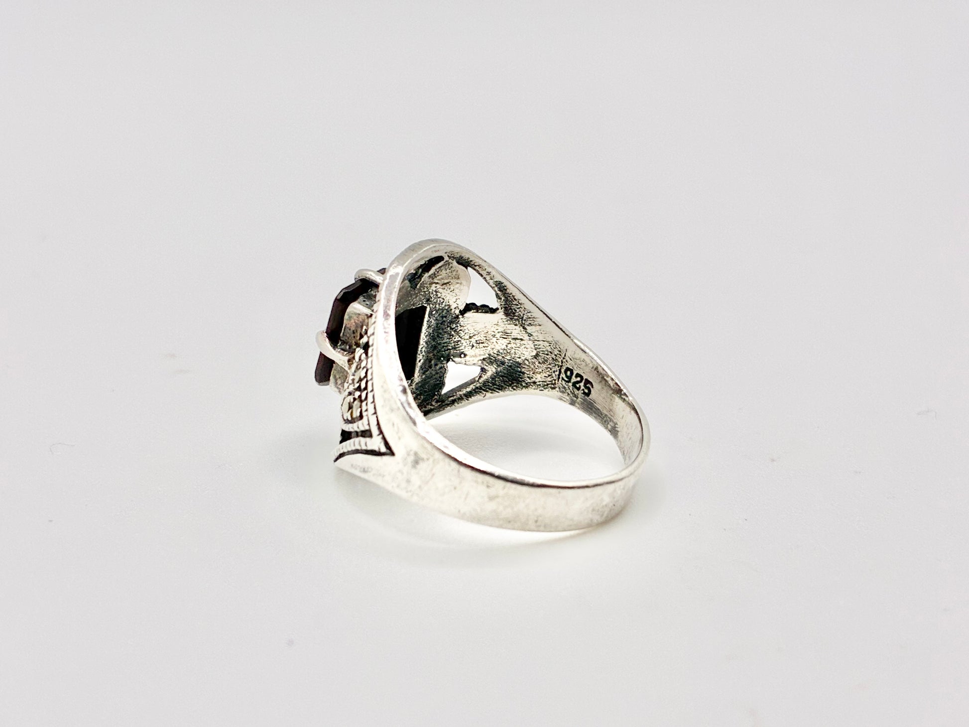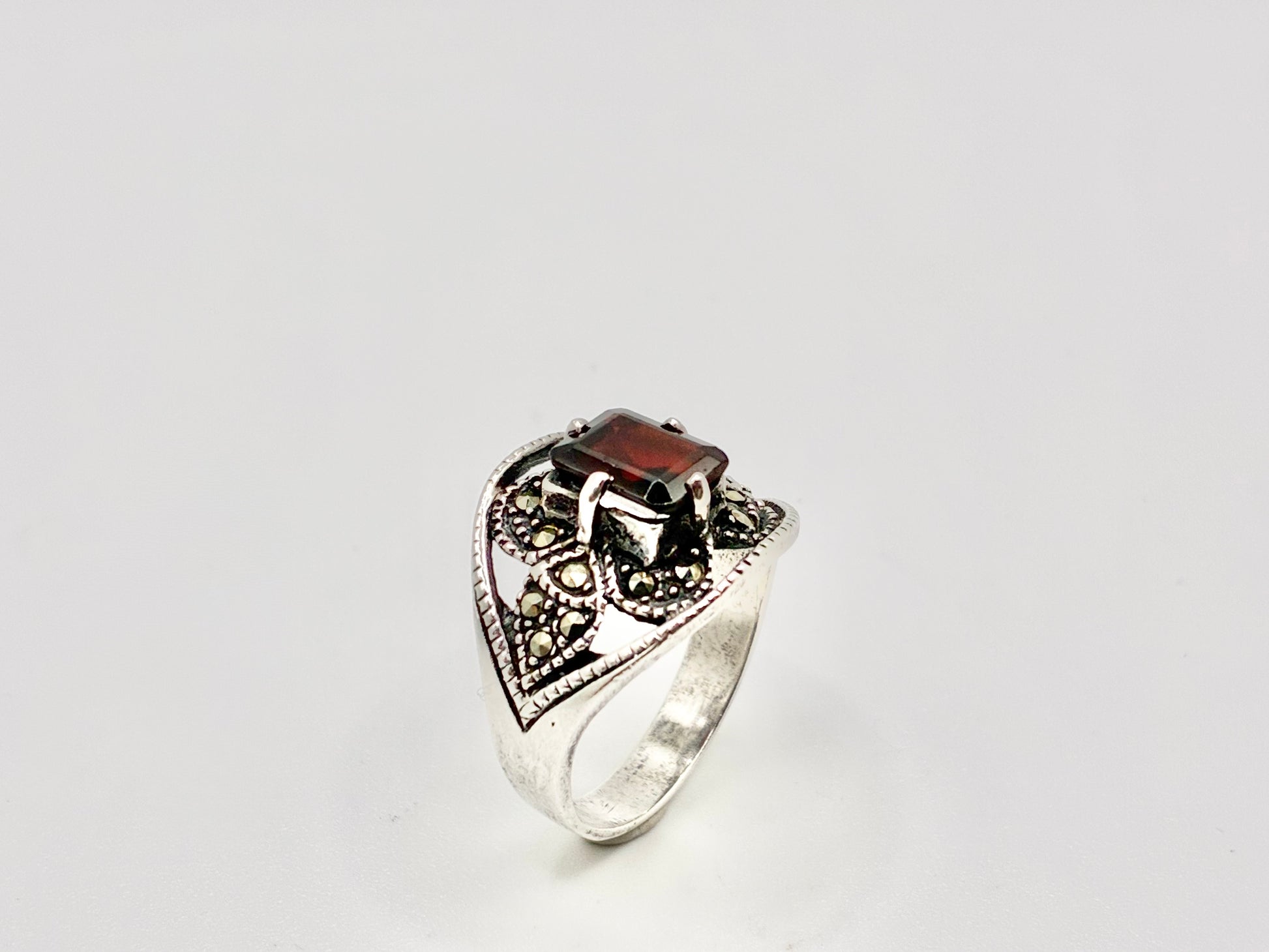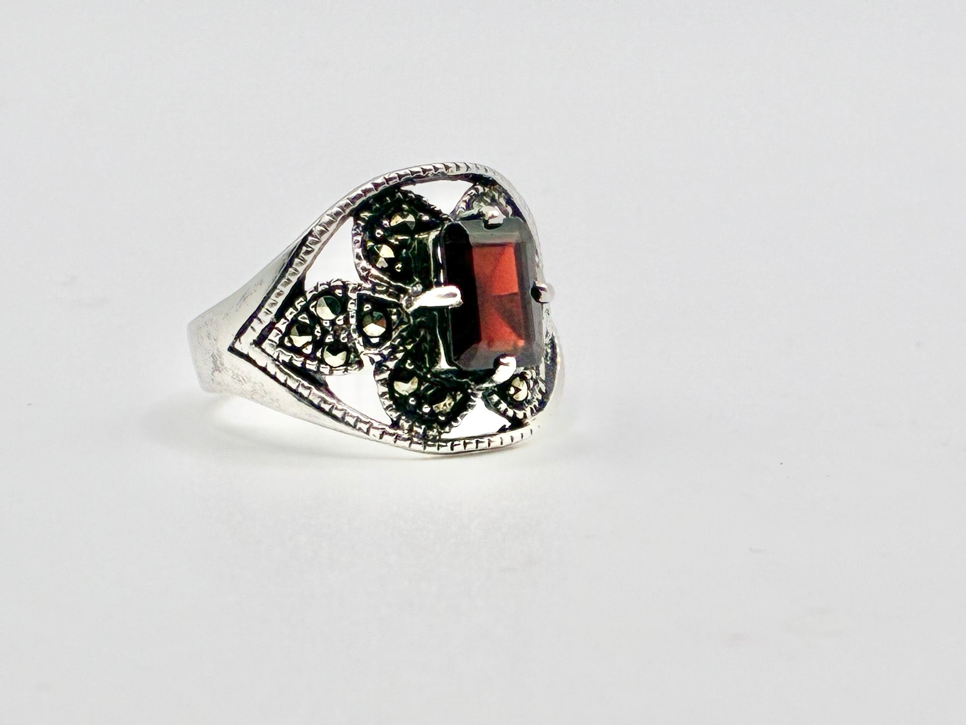 Elegant shield-style ring featuring an emerald-cut deep red center stone framed by sparkling marcasite clusters and a milgrain border. Openwork detailing and an oxidized backdrop add rich contrast, while the tapered band keeps it comfortable for all-day wear.