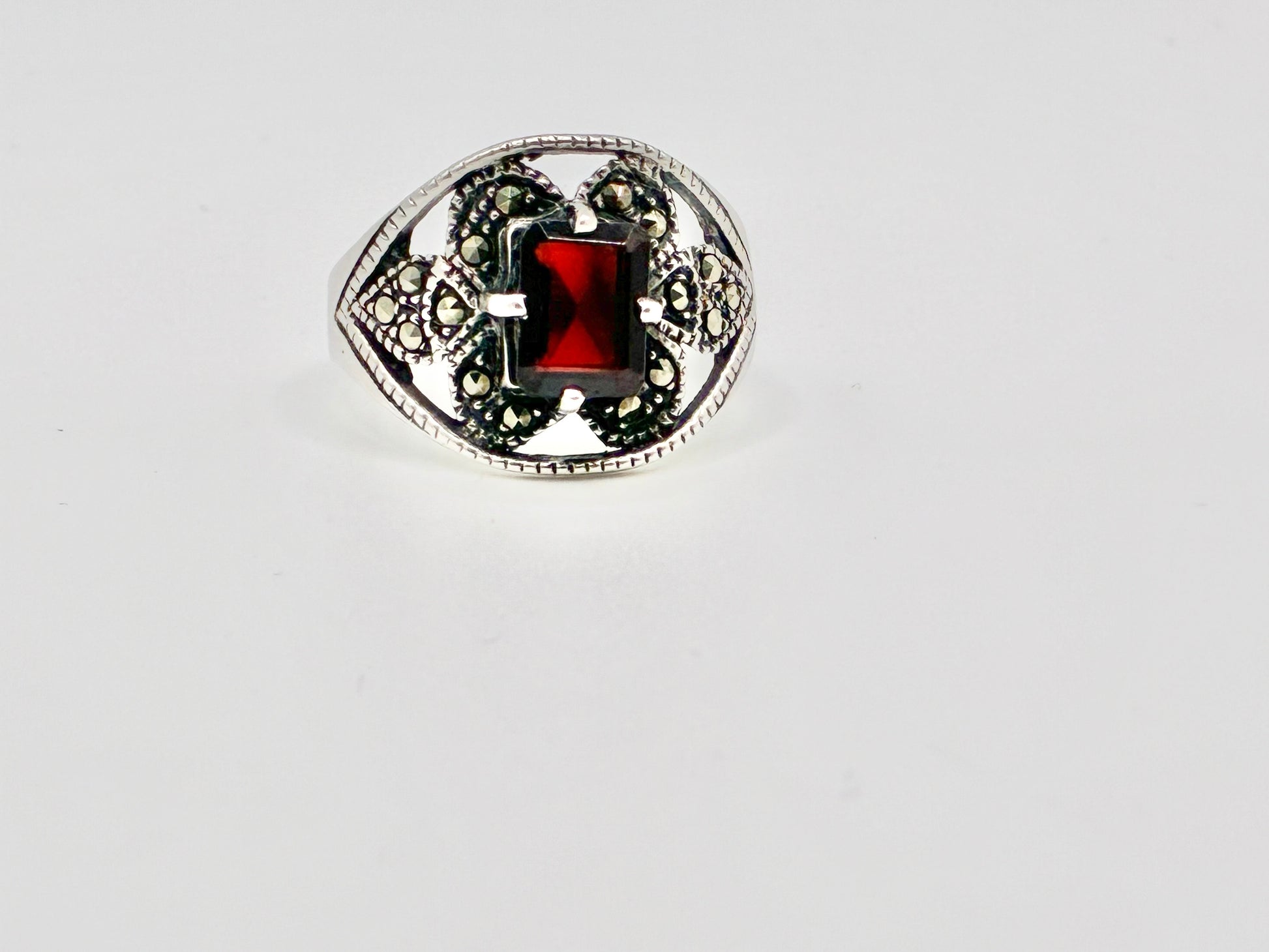 Sterling Silver 925 Marcasite & Red Stone Ring — Size 7.5