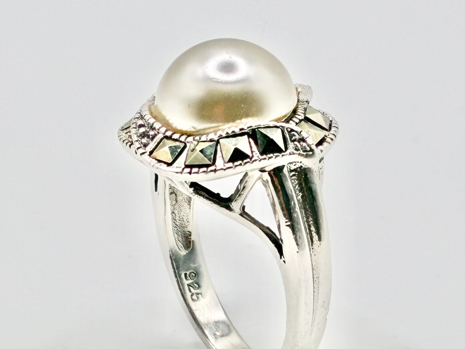 Stones: White pearl cabochon with marcasite accents (stone types not lab-verified)
