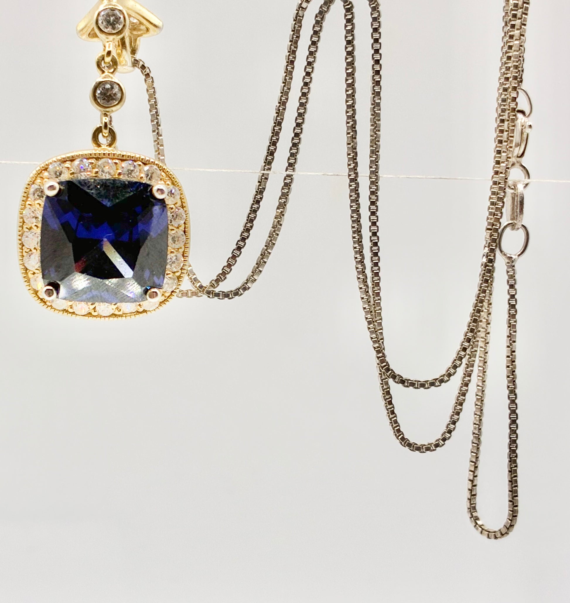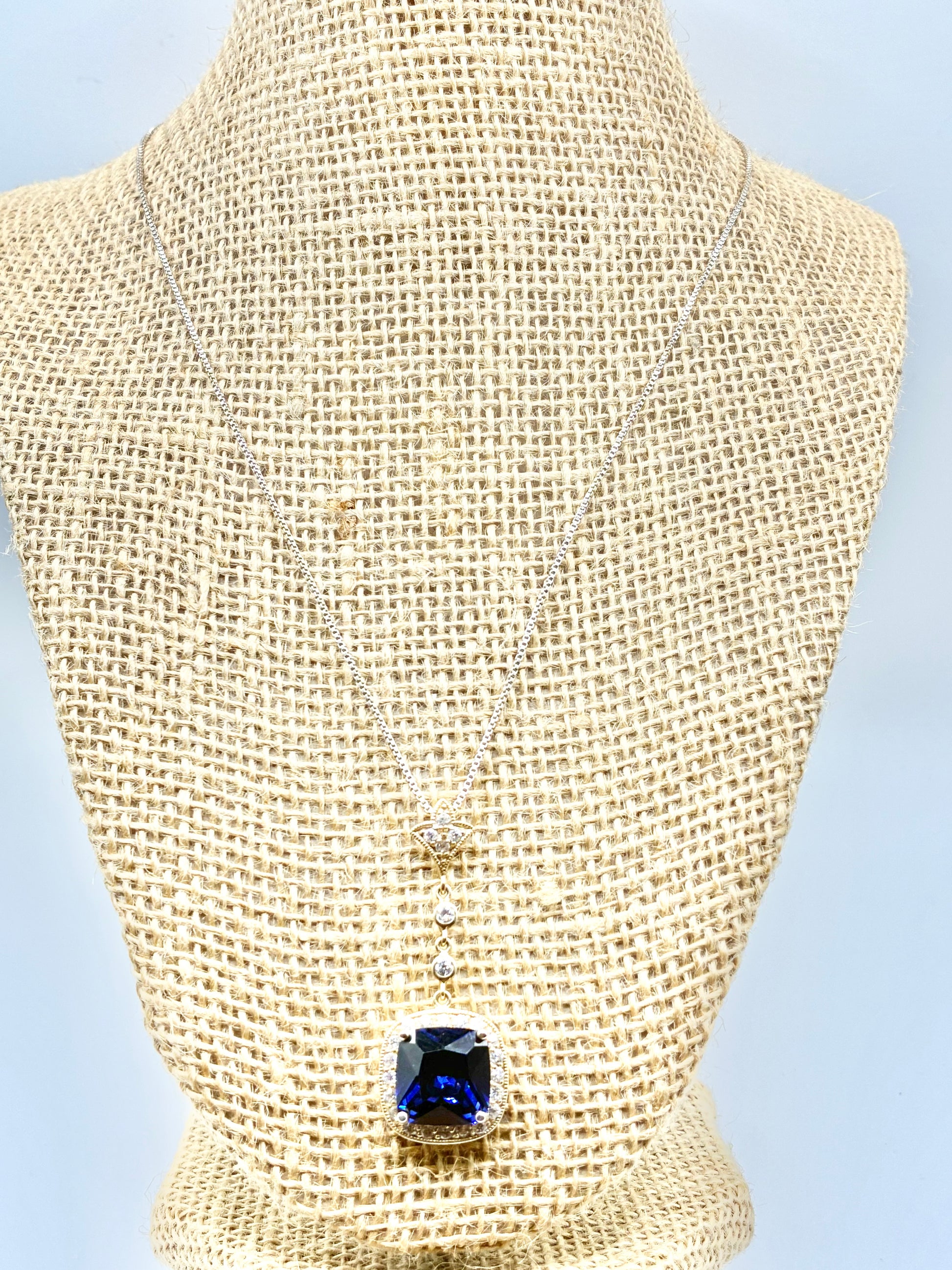 Glamorous, vintage-inspired sparkle. This pendant features a deep blue cushion-cut faceted stone in a four-prong halo setting, suspended from a trio of bezel-set clear stones and a decorative milgrain bail. It hangs from a fine Italian sterling silver box chain for a refined, ready-to-wear look.
