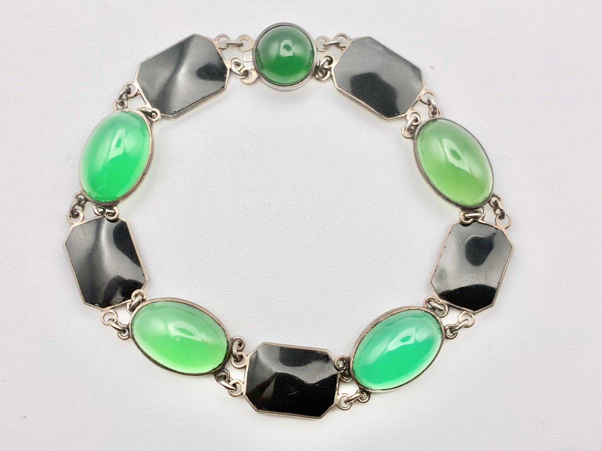 Striking panel-link bracelet featuring alternating glossy green oval cabochons and faceted black plaques set in sterling silver. The sleek contrast reads classic and elegant, perfect solo or stacked.