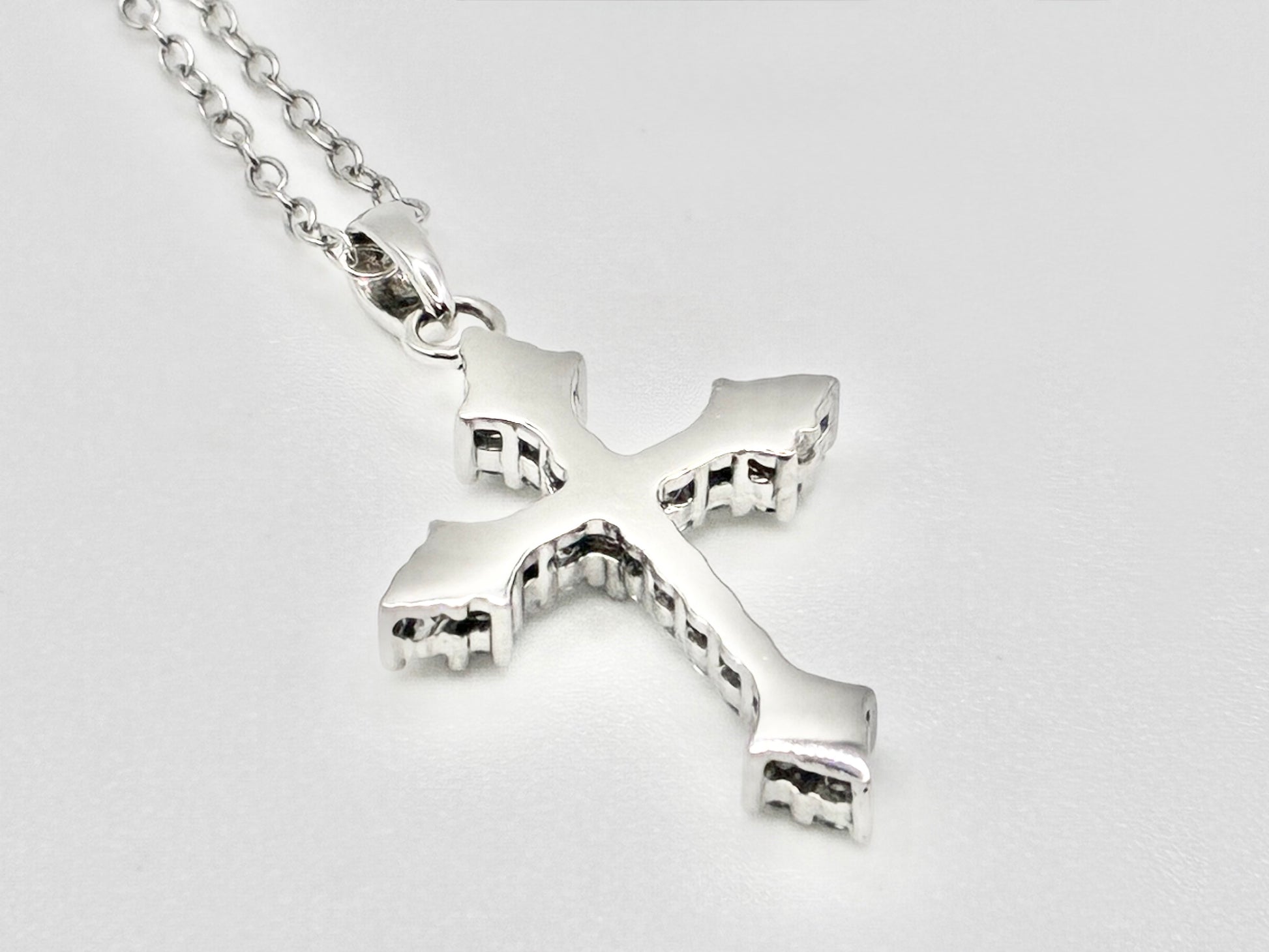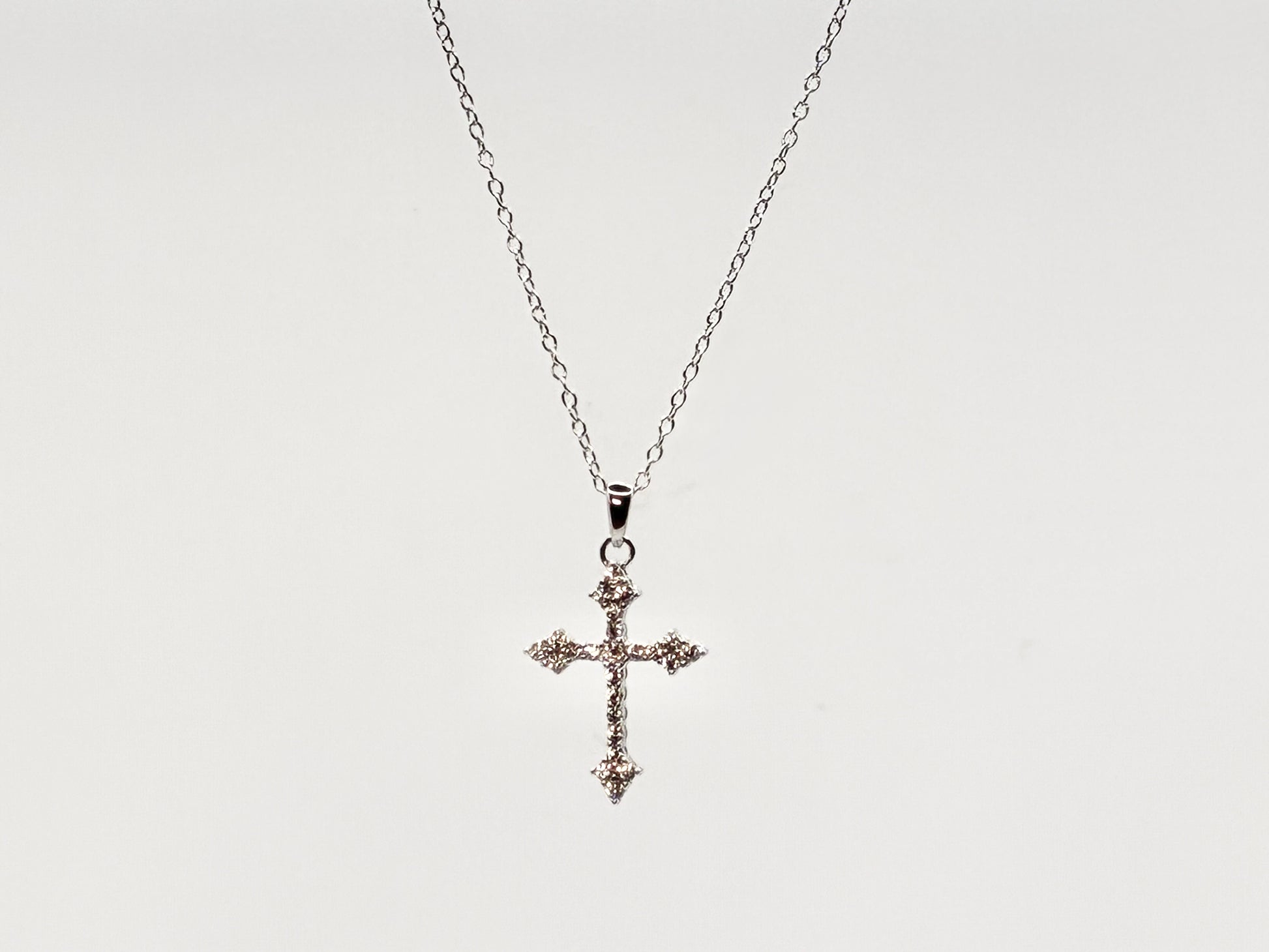 A delicate, light-weight cross pendant with sparkling clear accents on a fine sterling chain.