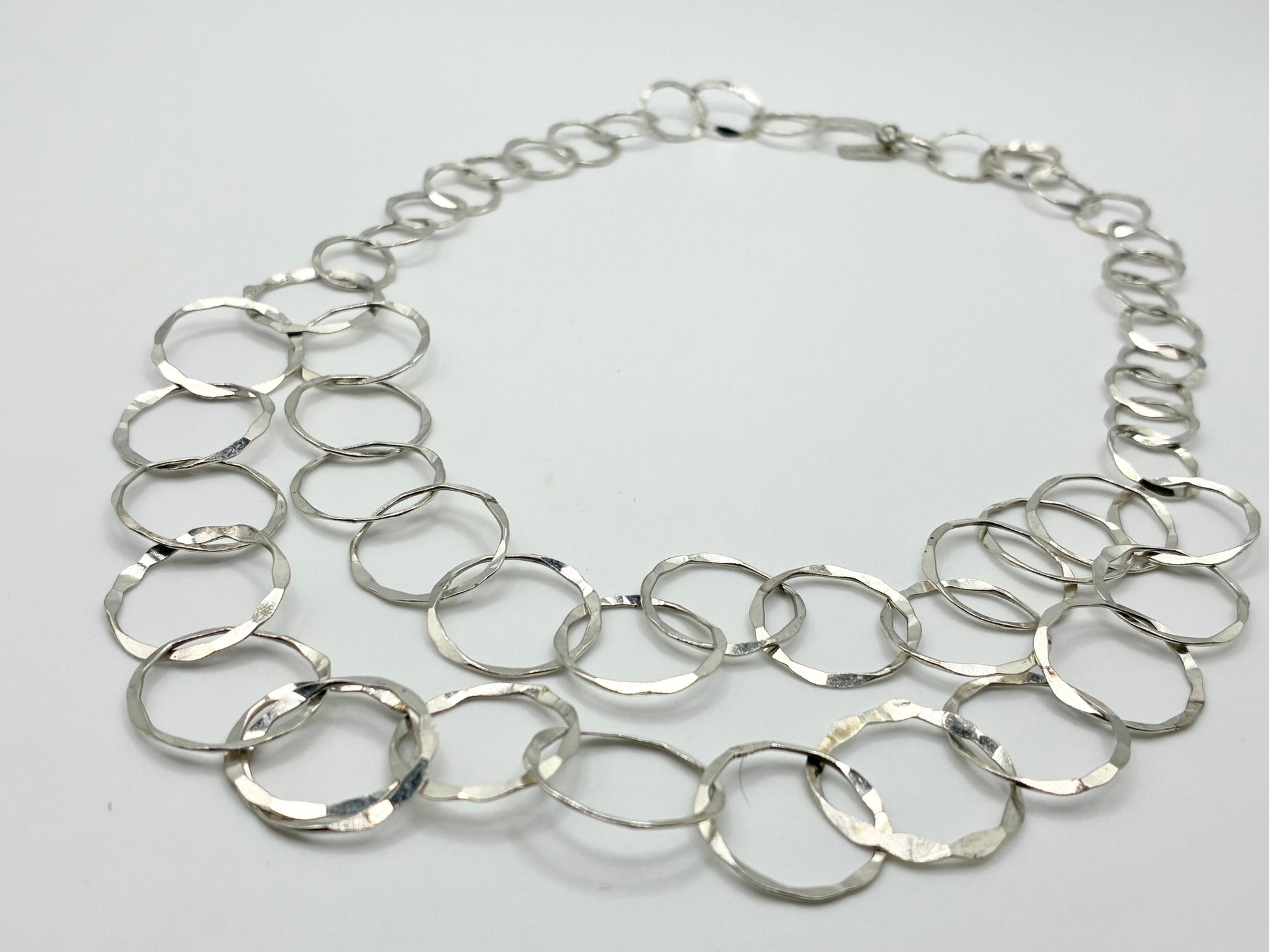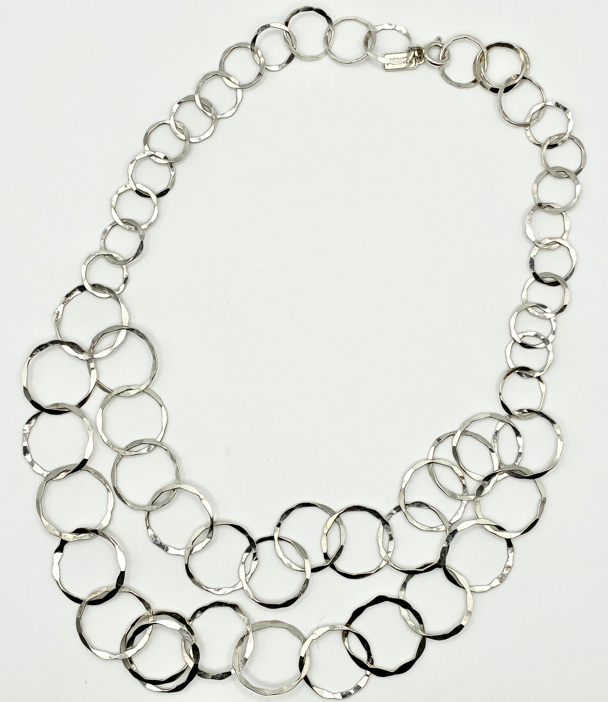 Modern, sculptural shimmer. This Finora 17" necklace features two graduated rows of open circle links with a lightly hammered texture that catches the light from every angle. It drapes beautifully along the collarbone for an airy, statement look that’s effortless with tees or cocktail dresses.