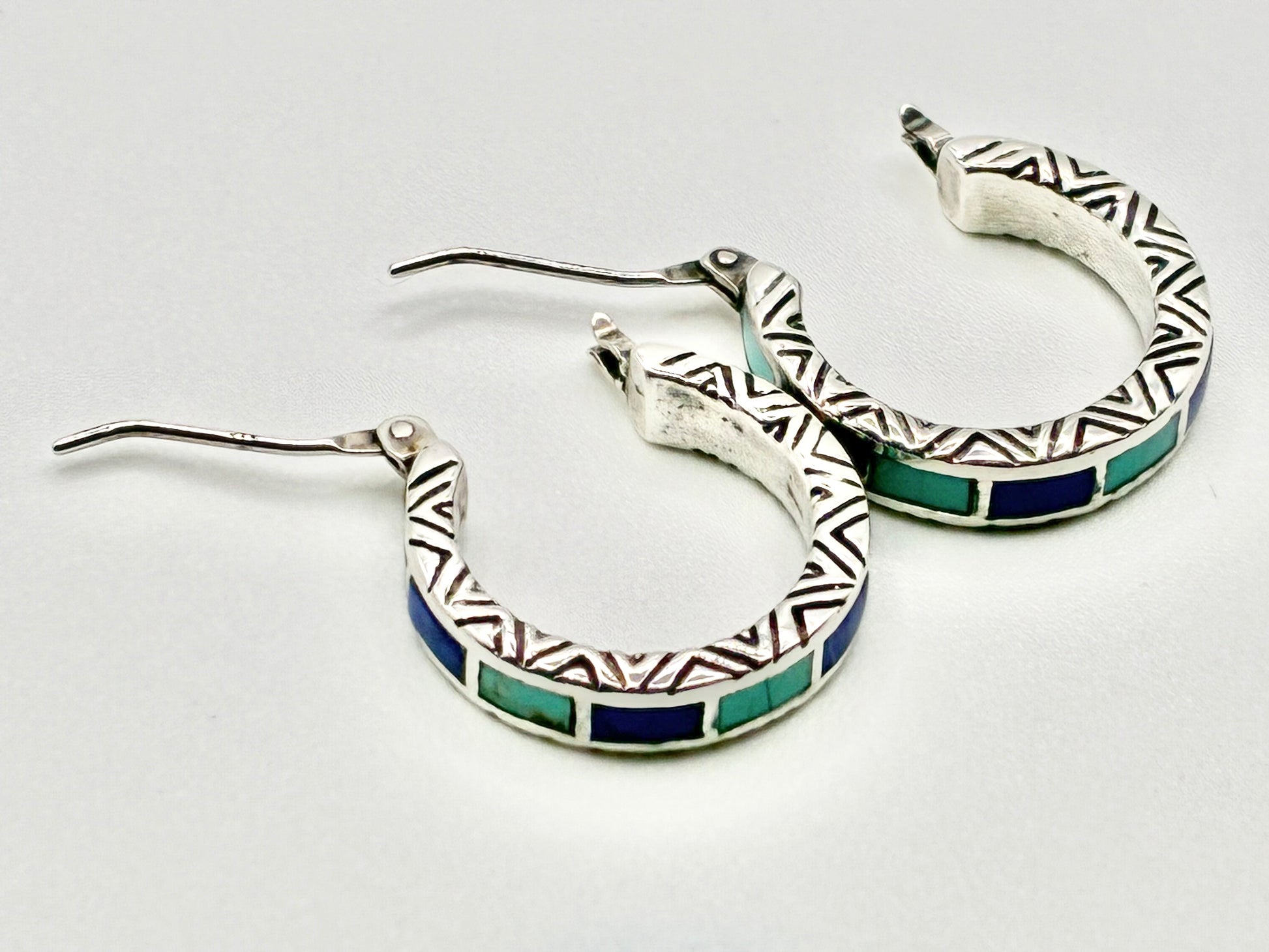 Small sterling hoops with etched geometric borders and blue/teal stone inlay across the front. Secure hinged latch-back closures.