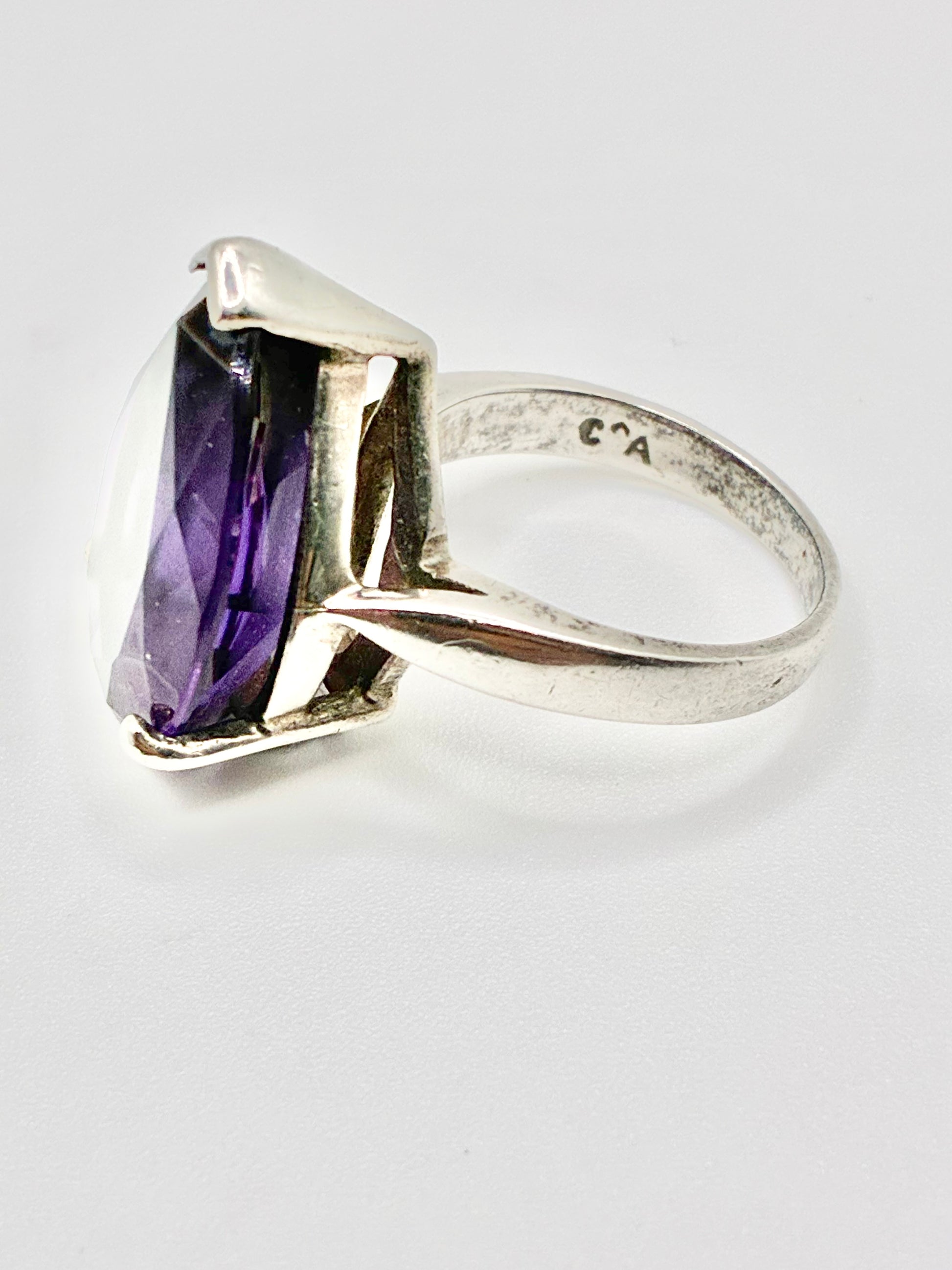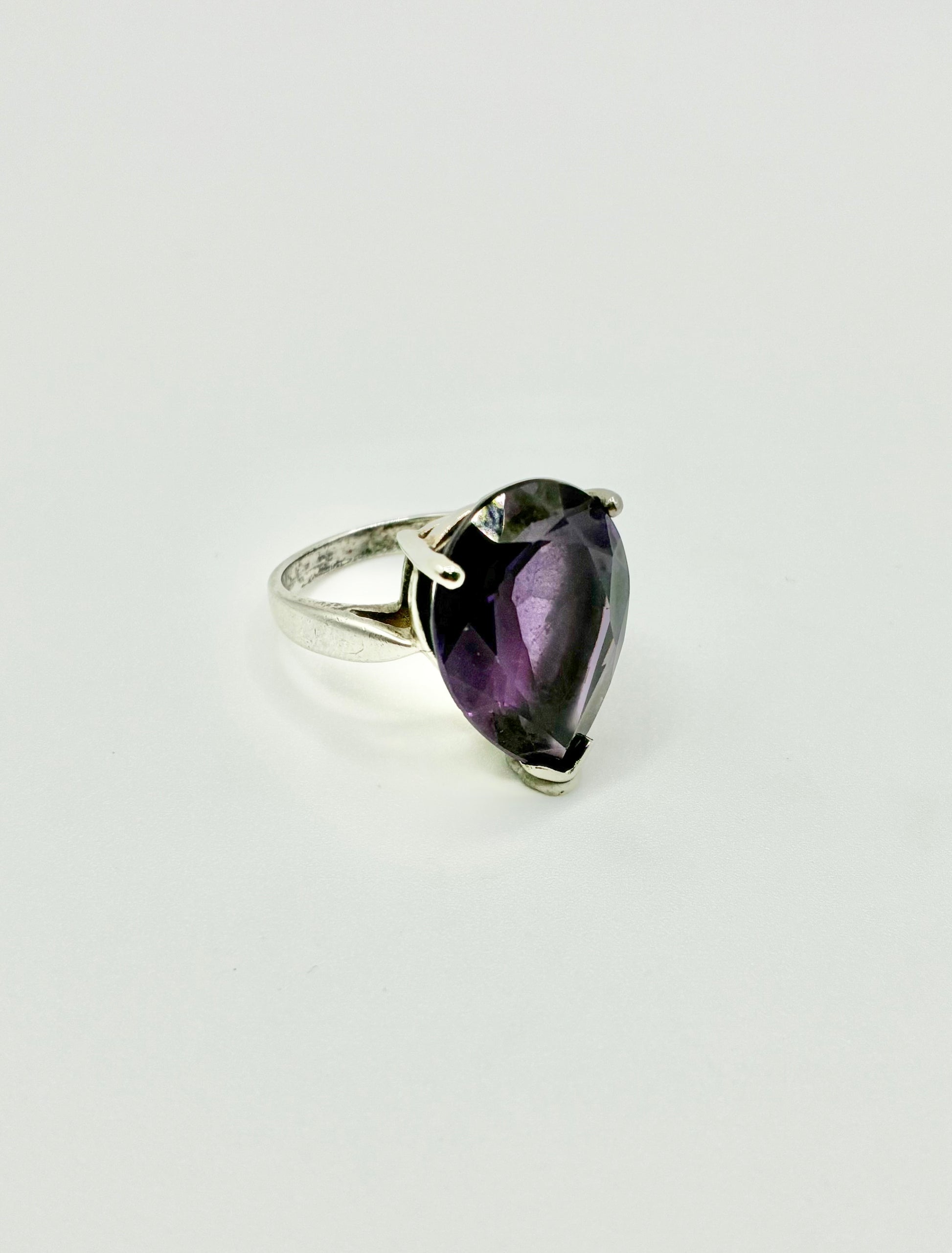A bold, elegant statement piece. This ring showcases a large pear-shaped purple faceted stone in a protective prong/V-tip setting on a smooth sterling silver band. The saturated, amethyst-hued sparkle makes it perfect as a cocktail ring or everyday pop of color.