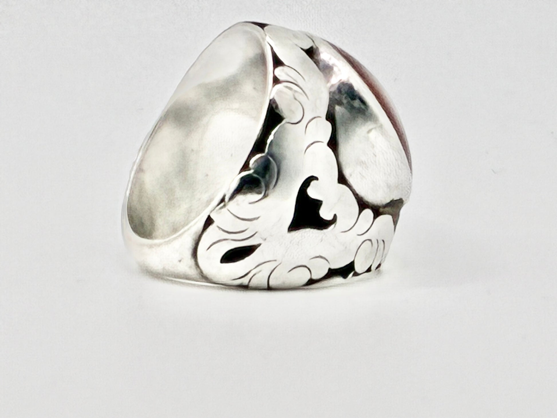 Bold and sculptural ring featuring a smooth round brown cabochon set in a raised bezel. The shoulders are decorated with engraved scroll/floral motifs and darkened (oxidized) recesses that make the pattern pop. A wide, tapered band gives it a solid, comfortable feel.
