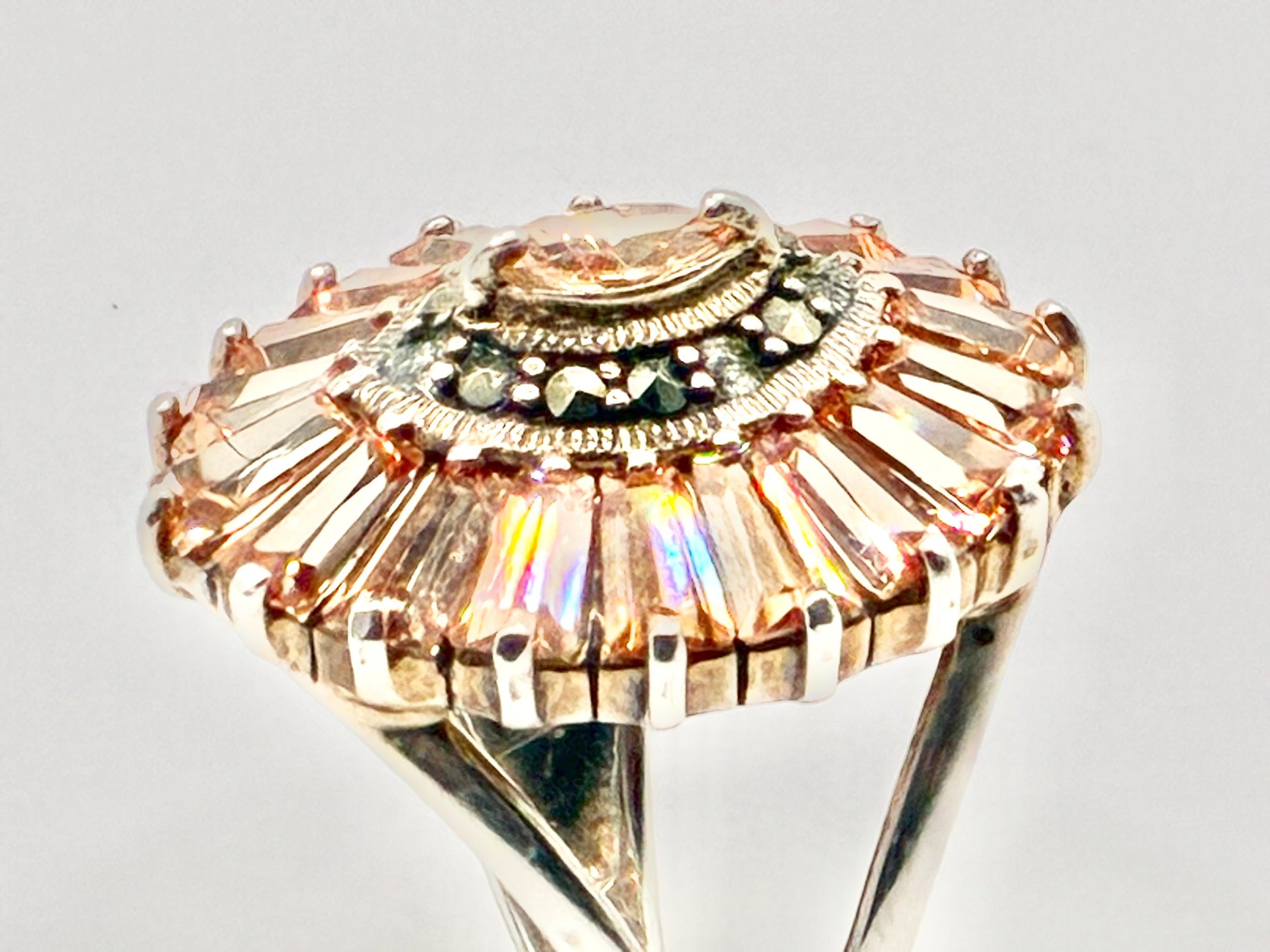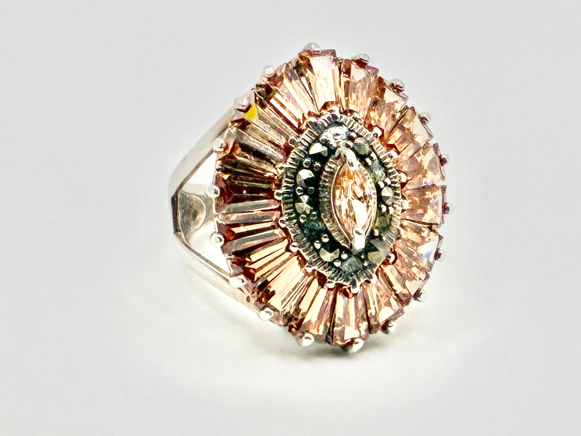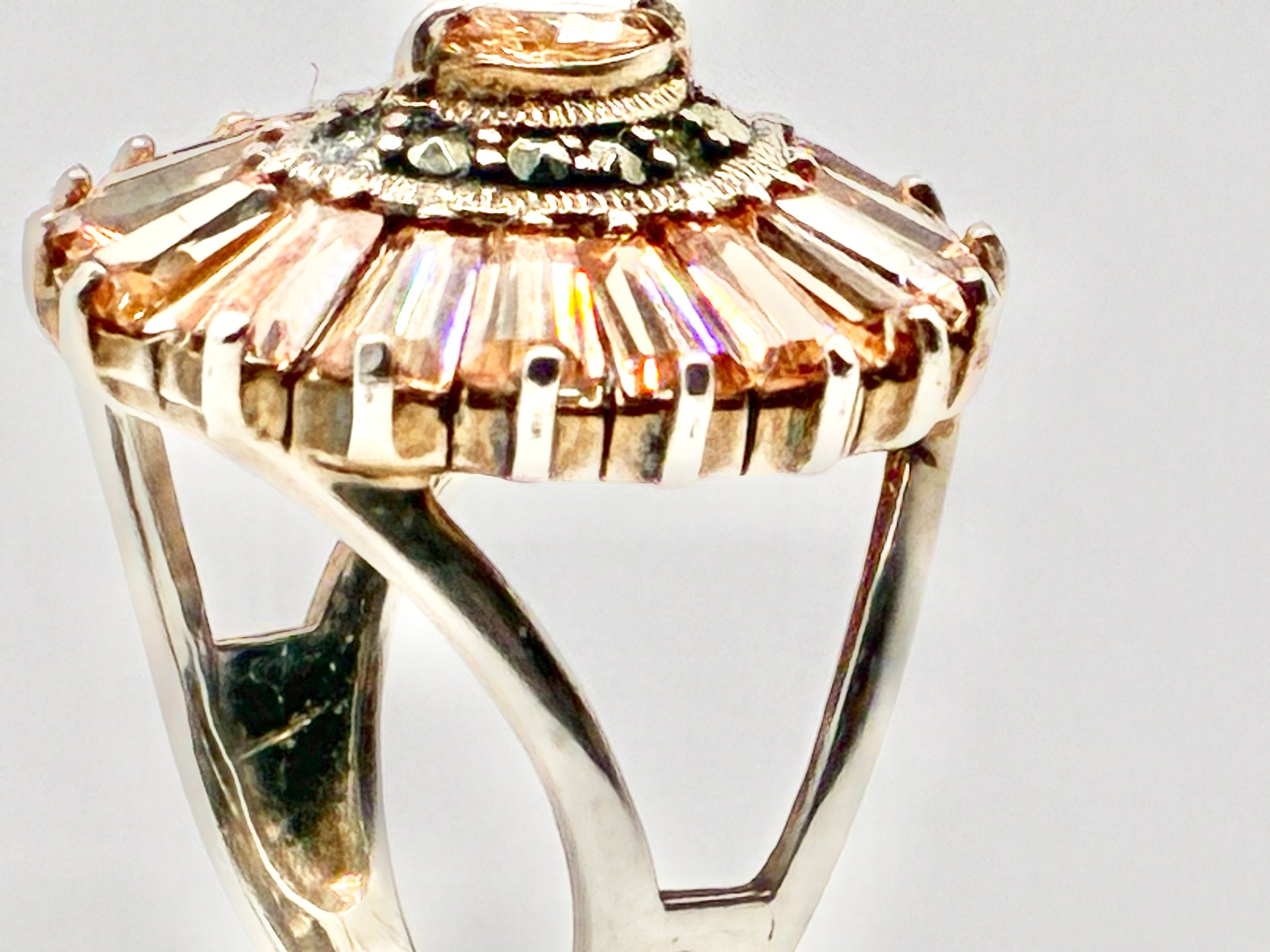 A bold statement ring with a dazzling, sunburst-style face. Graduated baguette-cut stones radiate from a raised, marquise-cut center, all prong-set in solid sterling silver. Openwork gallery and split shoulders add lift and light, letting the facets sparkle from every angle.