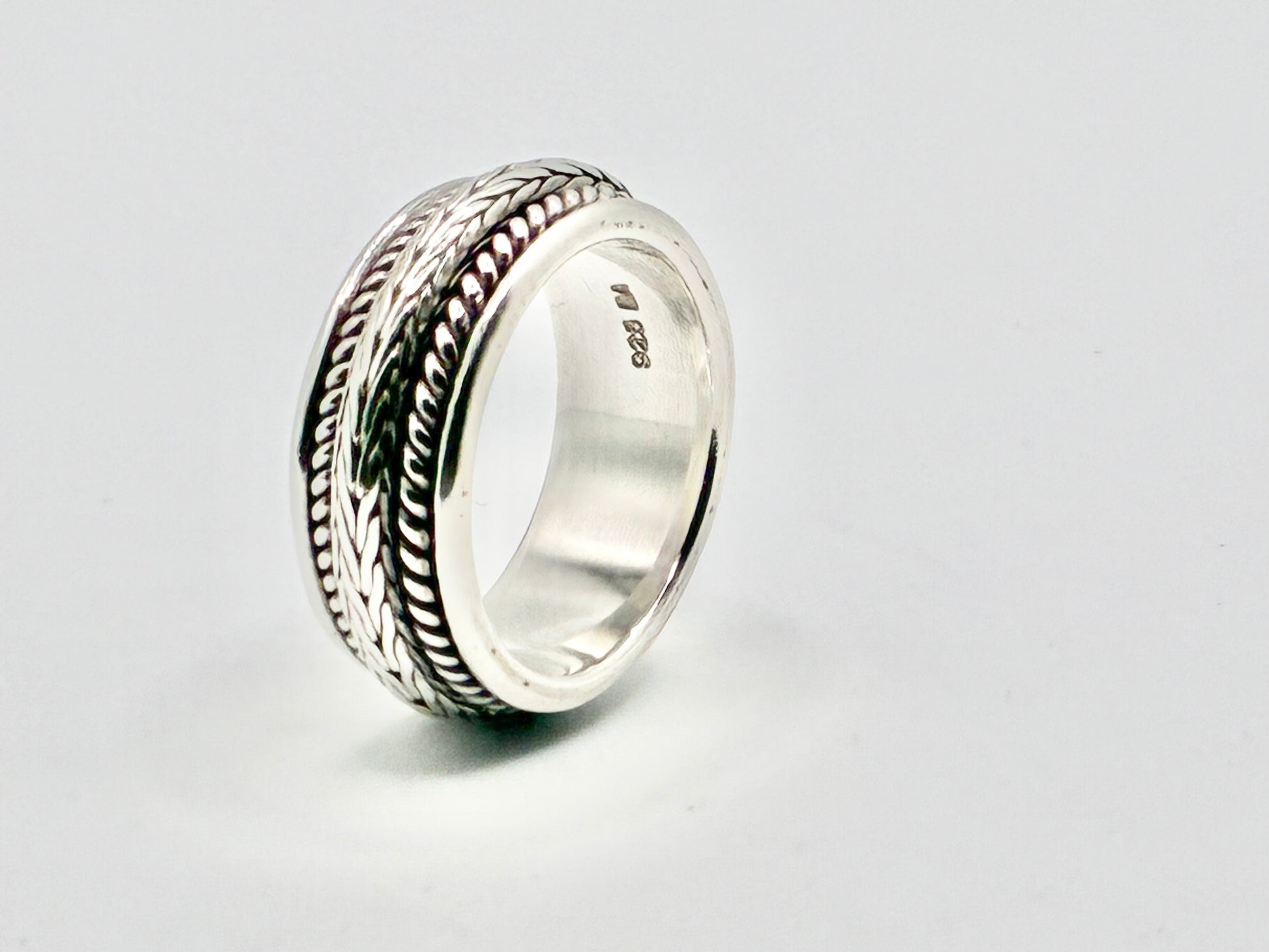 Artisan-crafted ring from Suarti (Bali) featuring a raised wheat-braid center band that spins smoothly between rope-edge borders. Oxidized detailing adds depth to the pattern, and the inside is a comfortable, rounded fit—perfect for mindful fidgeting or everyday style.