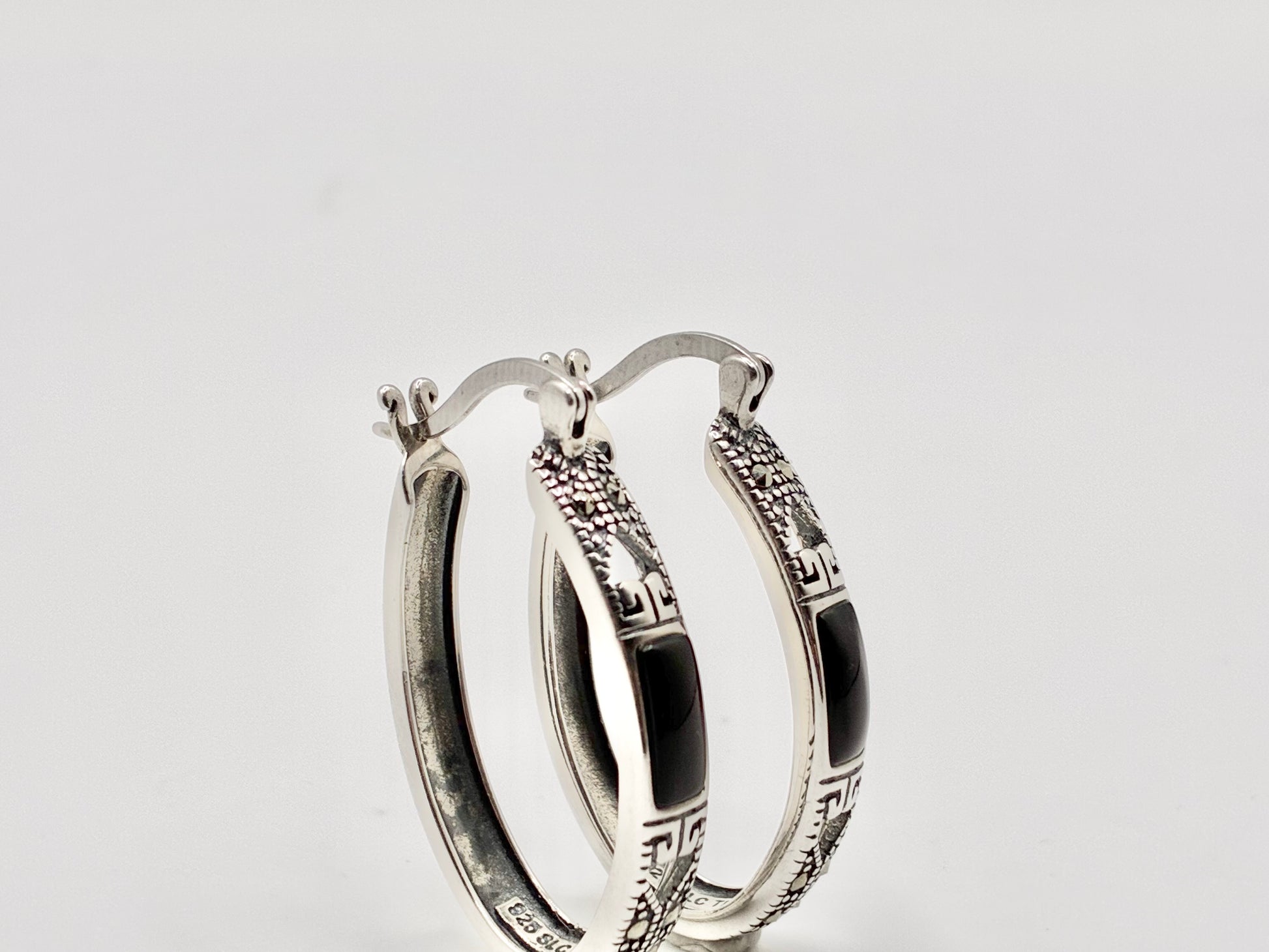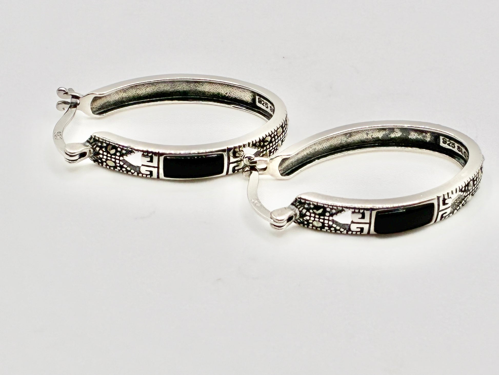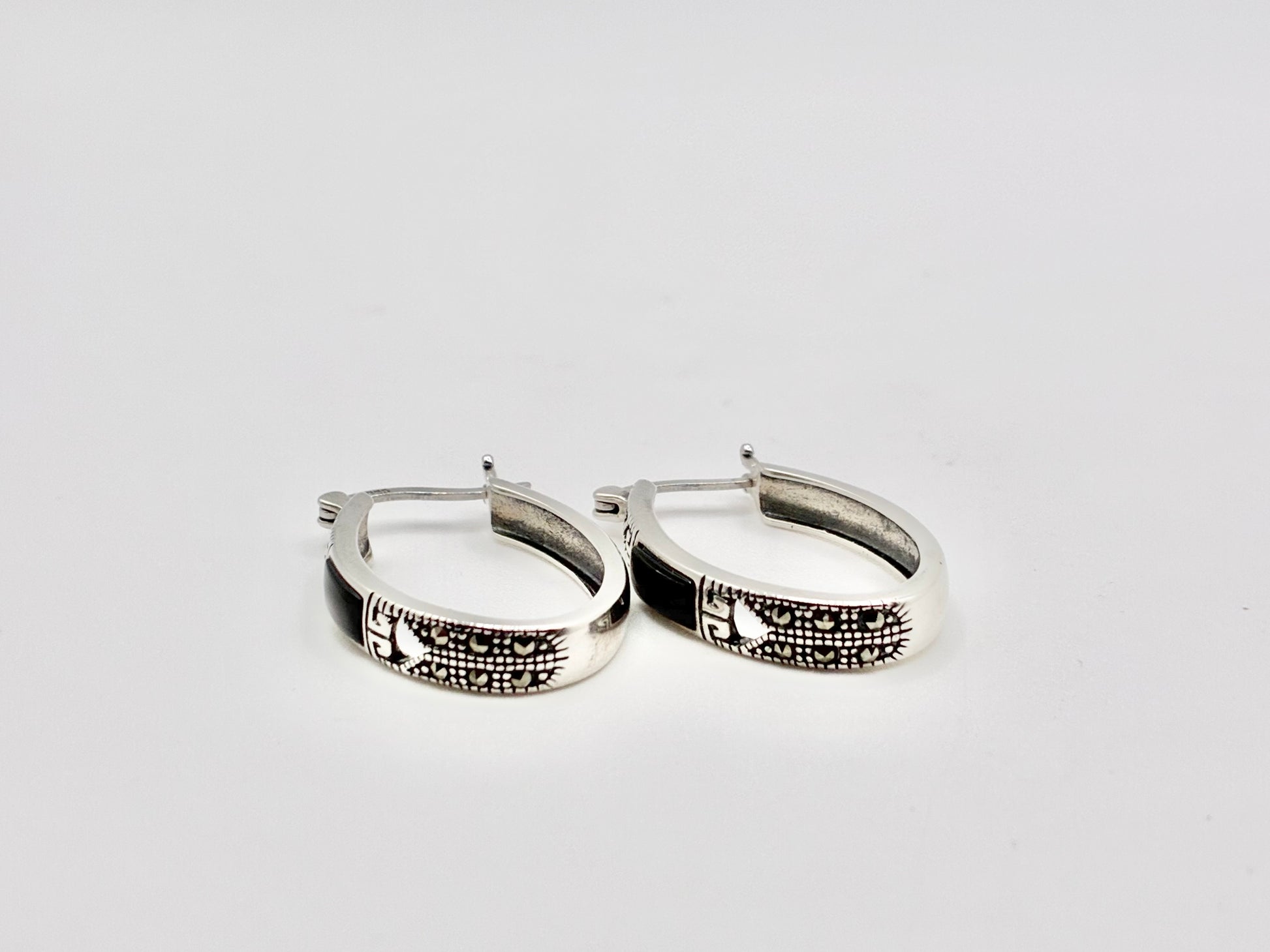 Elegant oval huggies featuring a smooth black onyx center framed by sparkling marcasite and geometric, oxidized detailing. Crafted in sterling silver for a polished two-tone shimmer and everyday wear.