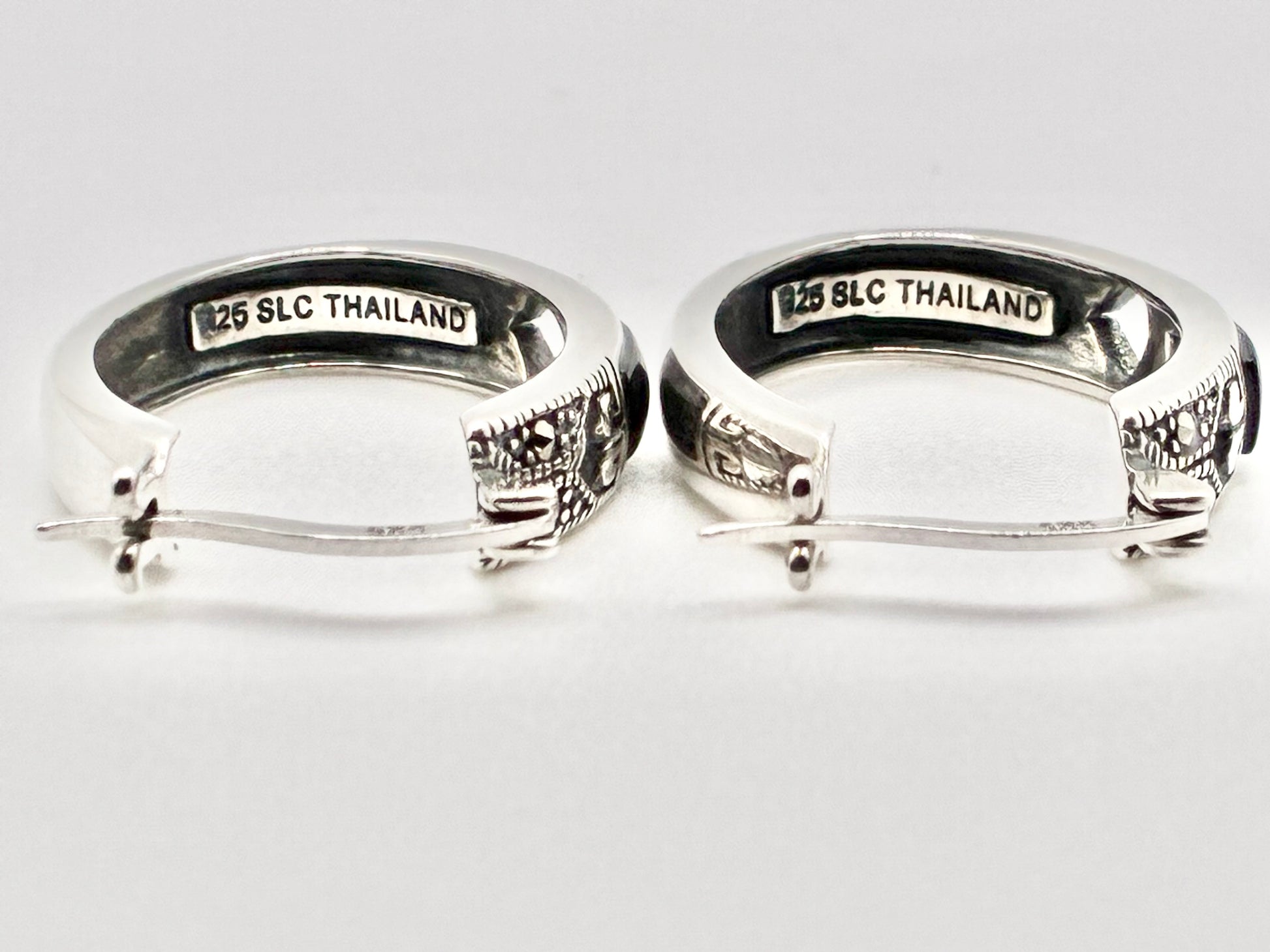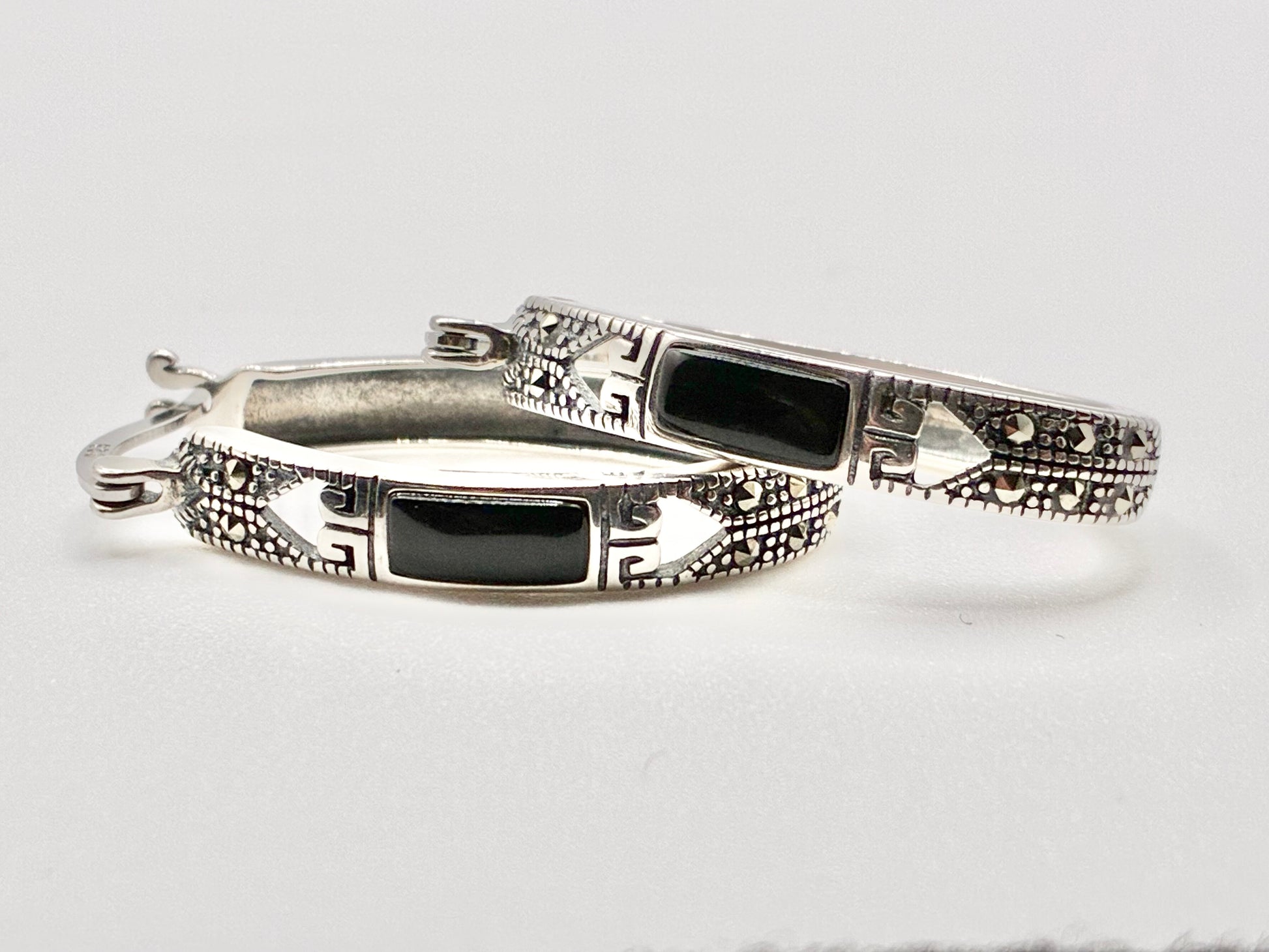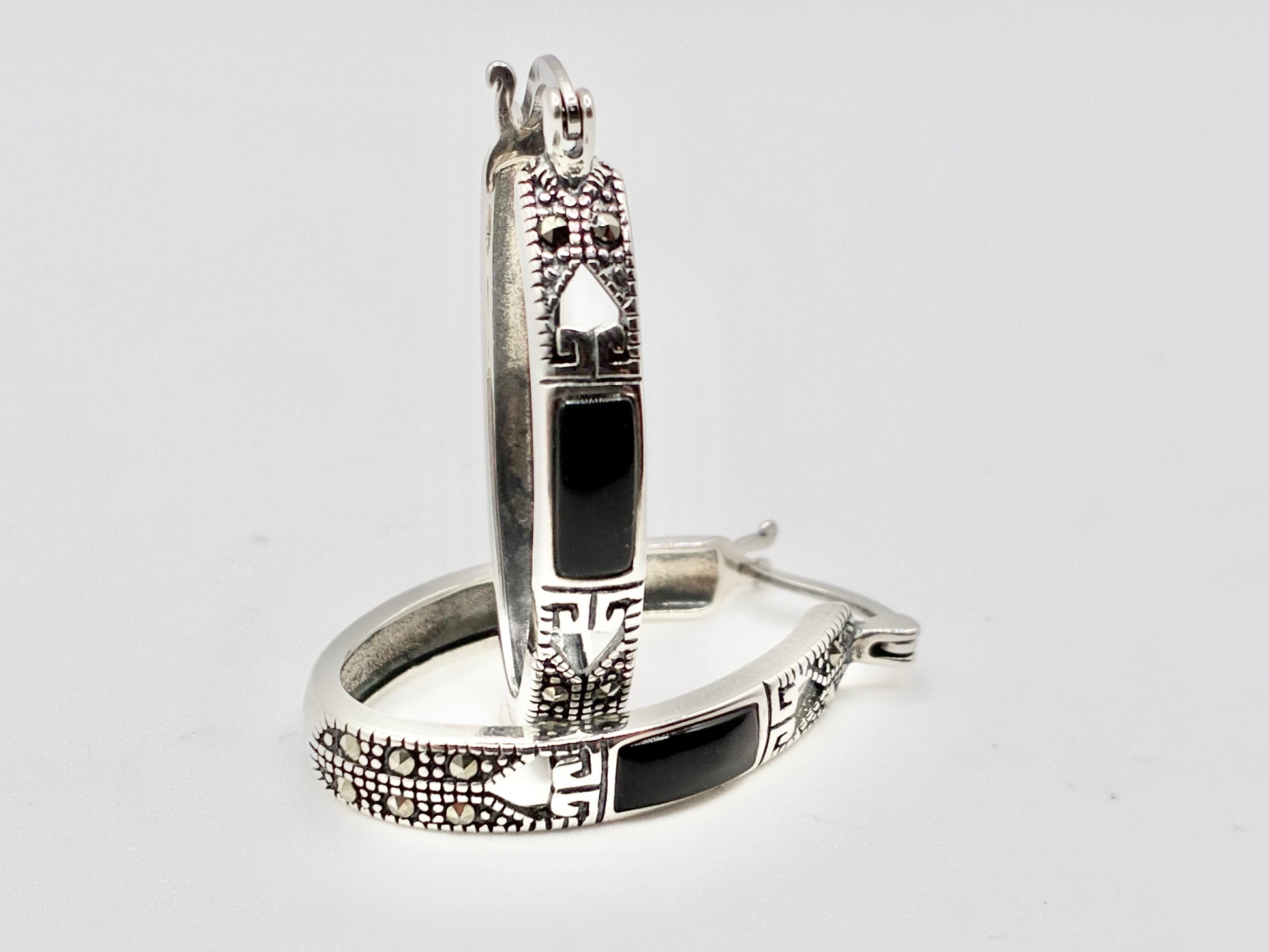 Elegant oval huggies featuring a smooth black onyx center framed by sparkling marcasite and geometric, oxidized detailing. Crafted in sterling silver for a polished two-tone shimmer and everyday wear.