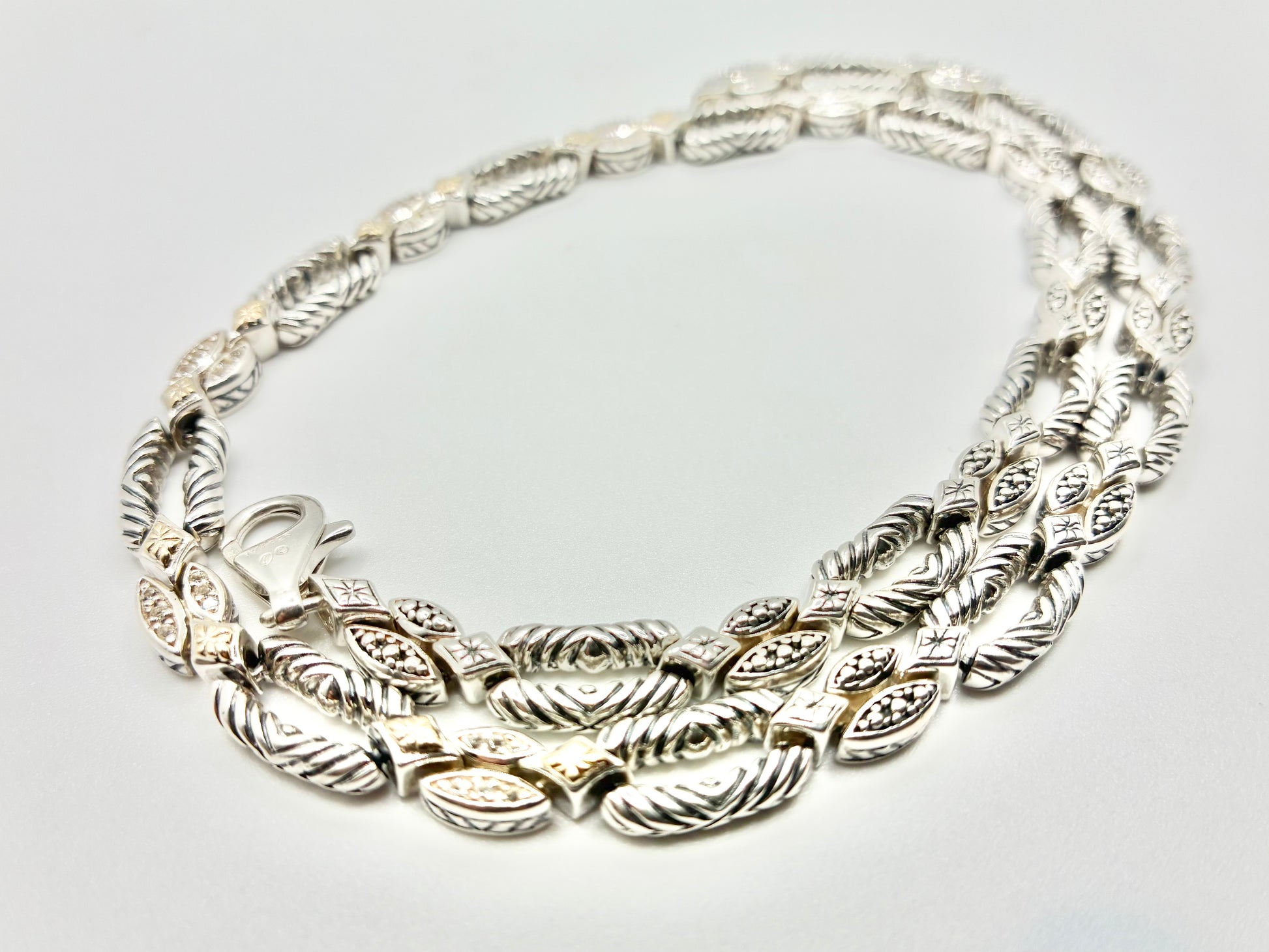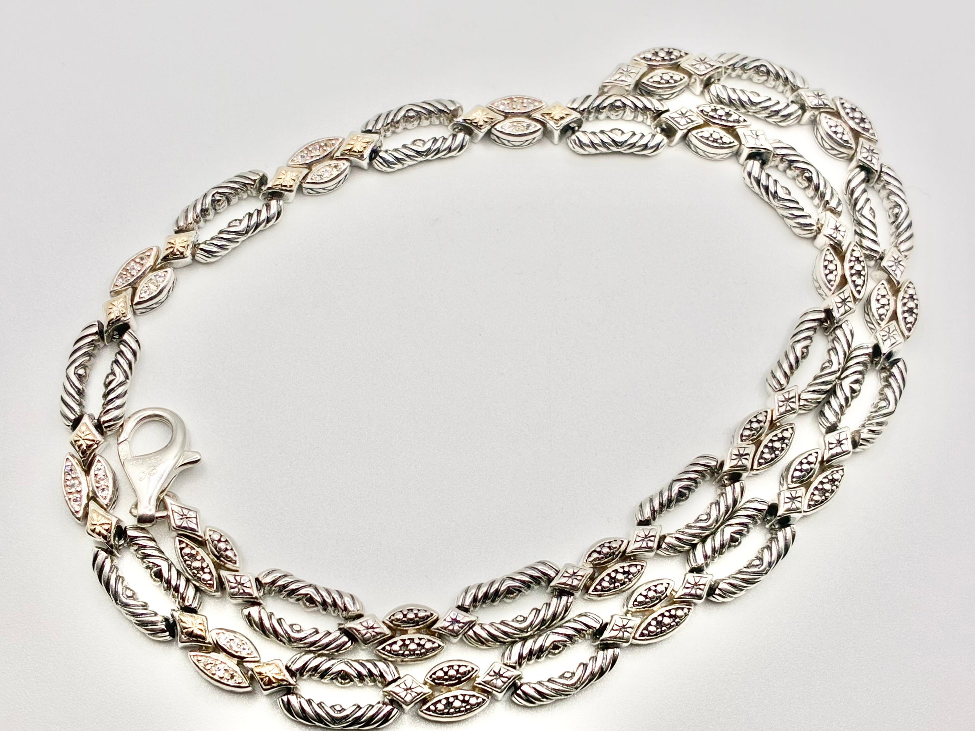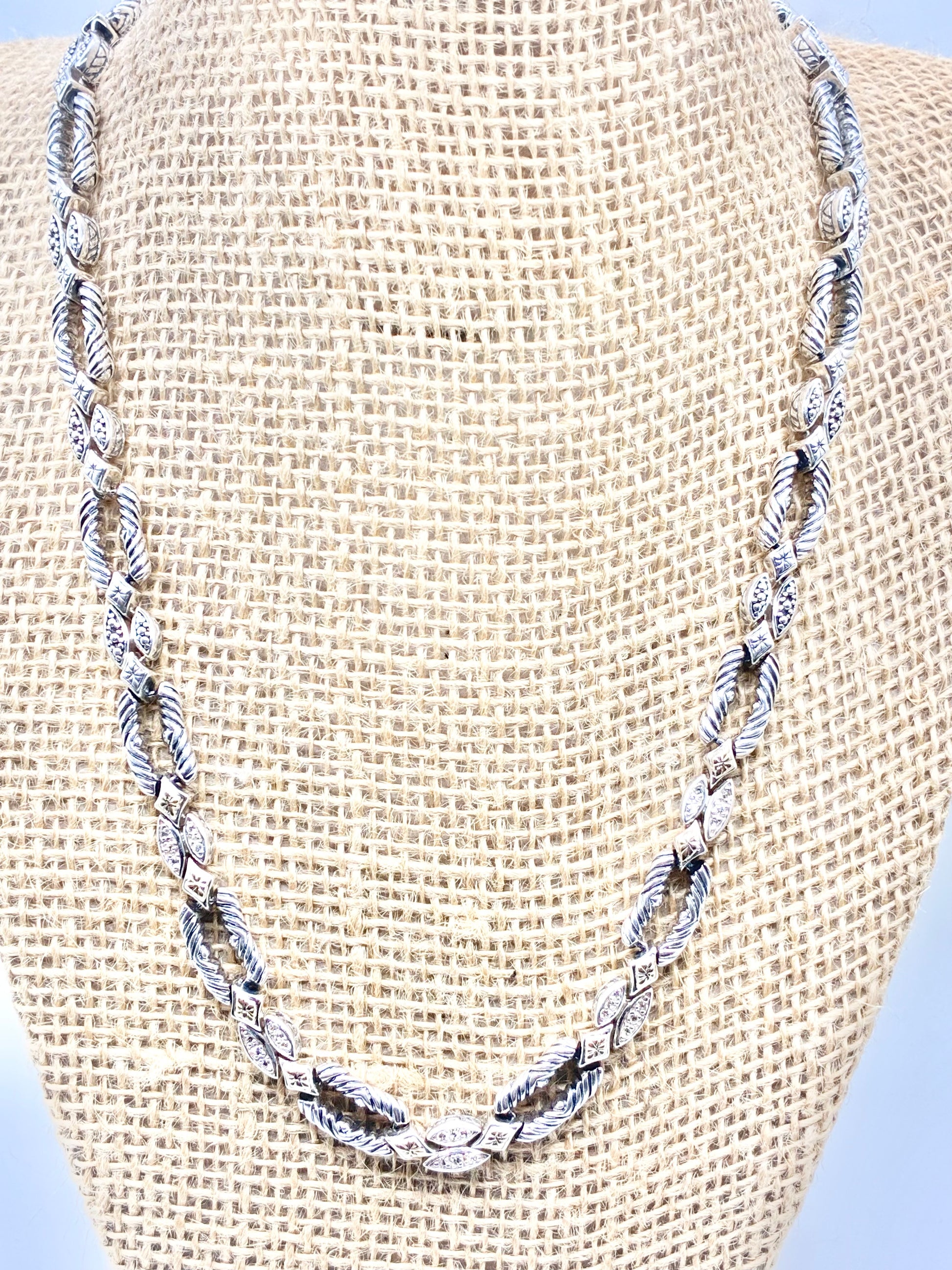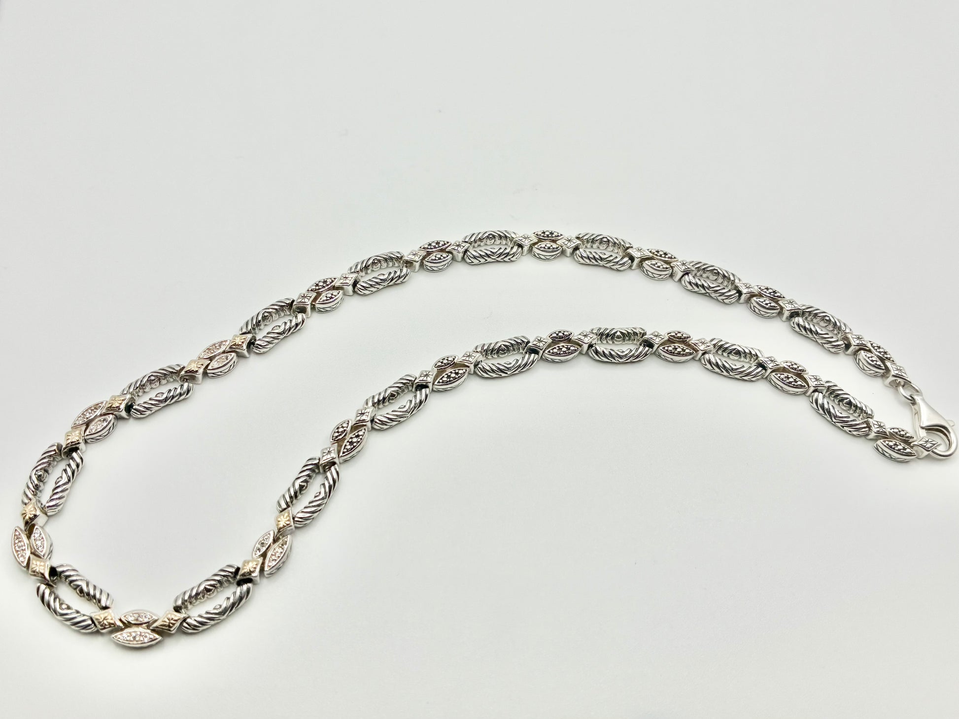 A striking sterling silver and 14K yellow gold station necklace featuring alternating rope-motif oval links and marquise stations. Sparkling pavé-set cubic zirconia add brightness throughout, finished with an oversized lobster clasp for secure wear.