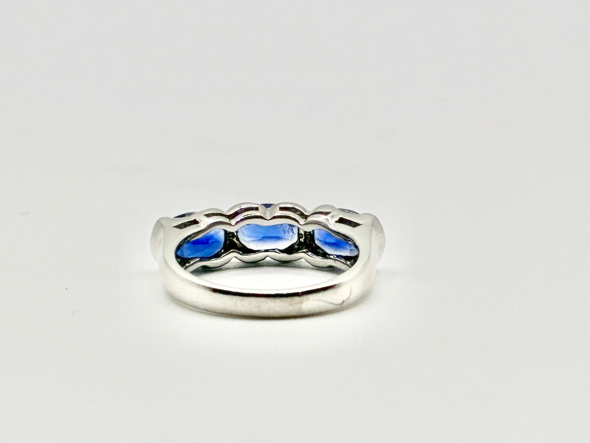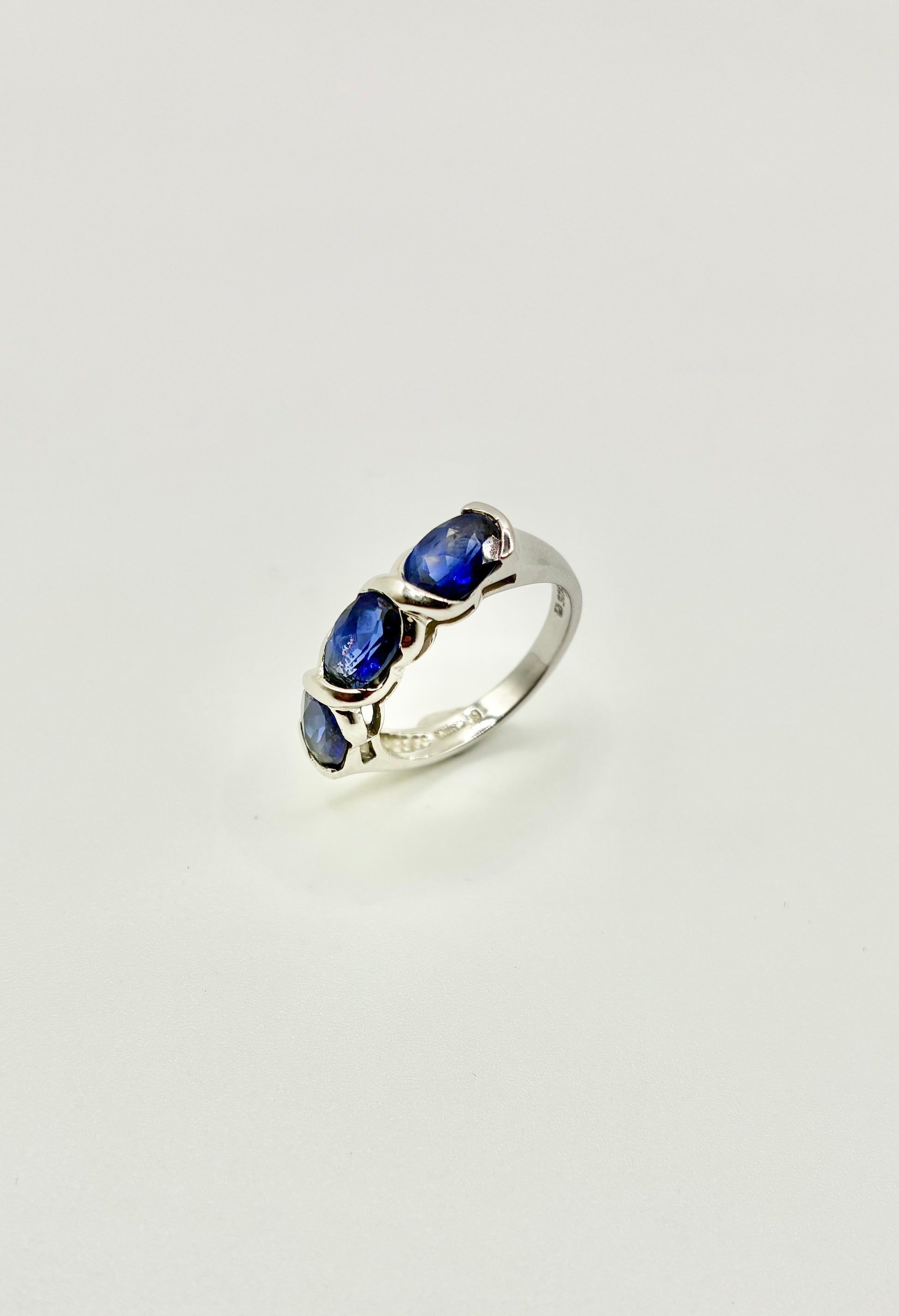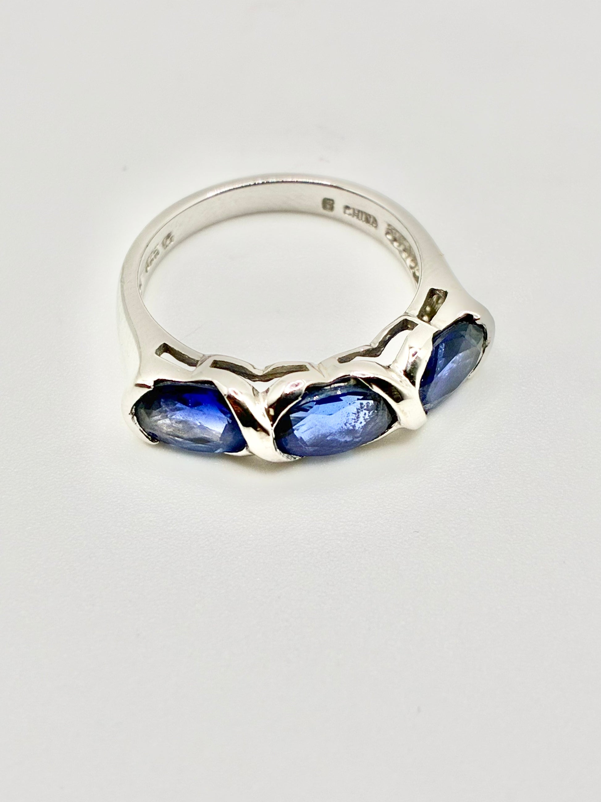 A moody, midnight-blue sparkle with charm. This three-stone ring features oval-cut blue stones nestled in sculptural, hand-wrought silver-tone settings on a comfortable band. The low profile makes it easy for everyday wear while still delivering rich color and presence.