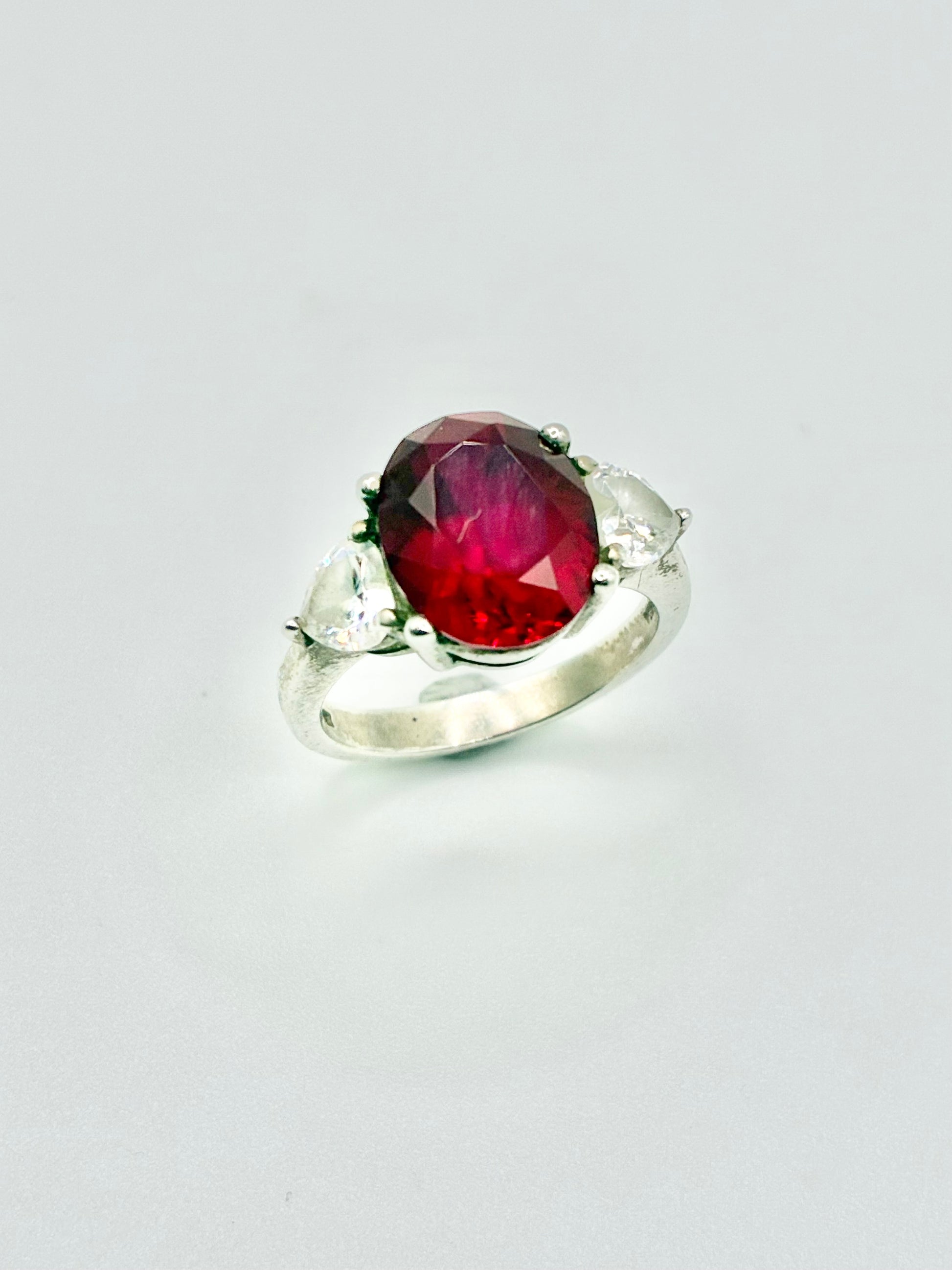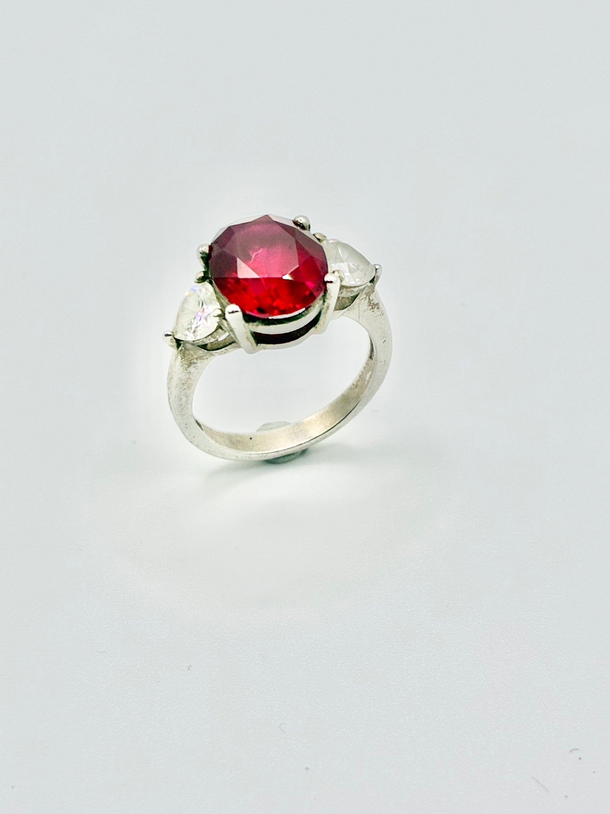 Stones: Oval red faceted center with white heart-shaped side stones (not gem-lab tested)